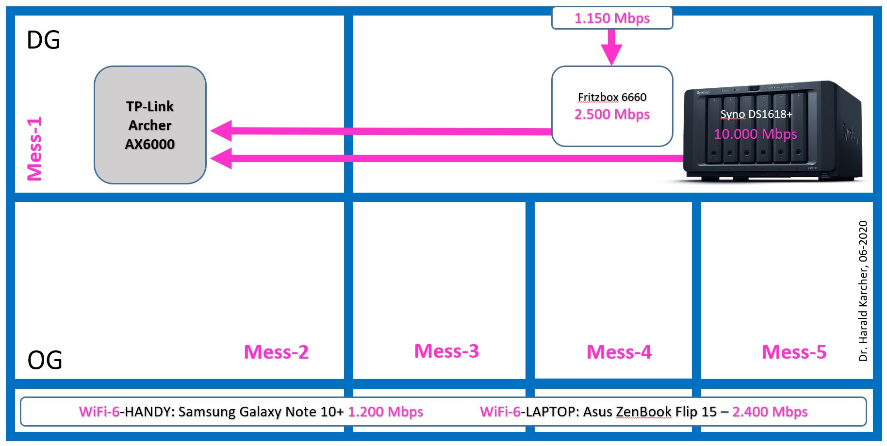 Wie bei allen WLAN-Tests verbinden wir den TP-Link Archer AX6000 mit einer AVM FRITZ!Box 6660 für den Internetzugang. Die Testdateien liegen auf einem NAS, das an einem der LAN-Ports sitzt. Die erste Messreihe absolvieren wir mit unserem derzeit schnellsten WLAN-Laptop mit Intel AX201 Funkmodul. Das Gerät funkt maximal 2×1200 MBit/s Wifi-6 = 2400 MBit/s aus zwei WLAN-Antennen, kann aber auf die älteren WLAN-Gattungen zurückschalten. Wir messen den echten Netto-Durchsatz mit 50 GByte-großen Dateien von der NAS über den Router bis auf den Laptop an den fünf Messpunkten unserer Testwohnung.