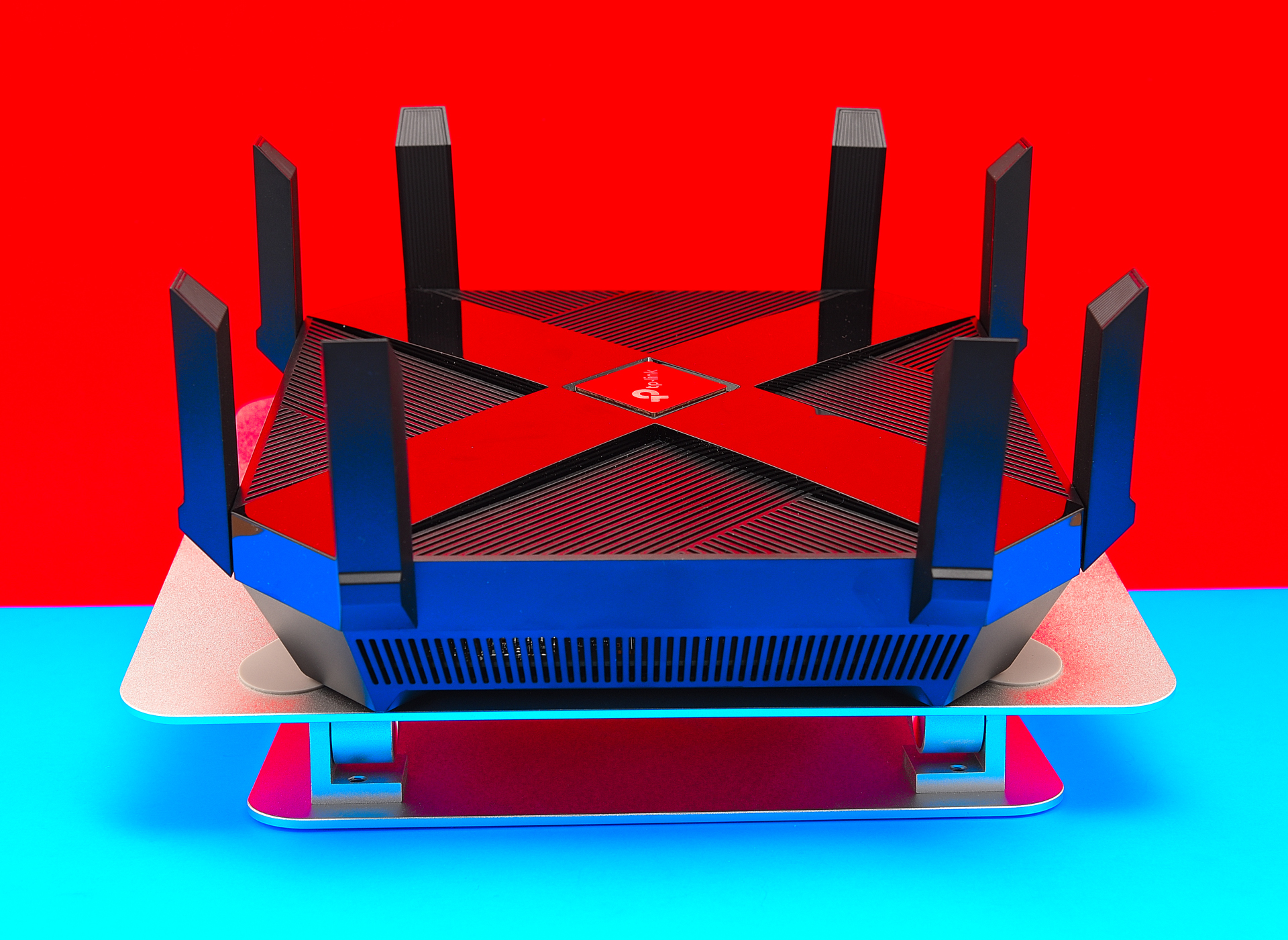 Das Gehäuse des TP-Link Archer AX6000 wirkt schwer, schwarz und wuchtig. Das Design signalisiert massig WLAN-Power und das wird durch acht externe WLAN-Antennen noch verstärkt. Letztere lassen sich zwar nicht auswechseln, aber herunterklappen: Das ist sinnvoll, wenn man den Router etwa an die Wand hängen will.