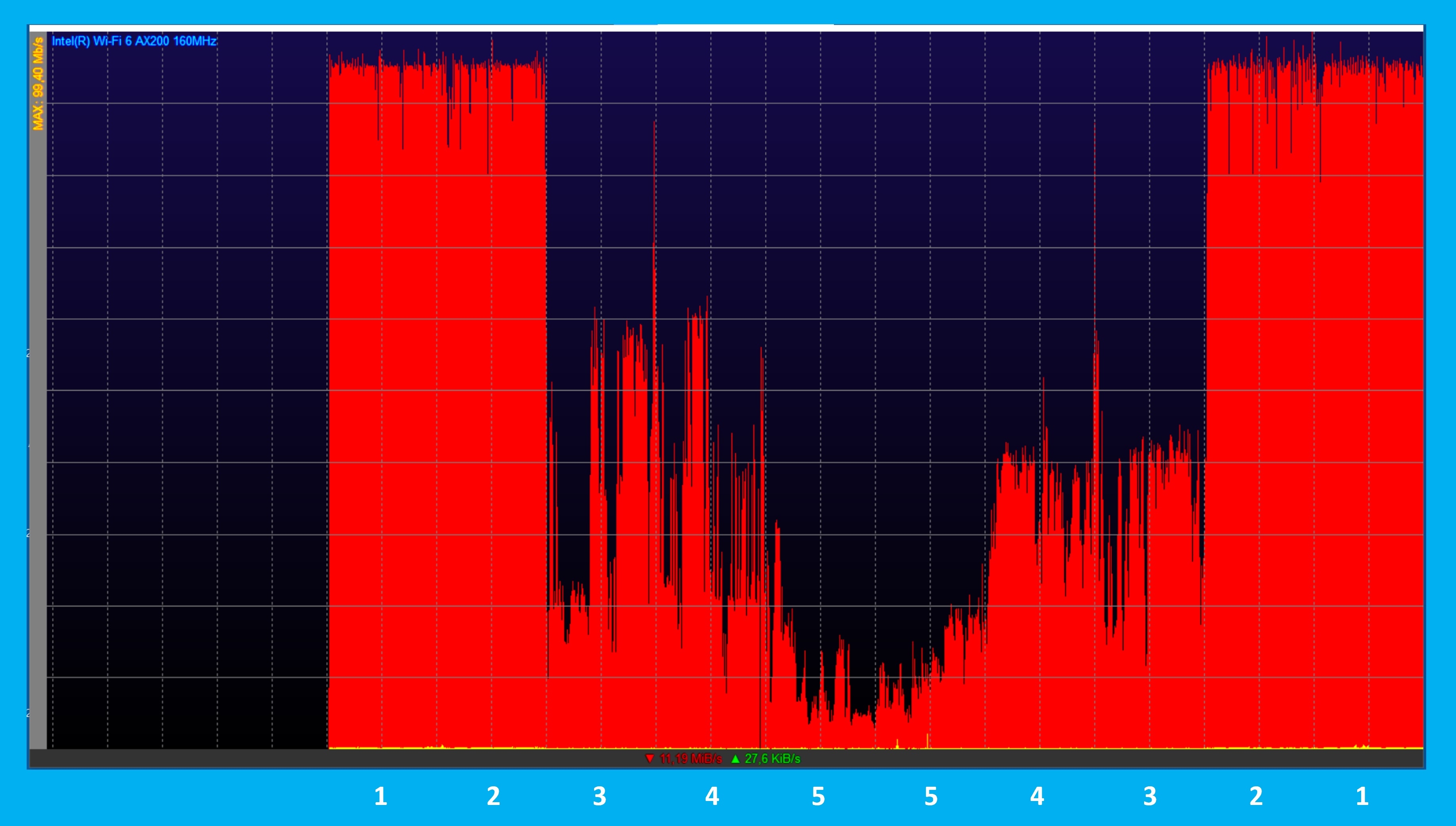 Der Speed-Einbruch in den entfernteren Räumen 3 bis 5 war noch drastischer als zuvor in der Download-Richtung. Der Nettodurchsatz ging mehrmals komplett auf 0 MBit/s herunter, hat sich dann aber immer wieder schnell auf Werte zwischen circa 4 und 40 MBit/s erholt.