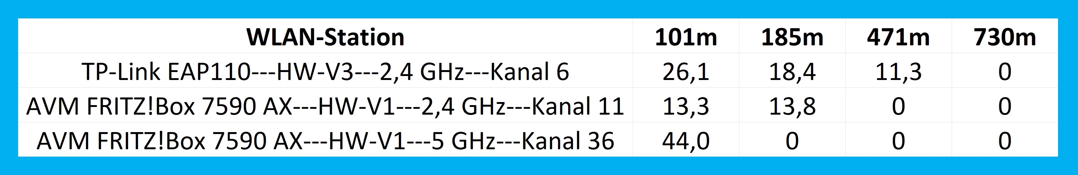 Genauer gesagt um das Rate-over-Range-Verhalten des EAP110 im Indoor-Bereich. Wir machen den Messrundgang mit einem Wifi-6-Laptop, der mit einem Intel AX200 Funkmodul bestückt ist. Im 5 GHz Band messen wir nicht, weil der TP-Link EAP110 dieses Band gar nicht bedient. Wir messen also nur im mäßig verschmutzten 2,4 GHz Band unserer gewohnten Testumgebung.
