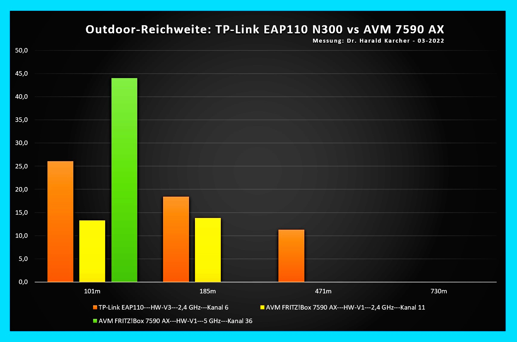 Im Outdoor-Einsatz war seine Reichweite bei freier Sicht zwischen EAP110 und WiFi-6-Handy recht ordentlich: bei 470 Metern kamen im Schnitt noch 10 MBit/s Netto-Durchsatz. Allerdings mit hohen Latenzen.