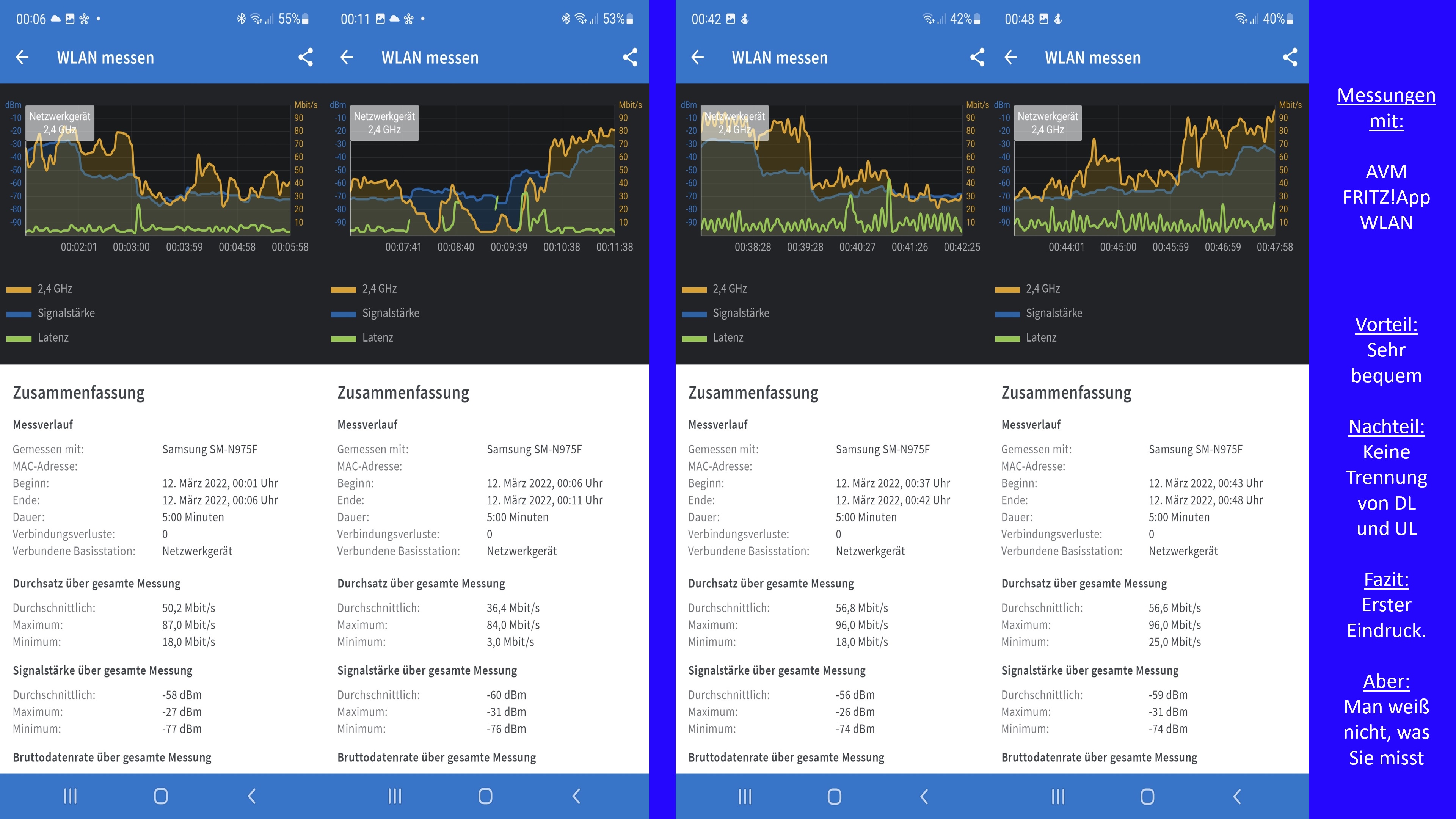 Die Kurven wurden mit einer AVM FRITZ!App WLAN auf dem Wifi-6-Handy aufgezeichnet. Diese App gibt es kostenlos für Smartphones mit Google und mit Apple Handy Betriebssystemen.