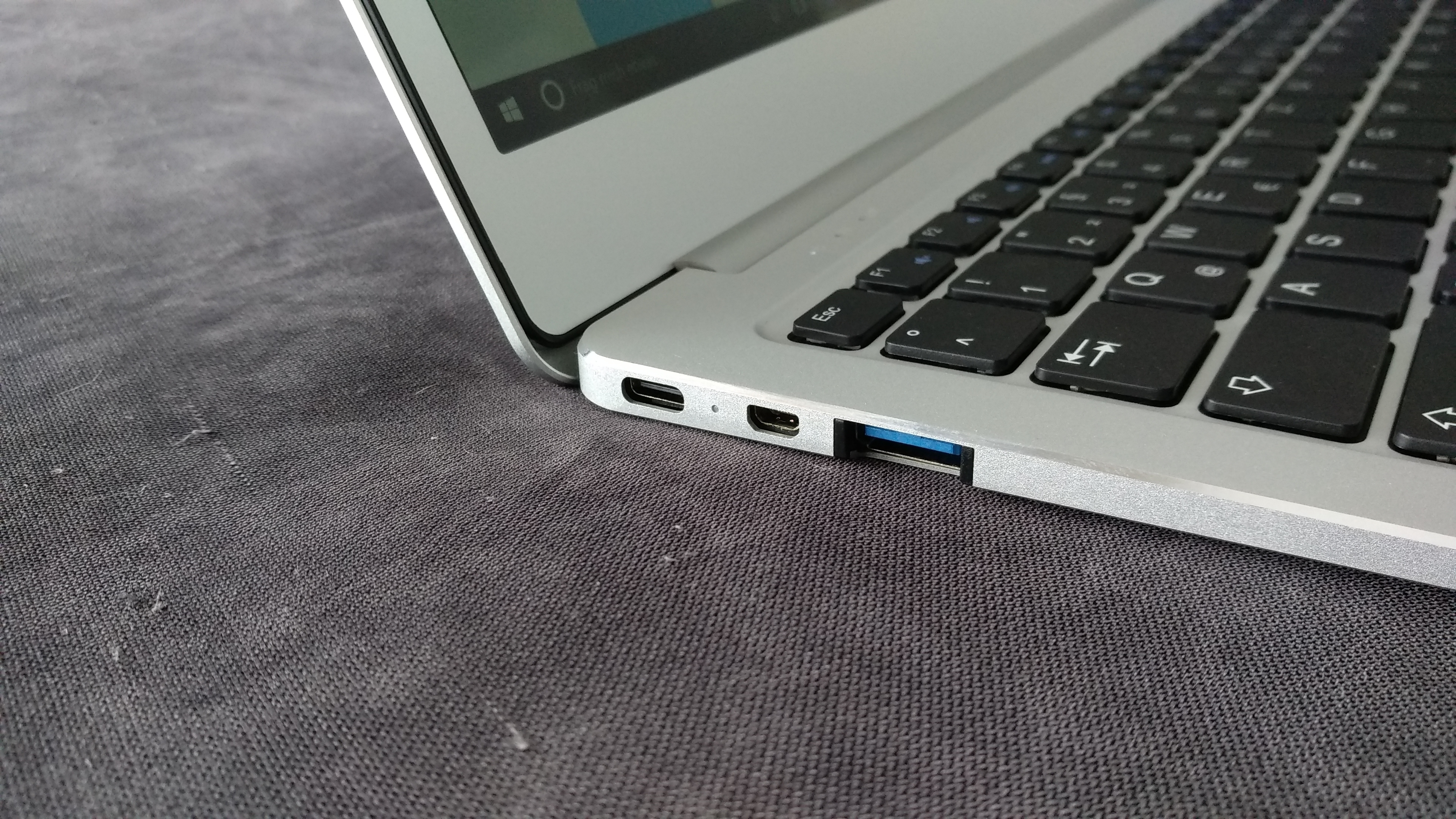 Links sitzen ein USB-Typ-C-Anschluss, ein Micro-HDMI-Ausgang und ein USB-3.1-Port. Zum Aufladen kommt leider nicht USB-C zum Einsatz, dafür gibt es ein Netzteil mit proprietärem Stecker, das auf der rechten Seite eingestöpselt wird. Links vom Anschluss für das Netzteil finden sich ein microSD-Kartenslot, ein weiterer USB-3.1-Anschluss und außerdem noch ein Kopfhörerausgang.