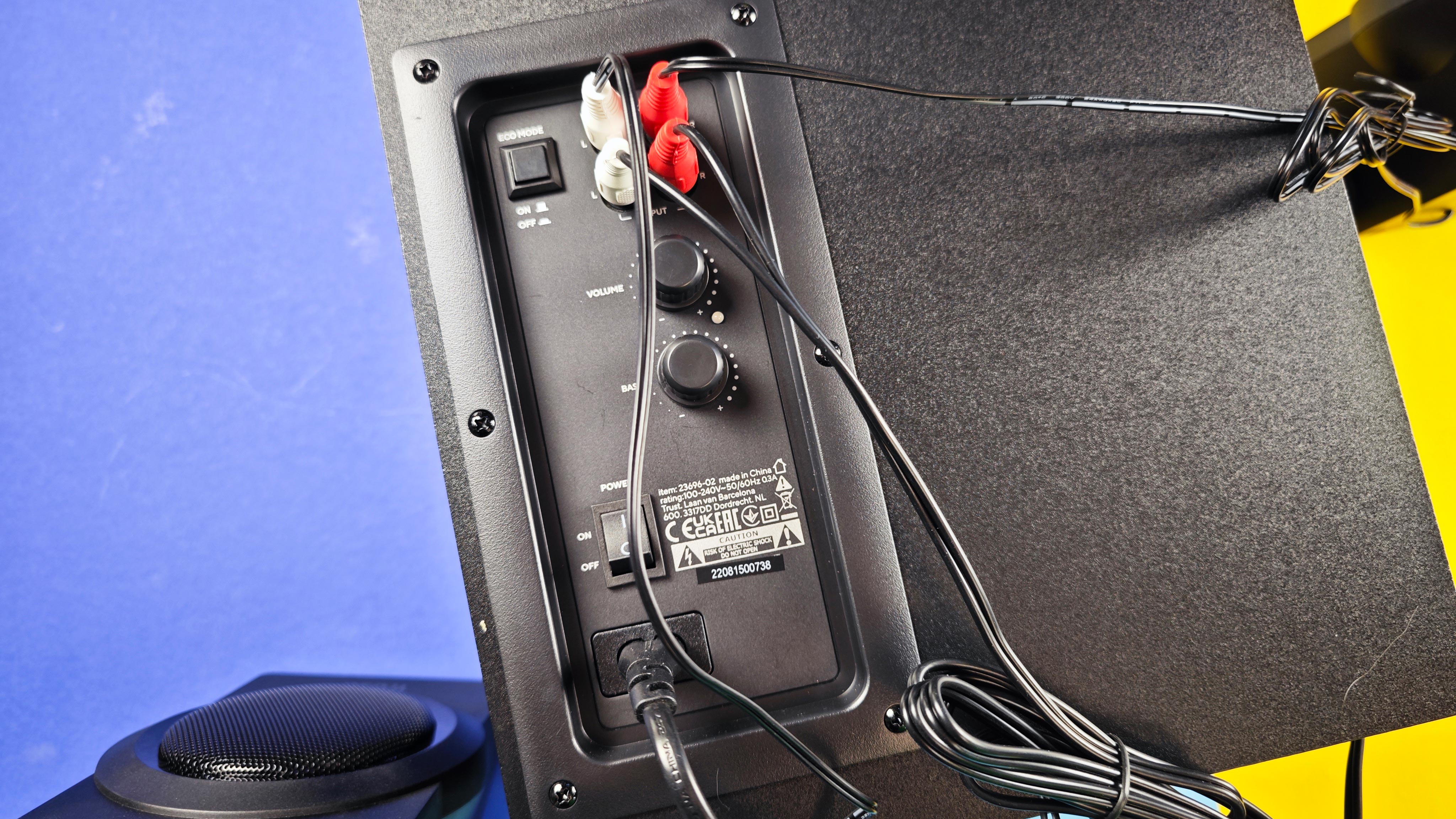 Das günstige System von Trust ist einfach aufgebaut. Die beiden Lautsprecher sind mit einem festen Kabel versehen, das sich nicht tauschen lässt, aber mit rund einem Meter Länge ausreichend lang für eine ordentliche Aufstellung ist. Die beiden Gehäuse bestehen zwar aus Kunststoff, jede Box ist mit rund 350 Gramm aber etwas schwerer als erwartet. Der Subwoofer, an den die beiden Lautsprecher per Cinch-Kabel angeschlossen werden, ist hingegen aus Holz gefertigt.