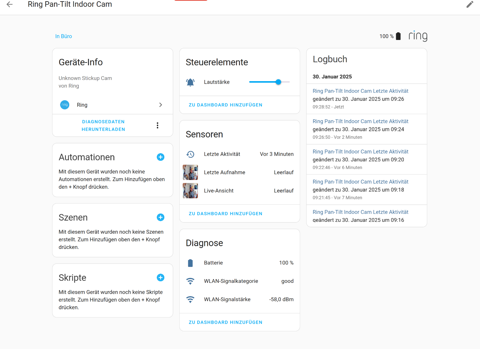 Unter Home Assistant gibt es zwar eine Integration für Ring-Kameras. Doch anders als bei der Indoor Cam 2. Gen. wird bei der Pan-Tilt Indoor Cam eine Erkennung von Personen nicht als Auslöser unterstützt. Auch der Zugriff auf die Sirene ist nicht möglich.