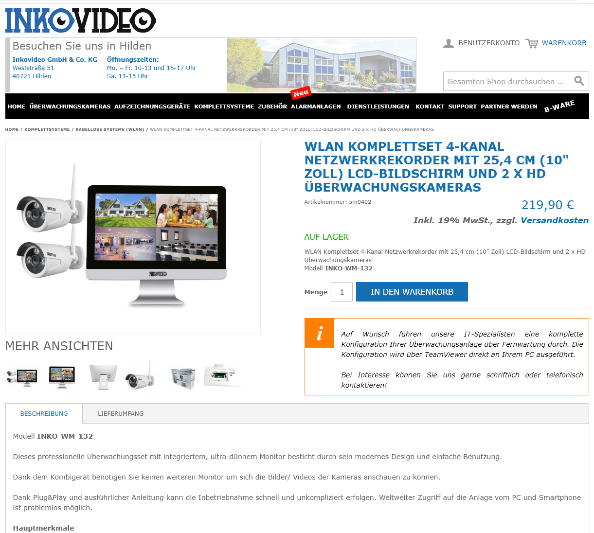 Kurios: Im Inkovideo-Webshop sind zwar 99 verschiedene Überwachungskameras gelistet, aber die mit dem getesteten Set gelieferten Inko-M13-Kameras kann man dort nicht einzeln nachkaufen. Wer vier Kameras braucht und auf eine einheitliche Optik Wert legt, sollte das Set direkt als INKO-WM-134 für 300 Euro mit vier Kameras kaufen.