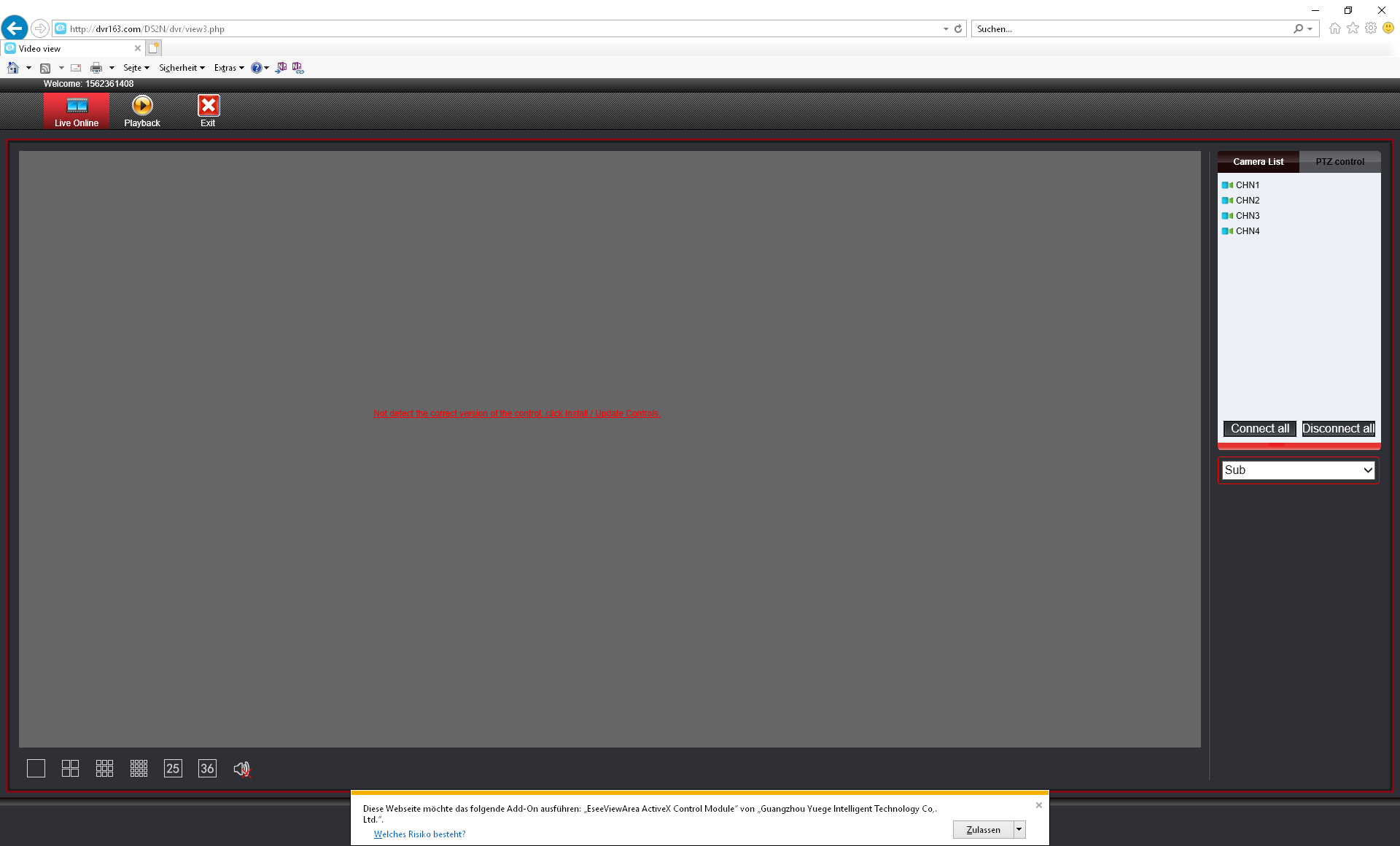 Der Zugriff über das Webportal dvr163.com ist ebenfalls per Default möglich. Als Browser empfiehlt Inkovideo den Internet Explorer, beim ersten Aufrufen der – unverschlüsselten – HTTP-Verbindung muss man sich erst ein Browser-Plugin herunterladen und dann ein ActiveX Control Module. Wir haben beherzt alle Warnmeldungen weggeklickt und alles kritiklos installiert, dann war der Zugriff per Internet eingerichtet.
