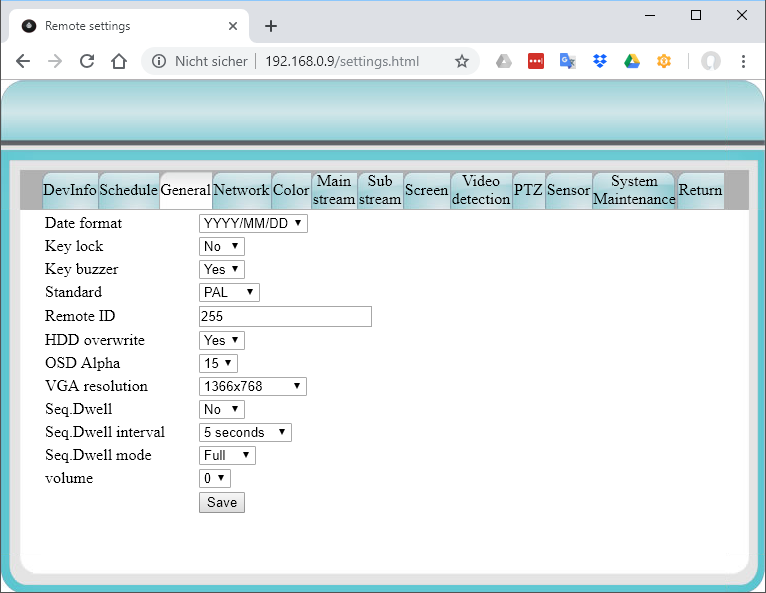 Über die IP-Adresse kann man mit jedem Browser auf den Webserver des Netzwerk-Recorders zugreifen, vorausgesetzt, der Browser unterstützt Flash. Diese Verbindung ist nicht per HTTPS verschlüsselt und steht in der Grundkonfiguration mit dem Benutzernamen admin ohne gesetztes Passwort sperrangelweit offen. Optisch erinnert das Webportal an die ersten Webseiten aus den 1990er Jahren. Man braucht einen großen Monitor, weil die Seite nicht responsiv ist. Wer sich einmal eingeloggt hat, kann alle Videoaufzeichnungen einsehen und herunterladen.