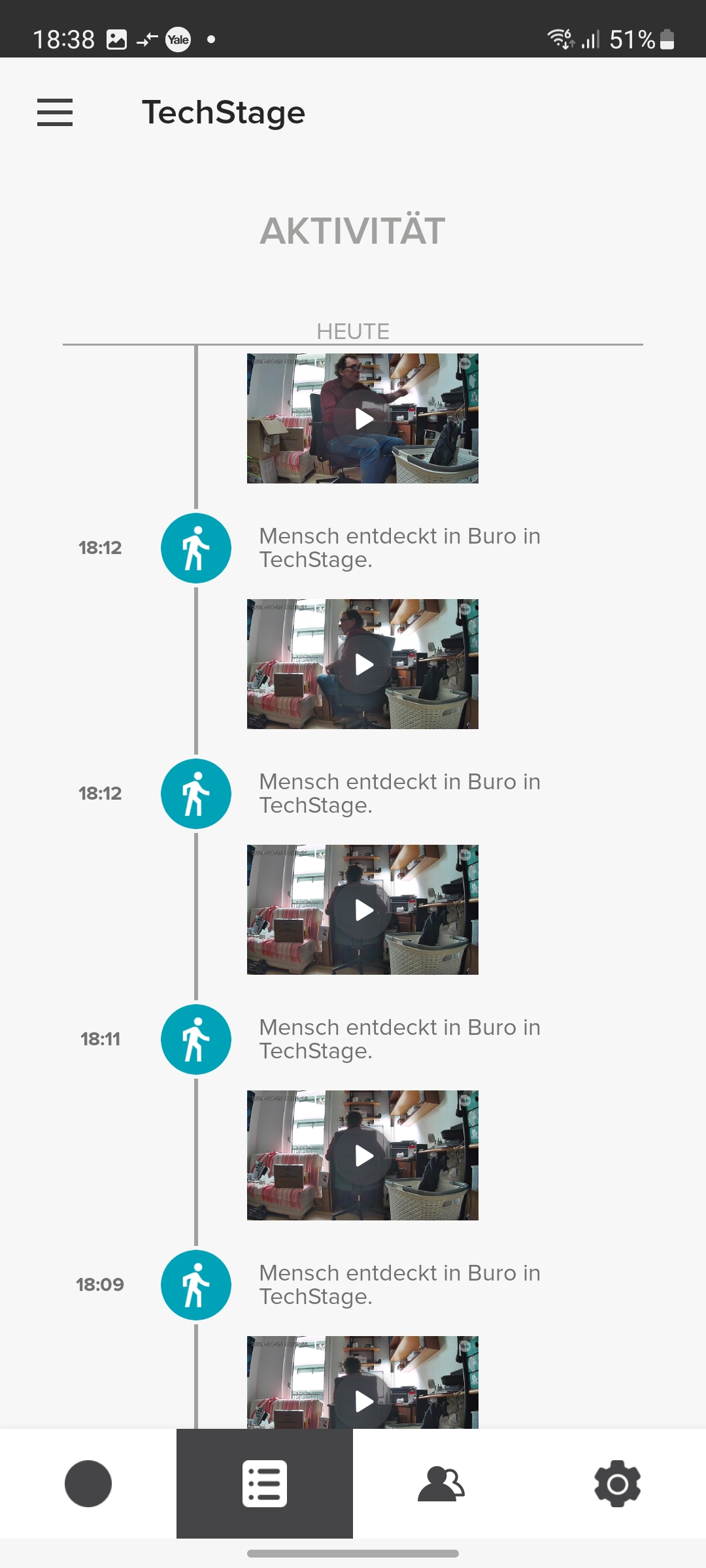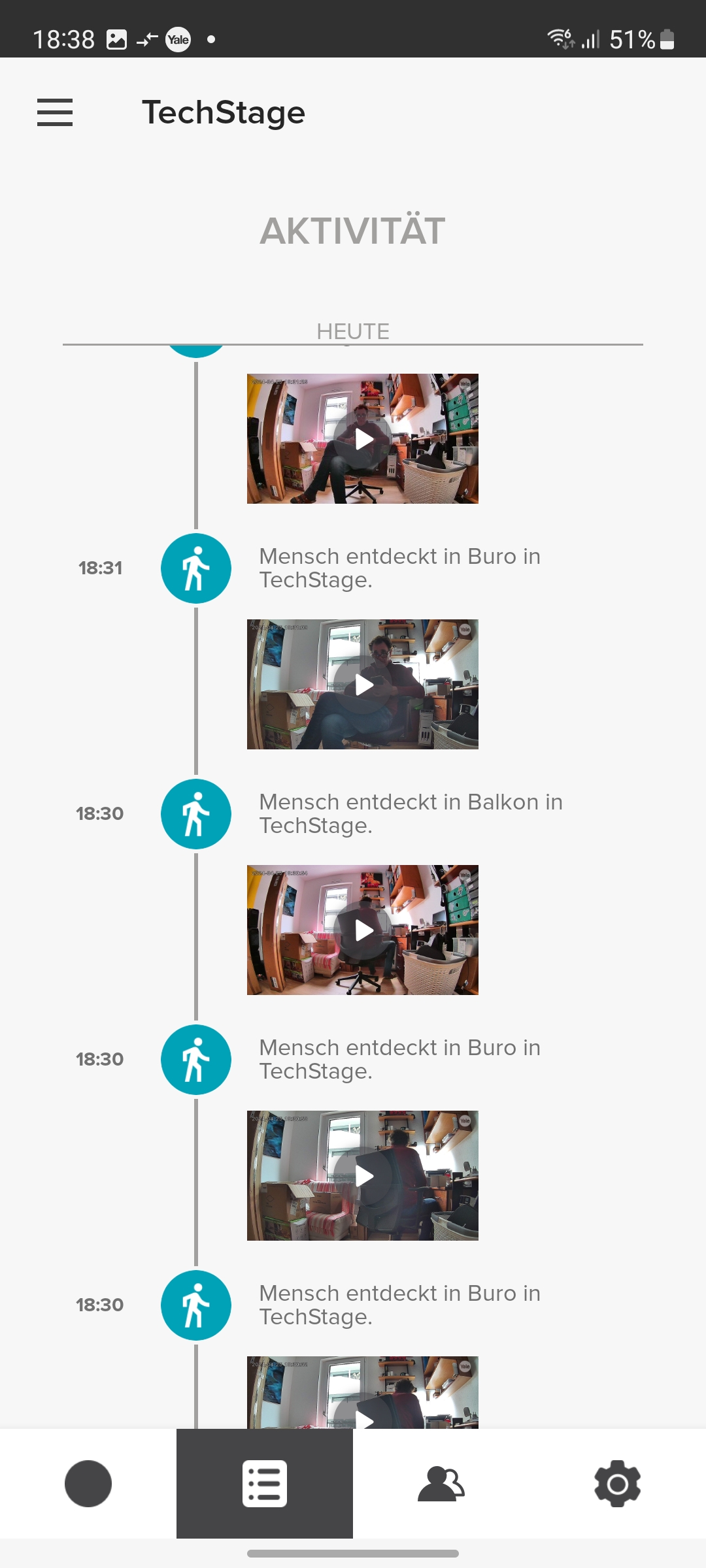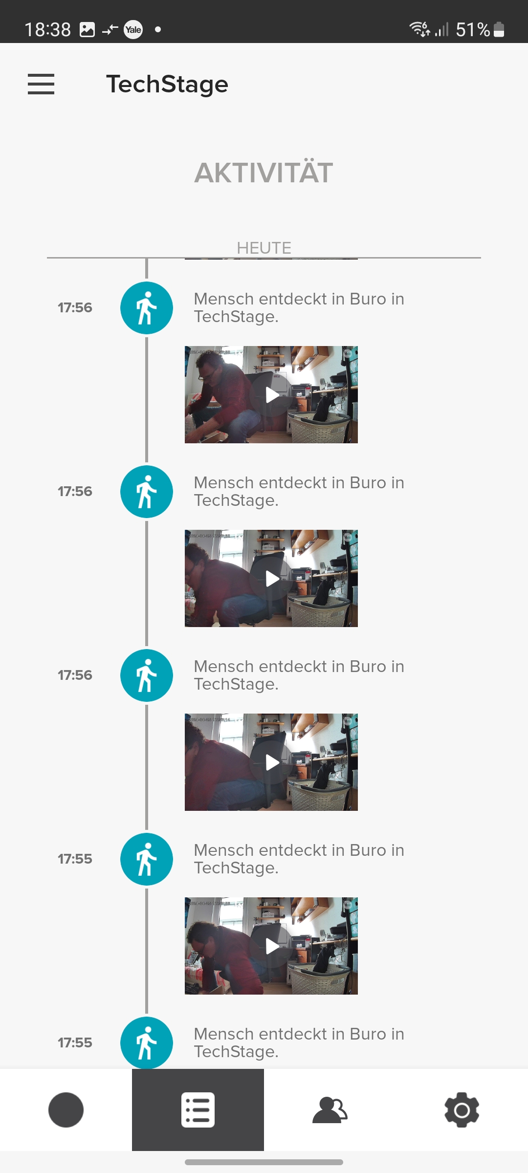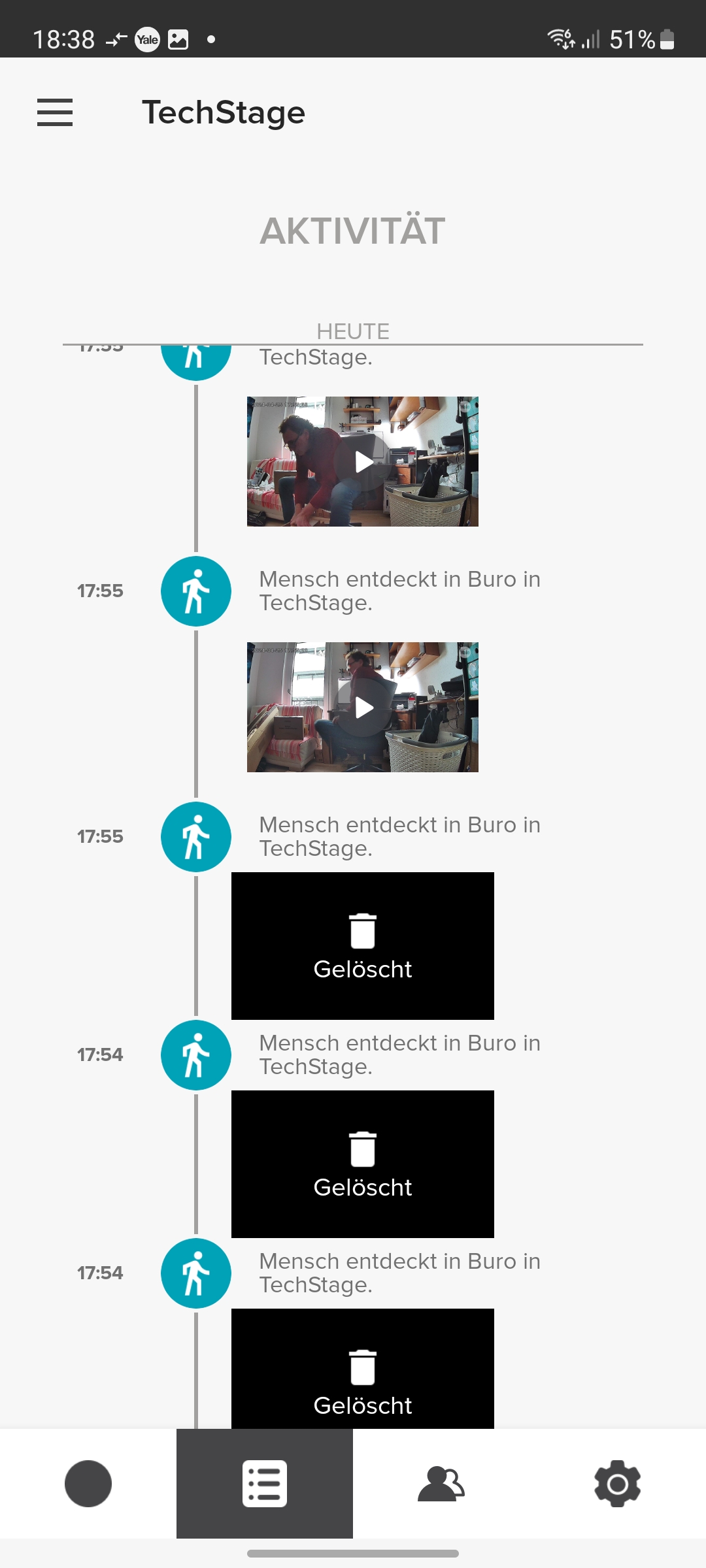 Der integrierte Speicher scheint nicht besonders groß zu sein. Yale konnte uns keine Angaben darüber machen. Doch werden Videos relativ schnell gelöscht, wobei die App dabei nicht chronologisch vorgeht und mit dem ältesten Video beginnt, sondern scheinbar zufällig vorgeht. So zeigt die App noch einige Videos vom ersten Tag der Inbetriebnahme, während jüngere Aufnahmen zum größten Teil gelöscht wurden.
