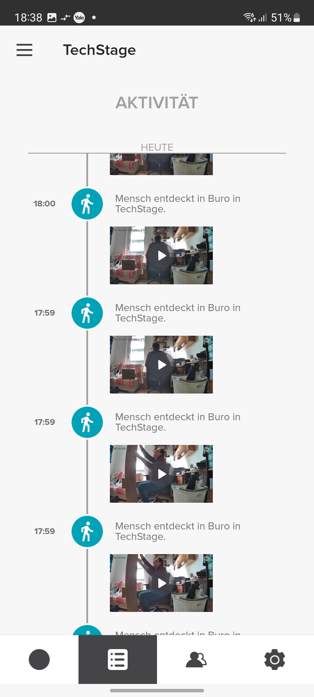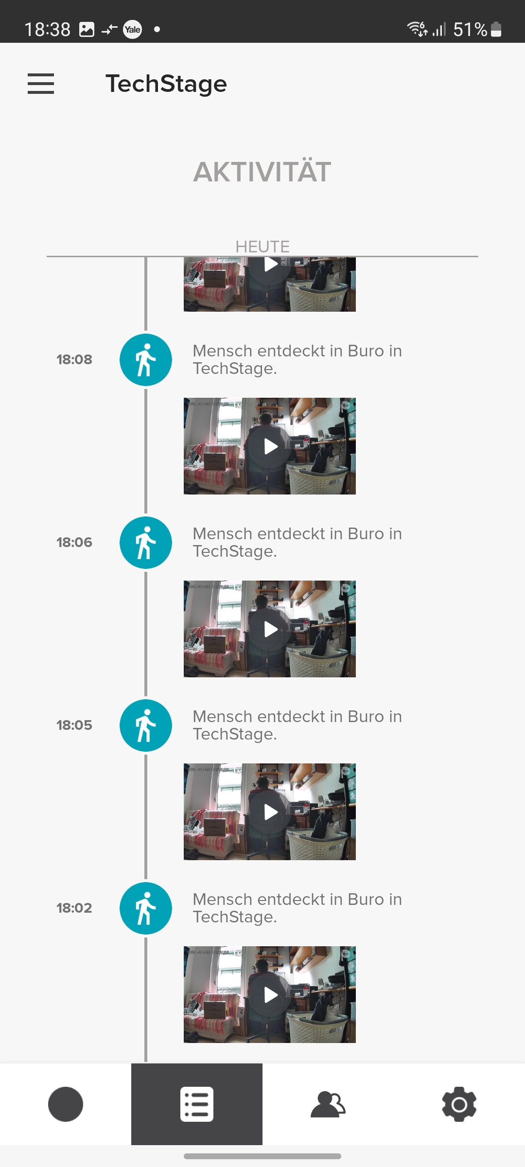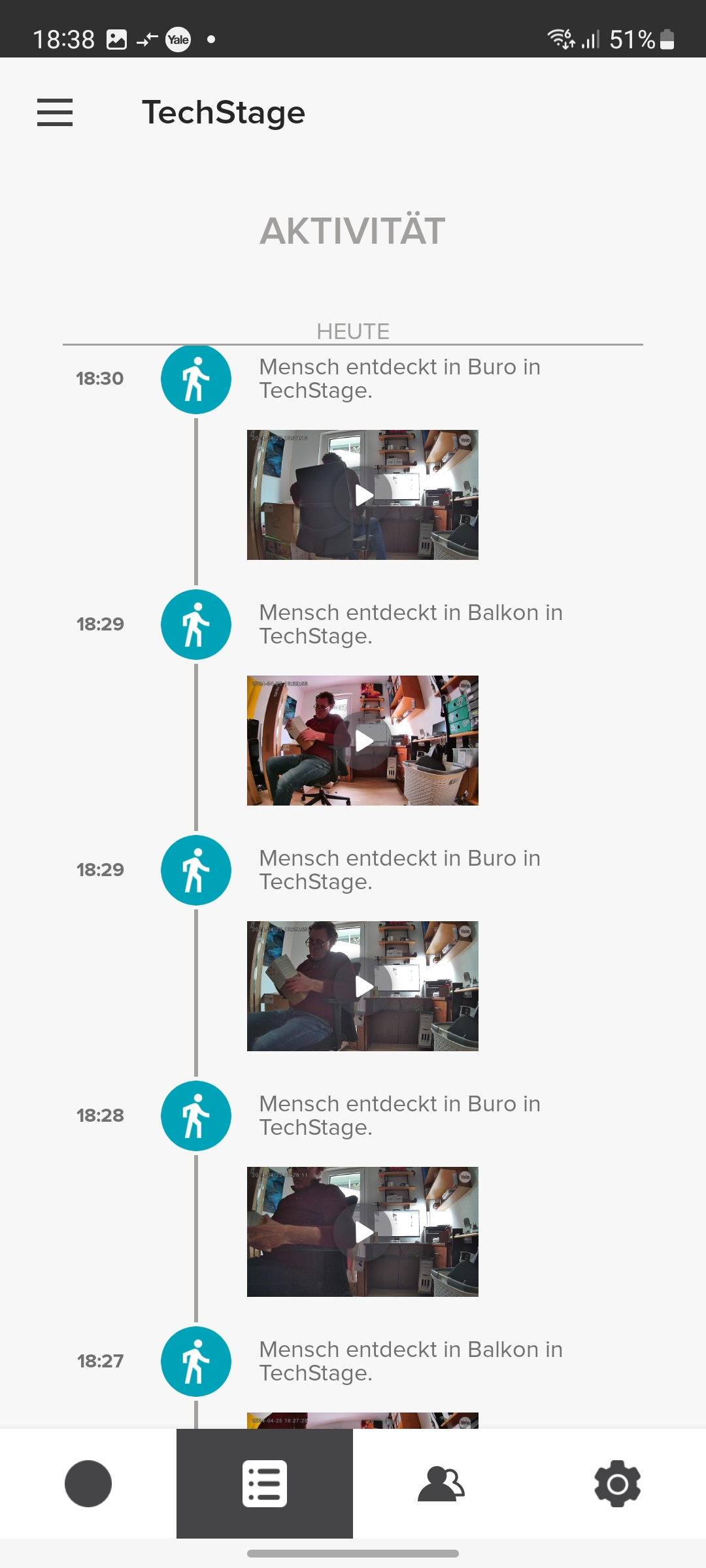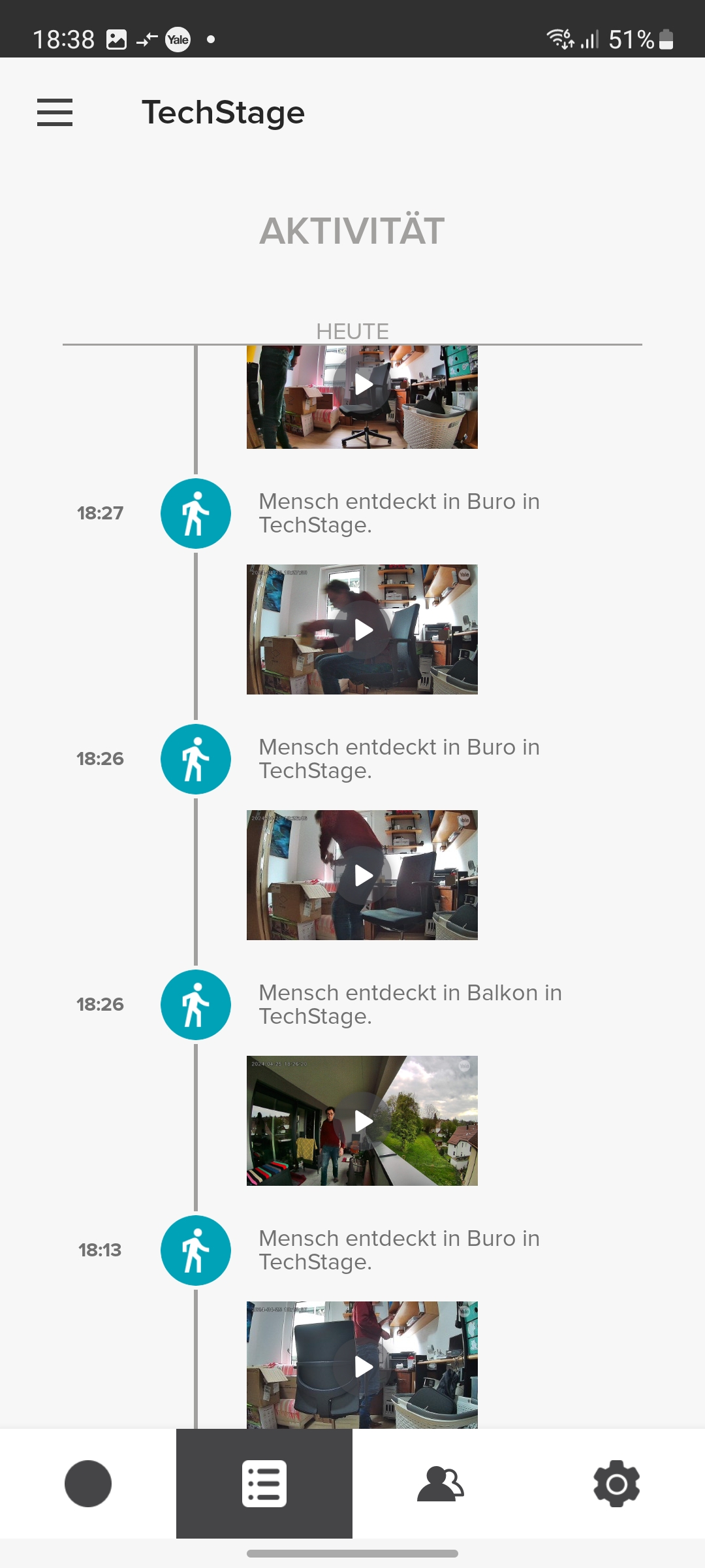 Der integrierte Speicher scheint nicht besonders groß zu sein. Yale konnte uns keine Angaben darüber machen. Doch werden Videos relativ schnell gelöscht, wobei die App dabei nicht chronologisch vorgeht und mit dem ältesten Video beginnt, sondern scheinbar zufällig vorgeht. So zeigt die App noch einige Videos vom ersten Tag der Inbetriebnahme, während jüngere Aufnahmen zum größten Teil gelöscht wurden.