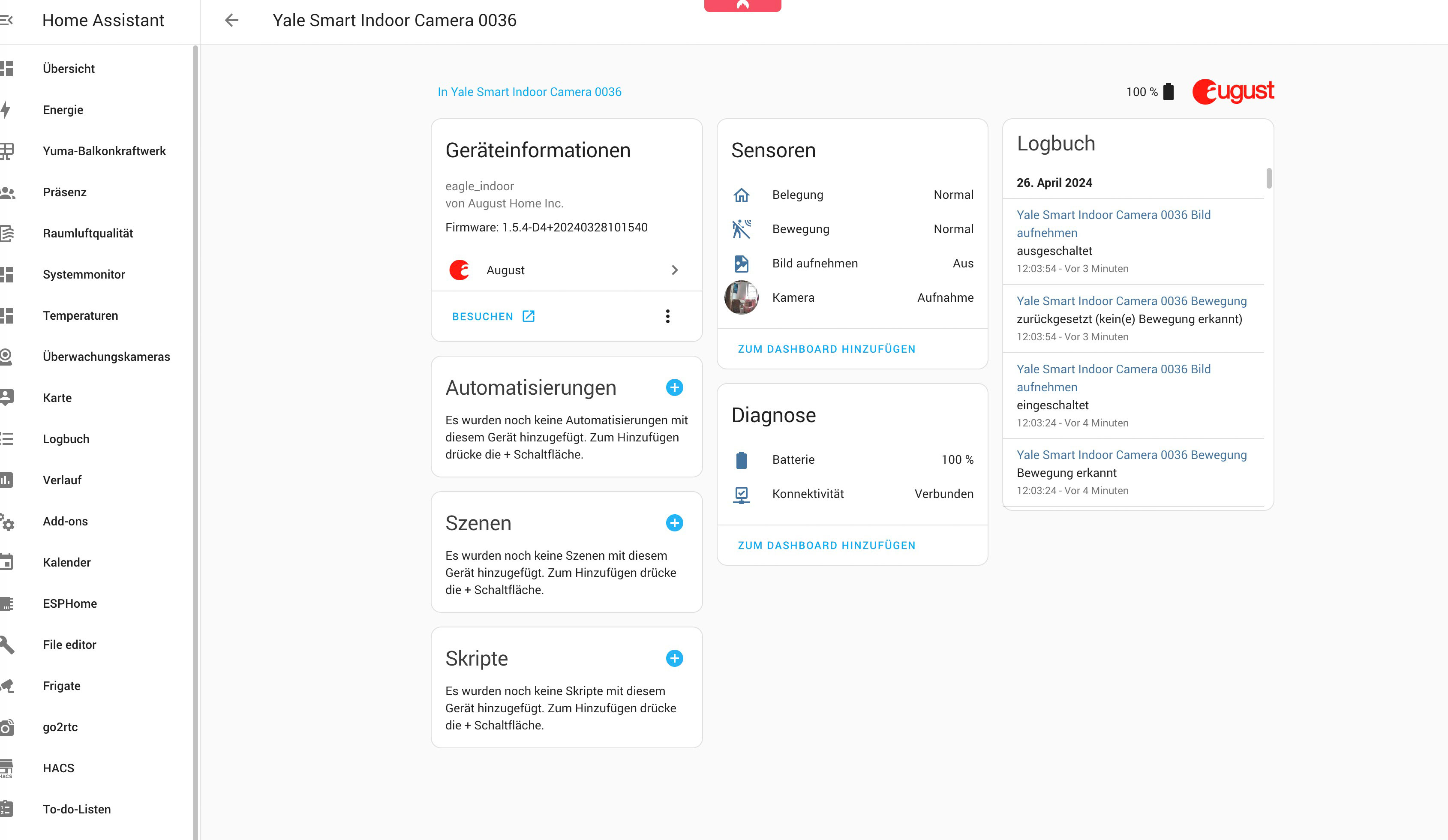 Zwar steht mit der Integration unter Home Assistant (Testbericht) kein Livestream unter zur Verfügung, doch das letzte Bild einer Bewegungserkennung wird angezeigt. Und den Bewegungssensor der Kamera kann man für Automatisierungen, etwa zum Aufbau einer umfassenden Alarmanlage, verwenden.