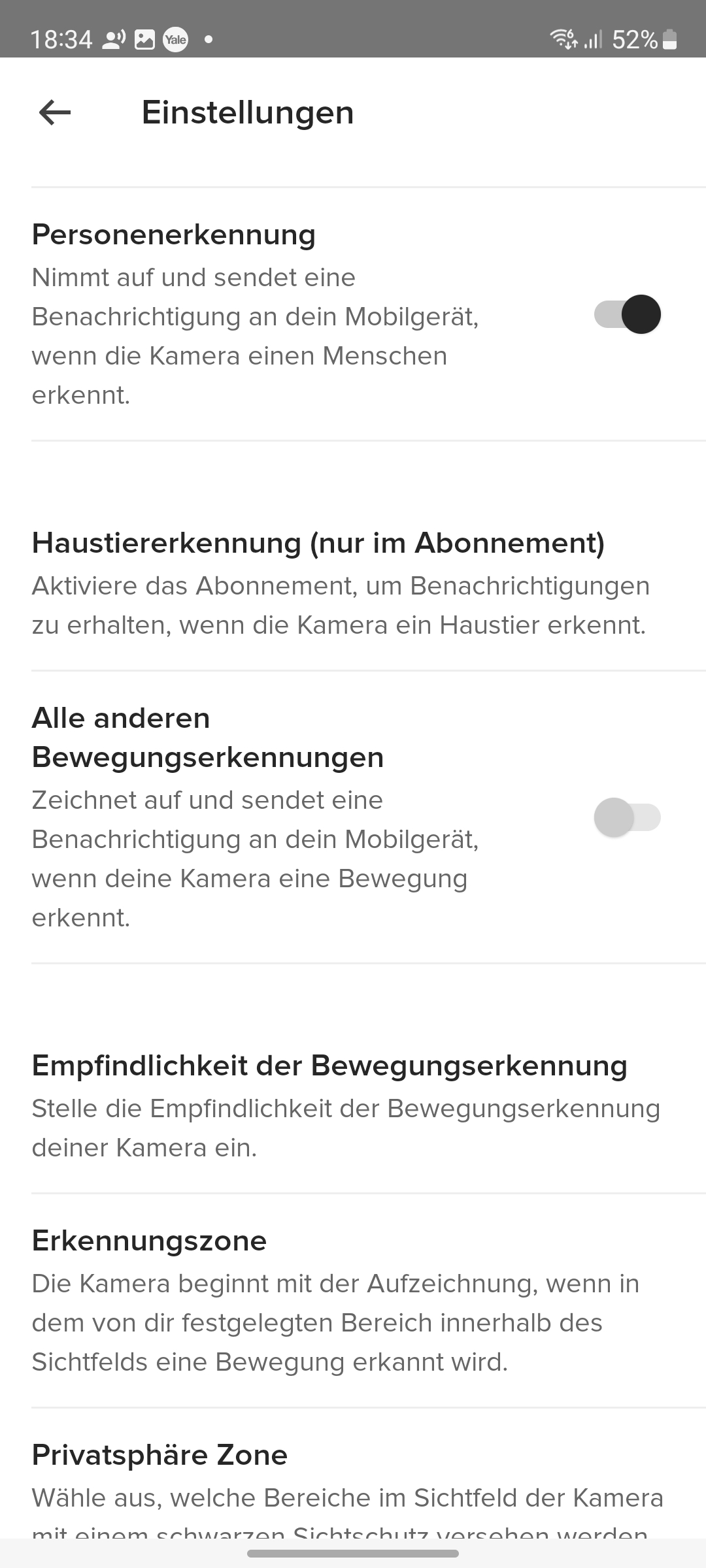 Die Bewegungserkennung kann man auf Personen eingrenzen, sodass es im Test zu keinen Fehlalarmen durch andere bewegliche Objekte wie einer Hauskatze kommt. Das dürfte für die meisten Anwender ausreichen. Wer darüber hinaus Wert auf Tiererkennung legt, muss zum kostenpflichtigen Abo greifen. Sollte es dennoch zu Fehlalarmen kommen, können Anwender unter Einstellungen die Empfindlichkeit der Bewegungserkennung justieren und eine Erkennungszone definieren. Für einen DSGVO-konformen Betrieb kann man unter Privatsphäre Zone genaue Bildbereiche konfigurieren, die bei der Aufnahme automatisch geschwärzt werden. Das ist etwa erforderlich, wenn die Überwachungskamera auf ein fremdes Grundstück oder öffentlichen Bereich ausgerichtet ist. Das dürfte aber bei einer Überwachungskamera für den Innenbereich nur selten vorkommen.