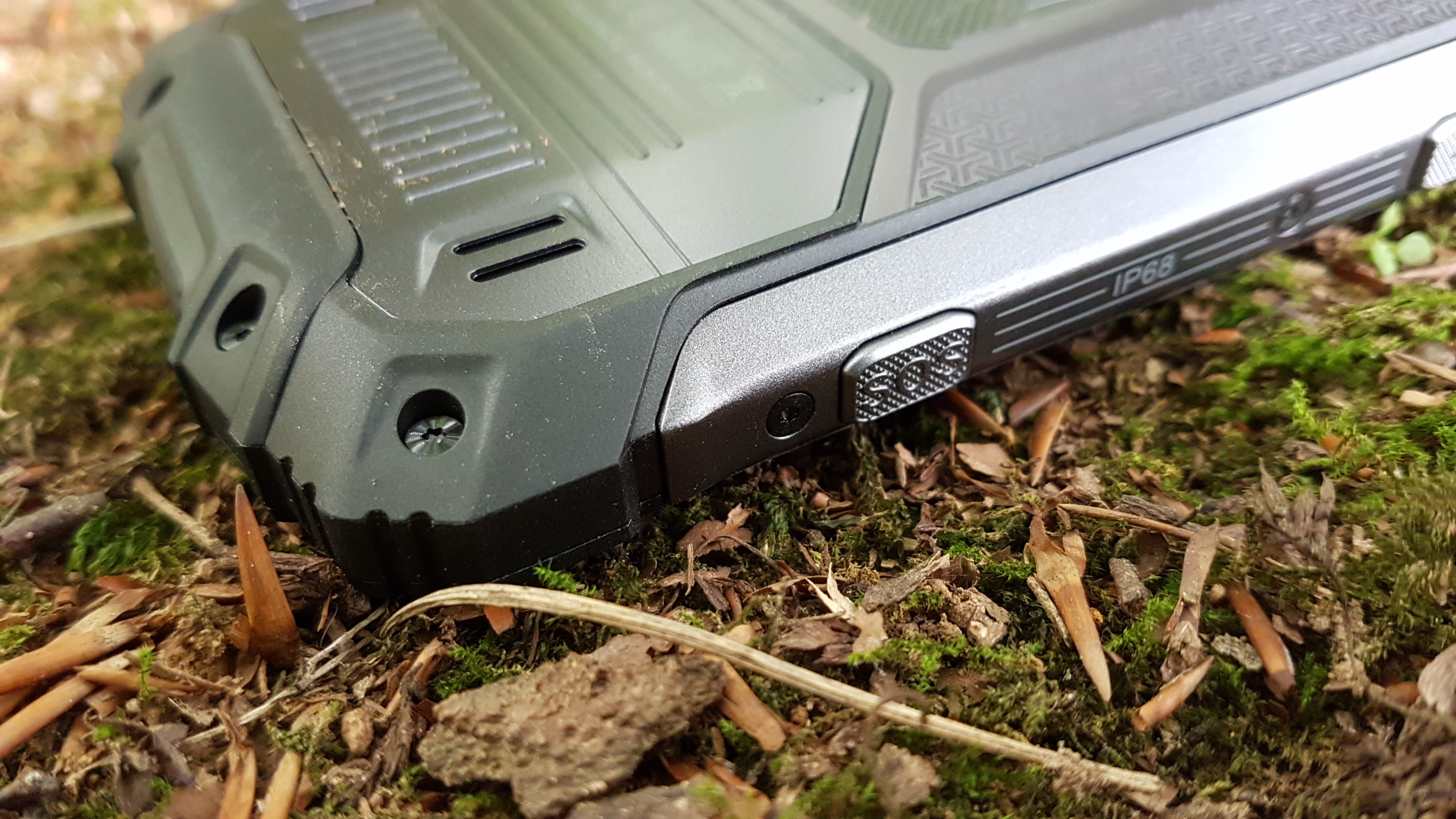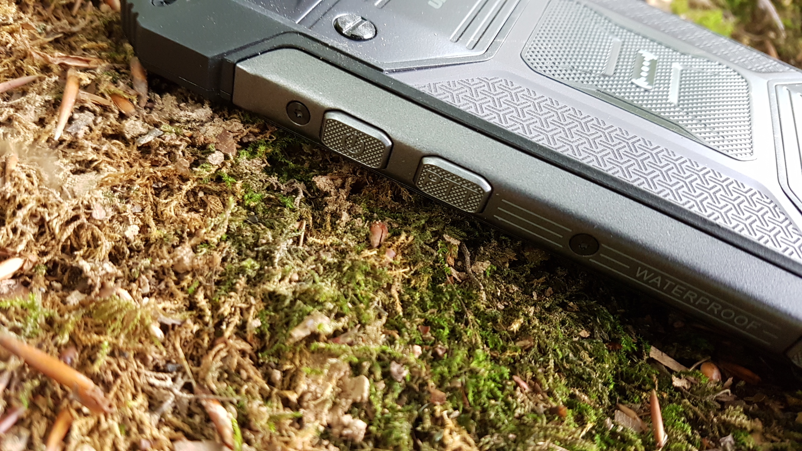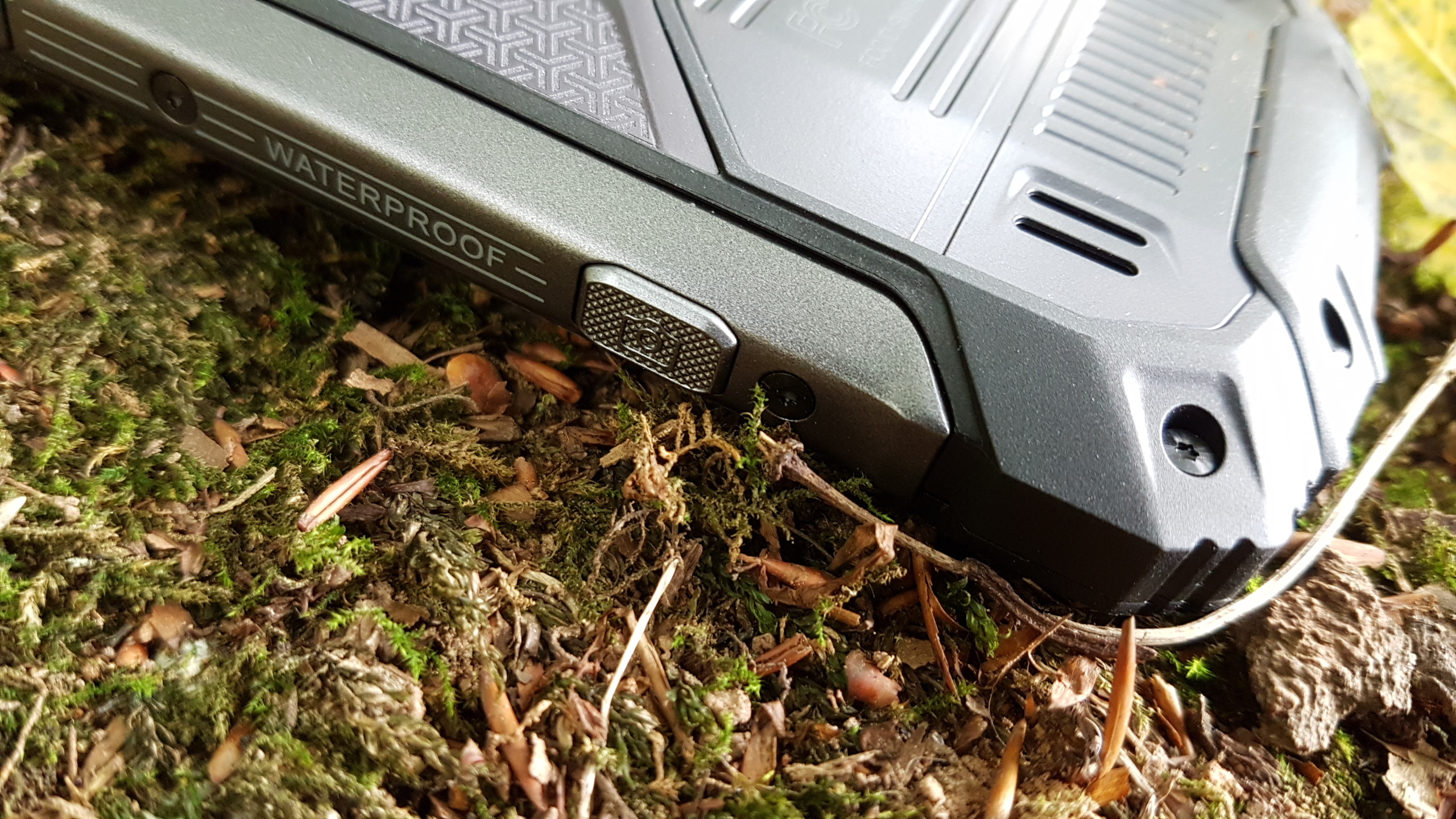 Auf beiden Seiten befinden sich jeweils drei mechanische Taster. Links Knöpfe zur Lautstärkeregelung und ein SOS-Taster zum Anrufen einer gewünschten Notfallnummer, rechts der Power-Button, ein Walkie-Talkie-Knopf und eine Taste zum Starten der Kamera. Der USB-Typ-C-Anschluss unten verbirgt sich hinter einer Schutzabdeckung. Einen Kopfhörer-Eingang hat das Handy nicht, im Lieferumfang befindet sich ein Adapter zum Anschluss an den USB-Slot.