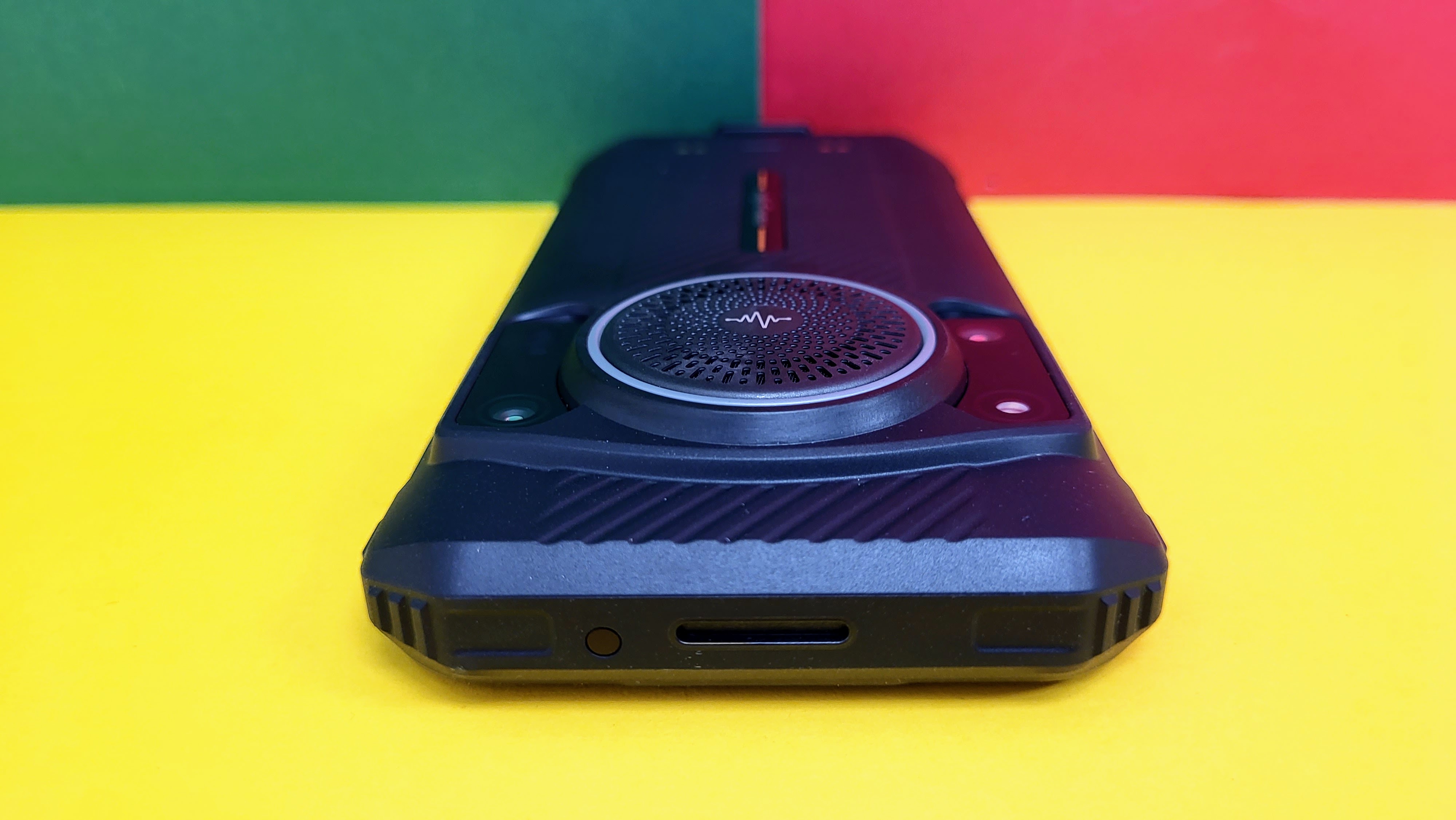 Markantestes Element ist der mittig angeordnete Lautsprecher auf der Rückseite, der von einem ringförmigen RGB-Licht umgeben ist. Jeweils links und rechts neben dem Lautsprecher befinden sich die beiden Kameralinsen sowie der LED-Blitz und zwei IR-Leuchten. Optisch erinnert es uns damit etwas an das AGM H5 Pro (Testbericht) oder AGM G2 Guardian (Testbericht).