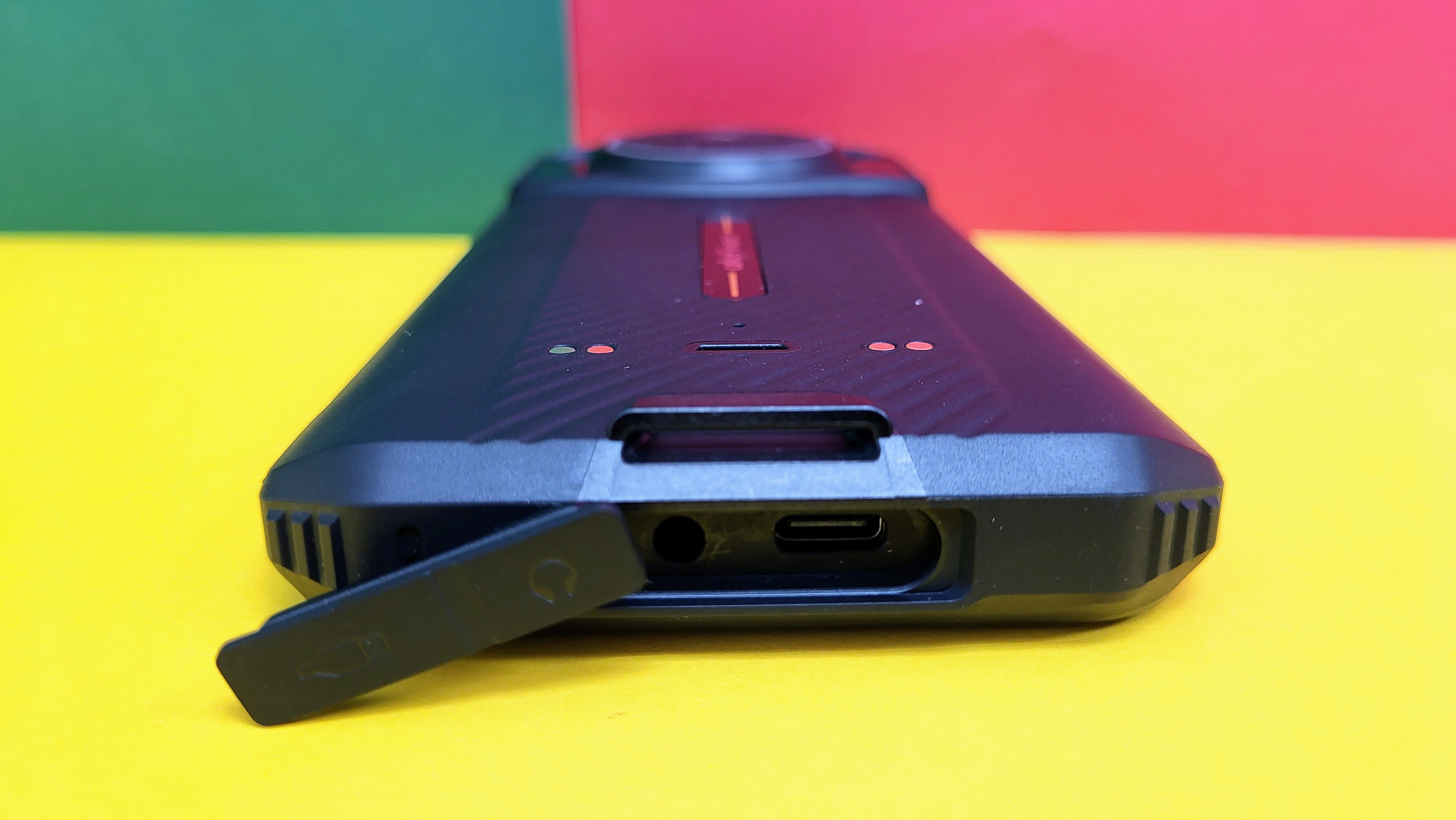 Das Mobilgerät ist angedeutet sechseckig gestaltet, die Ecken sind jeweils besonders stark von Gummi geschützt. Unten befinden sich Anschlüsse für USB-C sowie eine Klinke mit 3,5 mm, die von einem Gummipfropfen vor Staub und Wasser geschützt werden. Unten befindet sich zudem eine Befestigungsmöglichkeit für ein Lanyard, das auch zum Lieferumfang gehört. Der Rand um das Display fällt aus Gründen der Stabilität recht breit aus. Die Frontkamera ragt mit einer Waterdrop-Notch in den Bildschirm hinein.