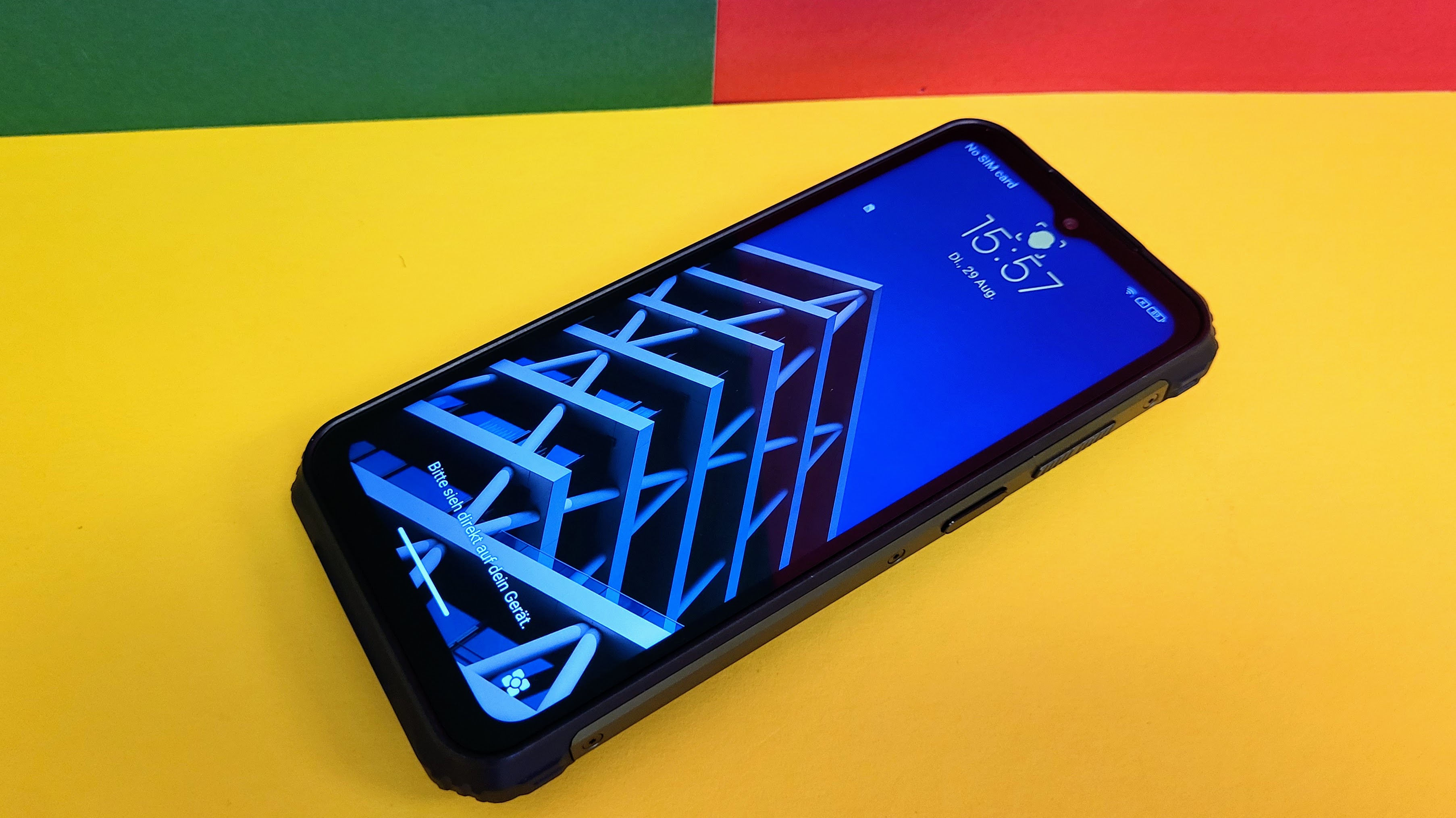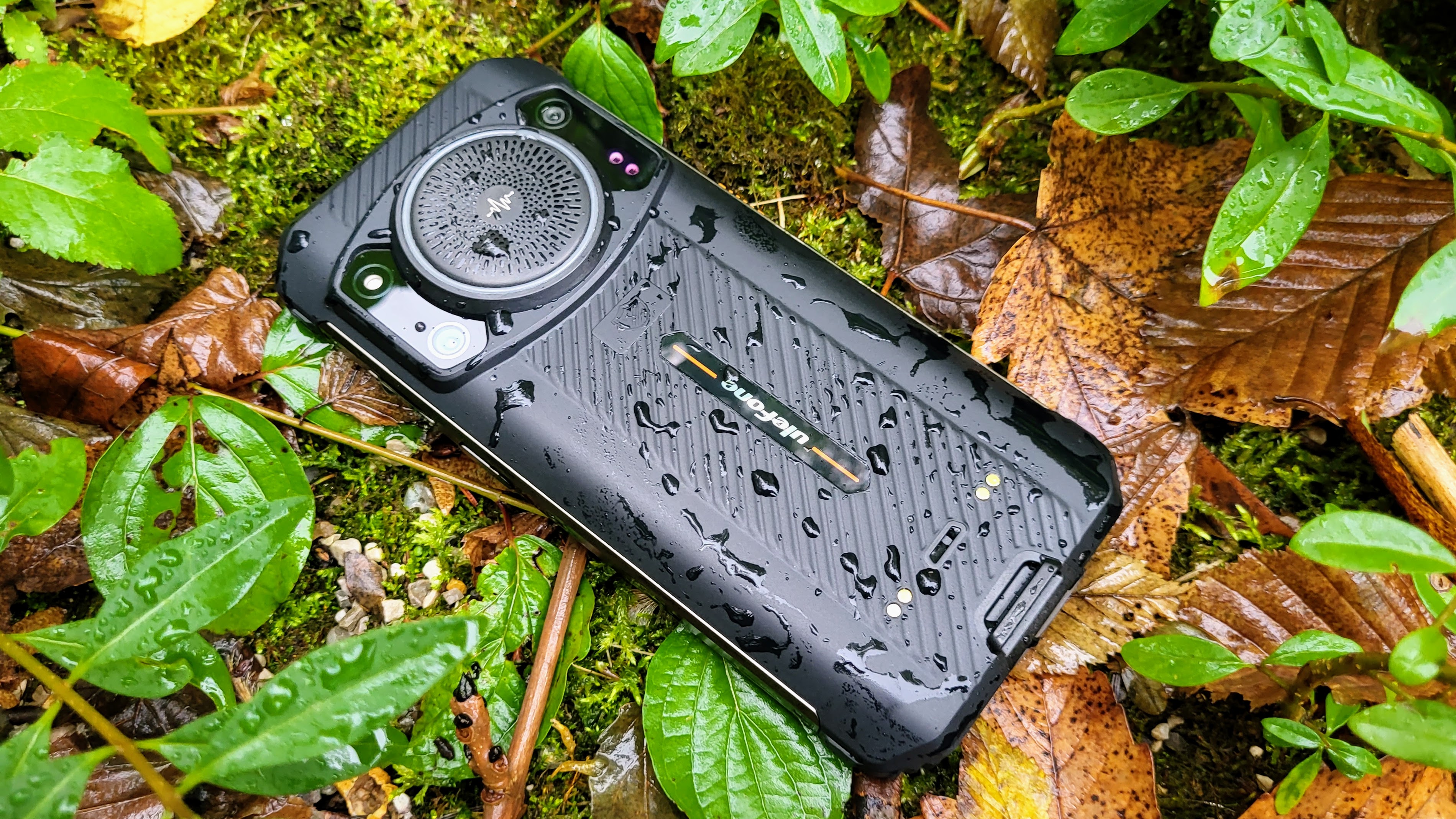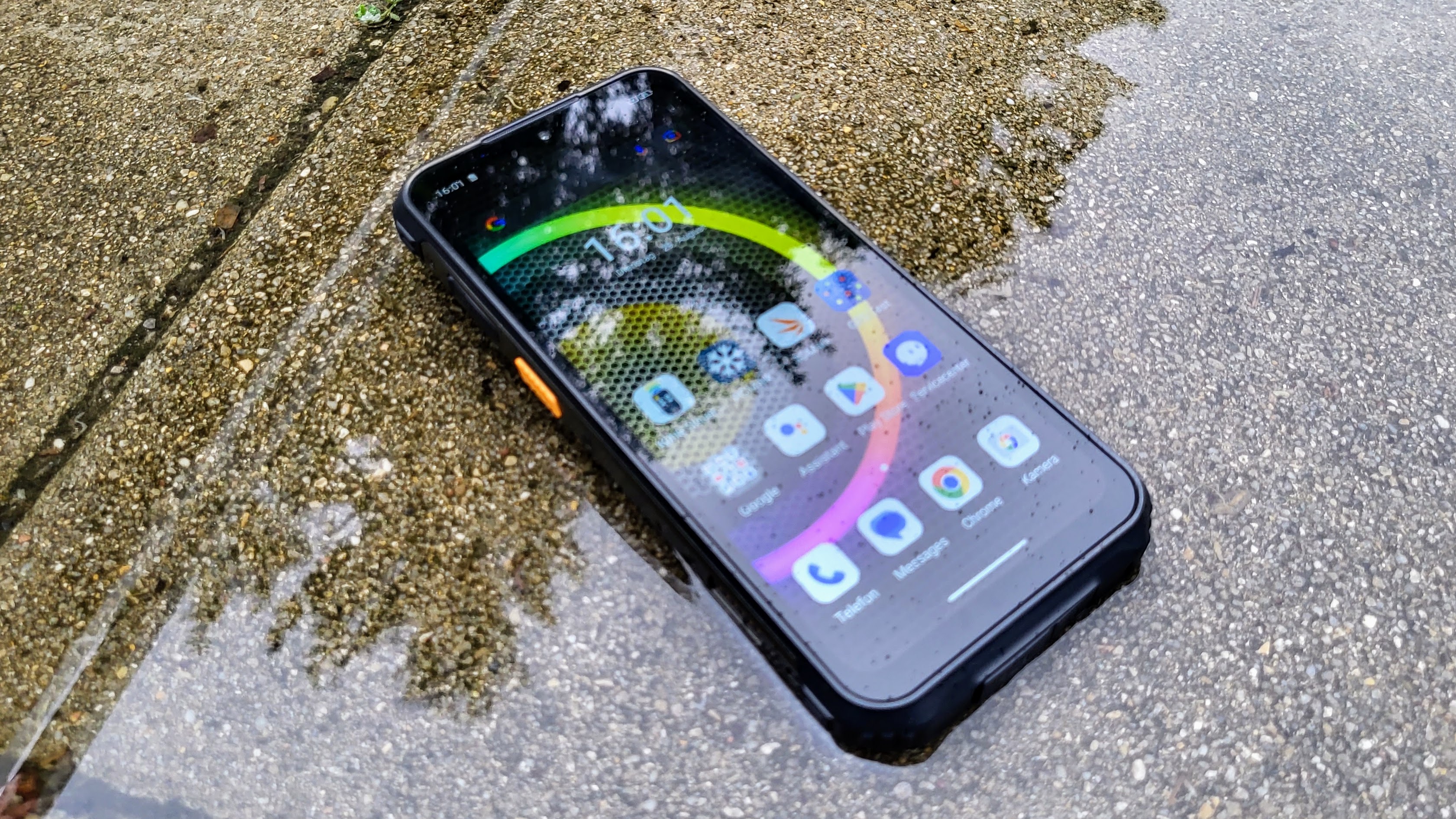 Wir haben das Gerät mehrfach durchs Büro geworfen und eine Weile in einer Pfütze im Regen liegen lassen – es funktioniert nach wie vor. Laut Ulefone übersteht das Outdoor-Handy einen Sturz auf harten Untergrund aus 1,5 m Höhe. In Wasser übersteht es den Aufenthalt in 1 m Tiefe für 30 Minuten.