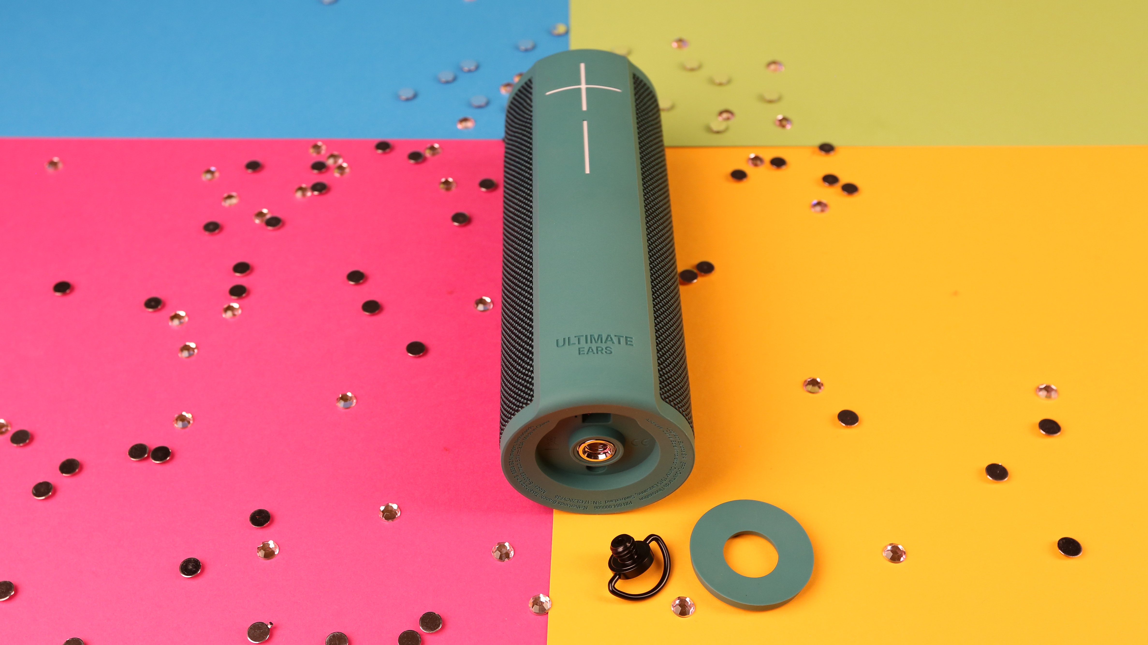 Auf der Unterseite hat der Lautsprecher ein Standard-Stativgewinde, in das eine Trageschlaufe eingeschraubt ist. Die Micro-USB-Buchse zum Laden sitzt ebenfalls auf der Unterseite. Diese ist durch eine runde Kunststoffabdeckung gegen das Eindringen von Wasser und Schmutz geschützt. Das ist zwar einerseits praktisch, andererseits bedeutet es aber, dass der Nutzer jedes Mal die Aufhängung abschrauben muss, um den Speaker wieder zu laden.