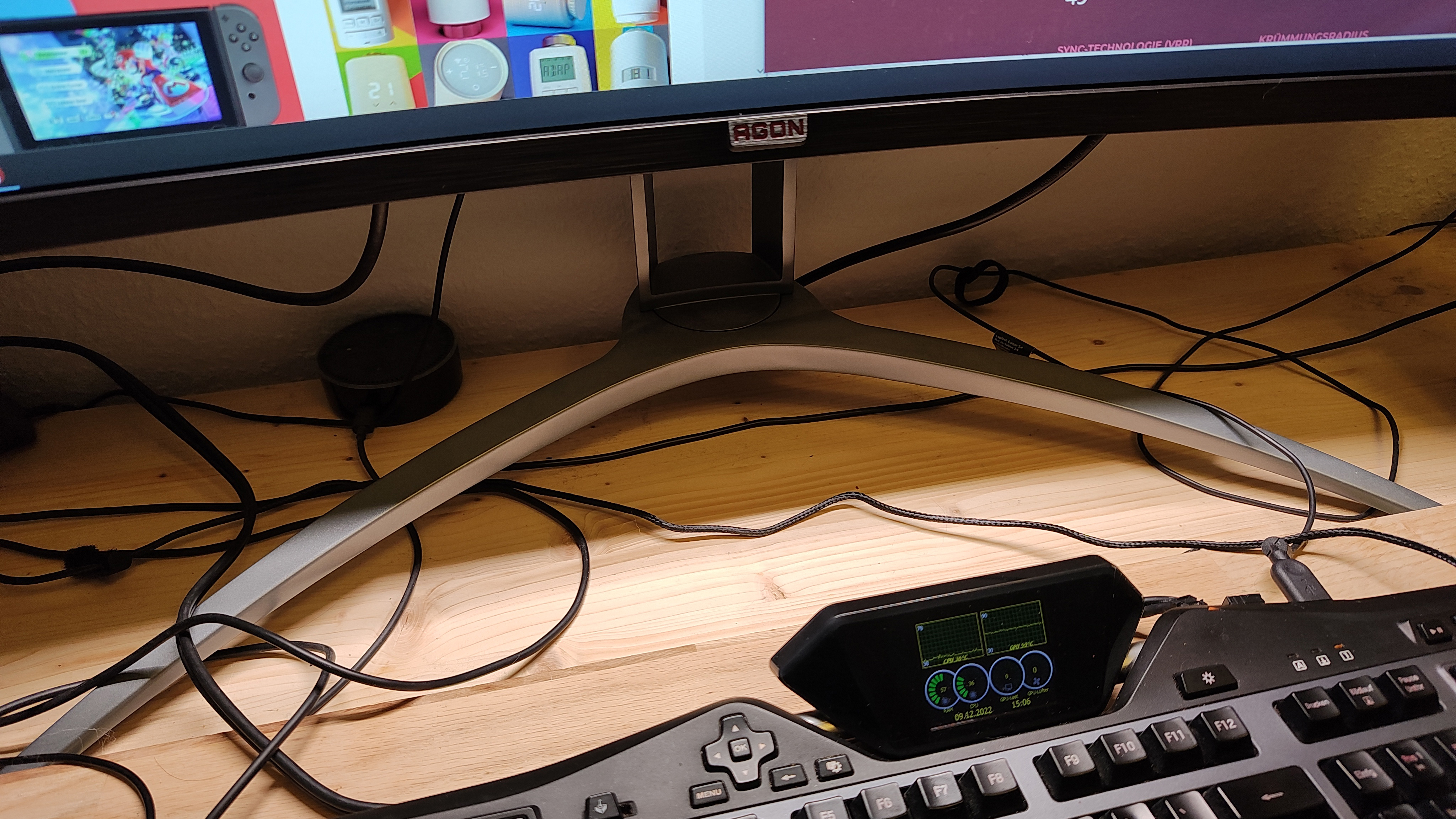 Eine Grundvoraussetzung für den Kauf sollte ausreichend Platz auf dem Schreibtisch sein. Damit ist nicht nur der riesige, fast 1,2 Meter breite und gebogene Monitor selbst gemeint, sondern auch der ausladende Metallfuß, auf dem das Monstrum normalerweise steht. Denn für ordentliche Stabilität braucht der Dreifuß nicht nur zu den Seiten, sondern auch nach vorn und hinten einen ordentlichen Überhang, was viel Platz auf dem Schreibtisch einnimmt.