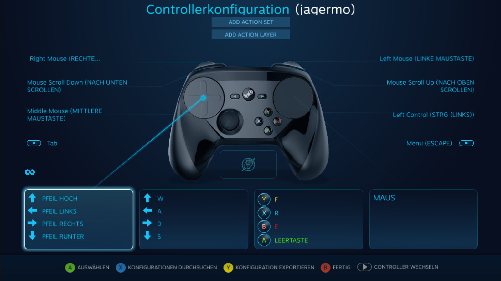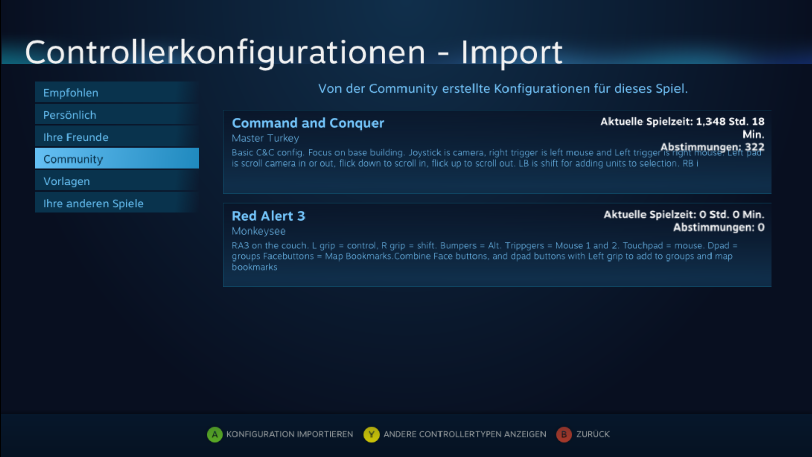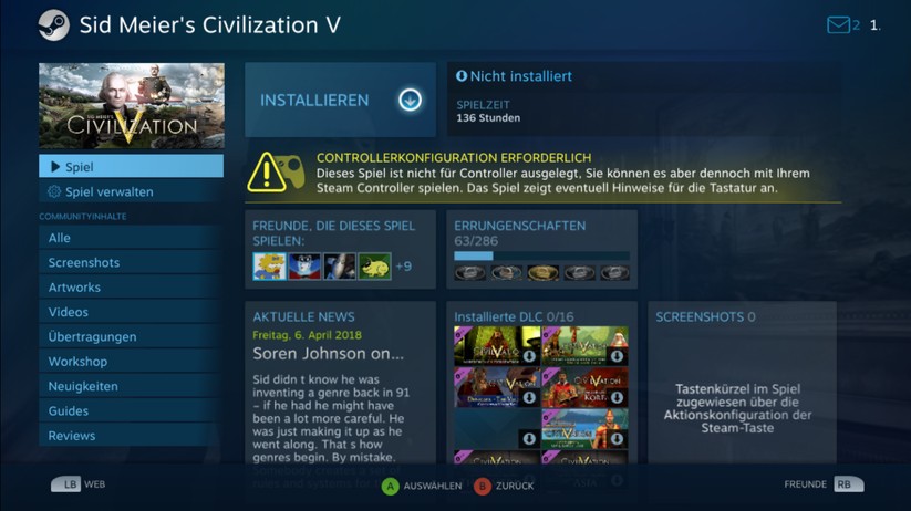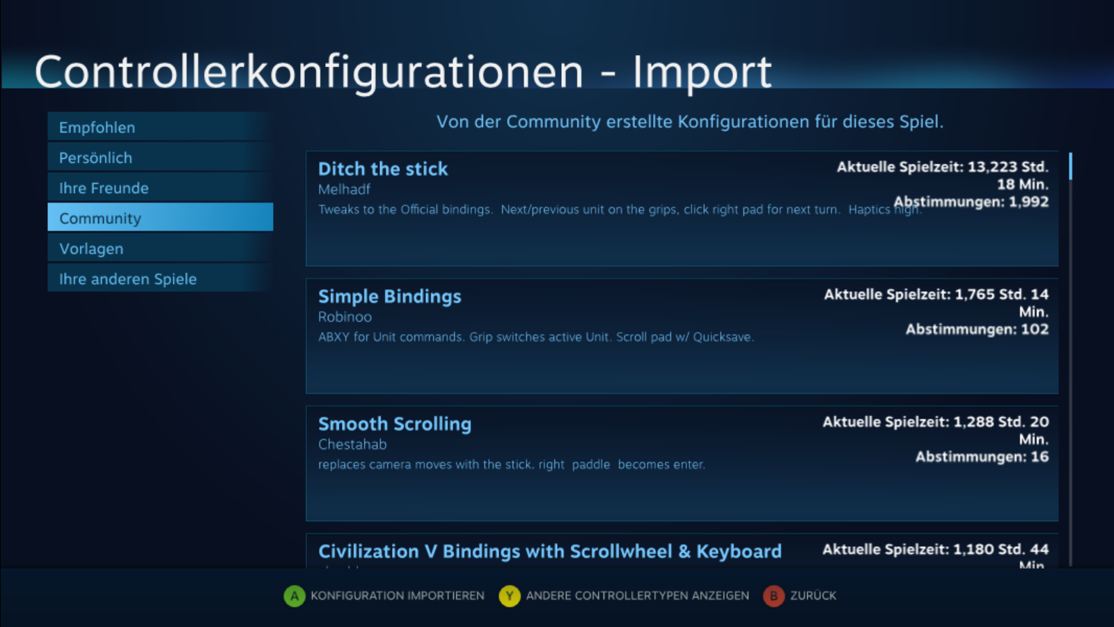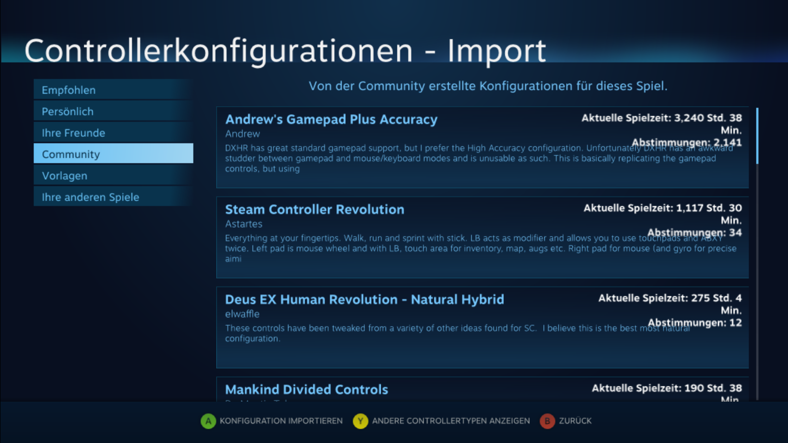 Auch unter Windows ist der Controller von Valve kein klassisches Gamepad, erkannt wird es als HID. Der große Vorteil: Über Steam lässt es sich für jedes Spiel individuell programmieren, alle Tasten lassen sich belegen oder kombinieren. Dank des Touchpads klappt das auch gut als Mausersatz. So lassen sich sogar Titel spielen, die eigentlich nicht für Gamepads gedacht sind. Entwickler und vor allem die Community liefern zahlreiche Vorlagen, die sich auf dem Controller übertragen lassen. Die Daten sind mit dem Steam-Profil gekoppelt, lassen sich also auch auf andere Systeme mitnehmen.
