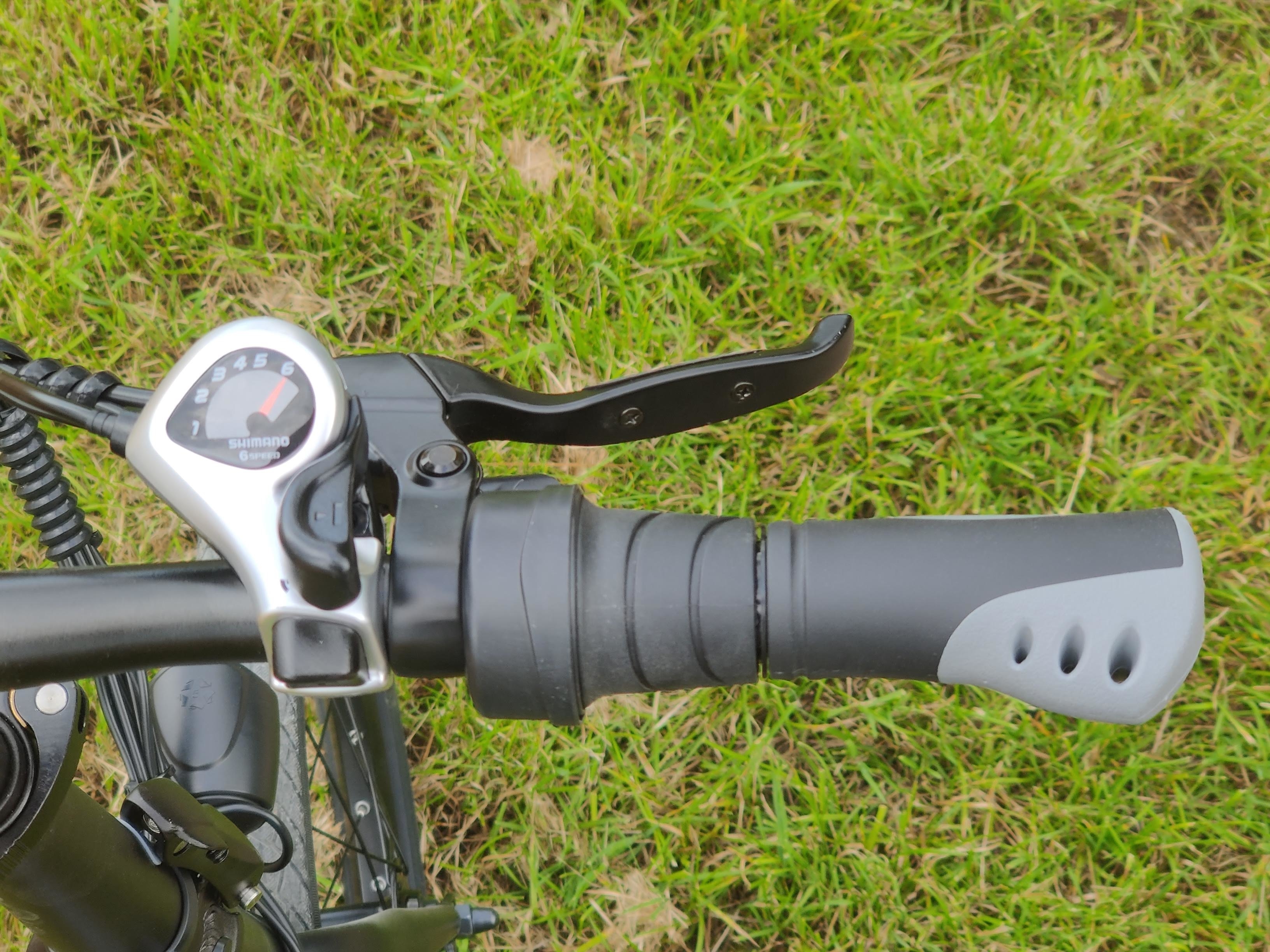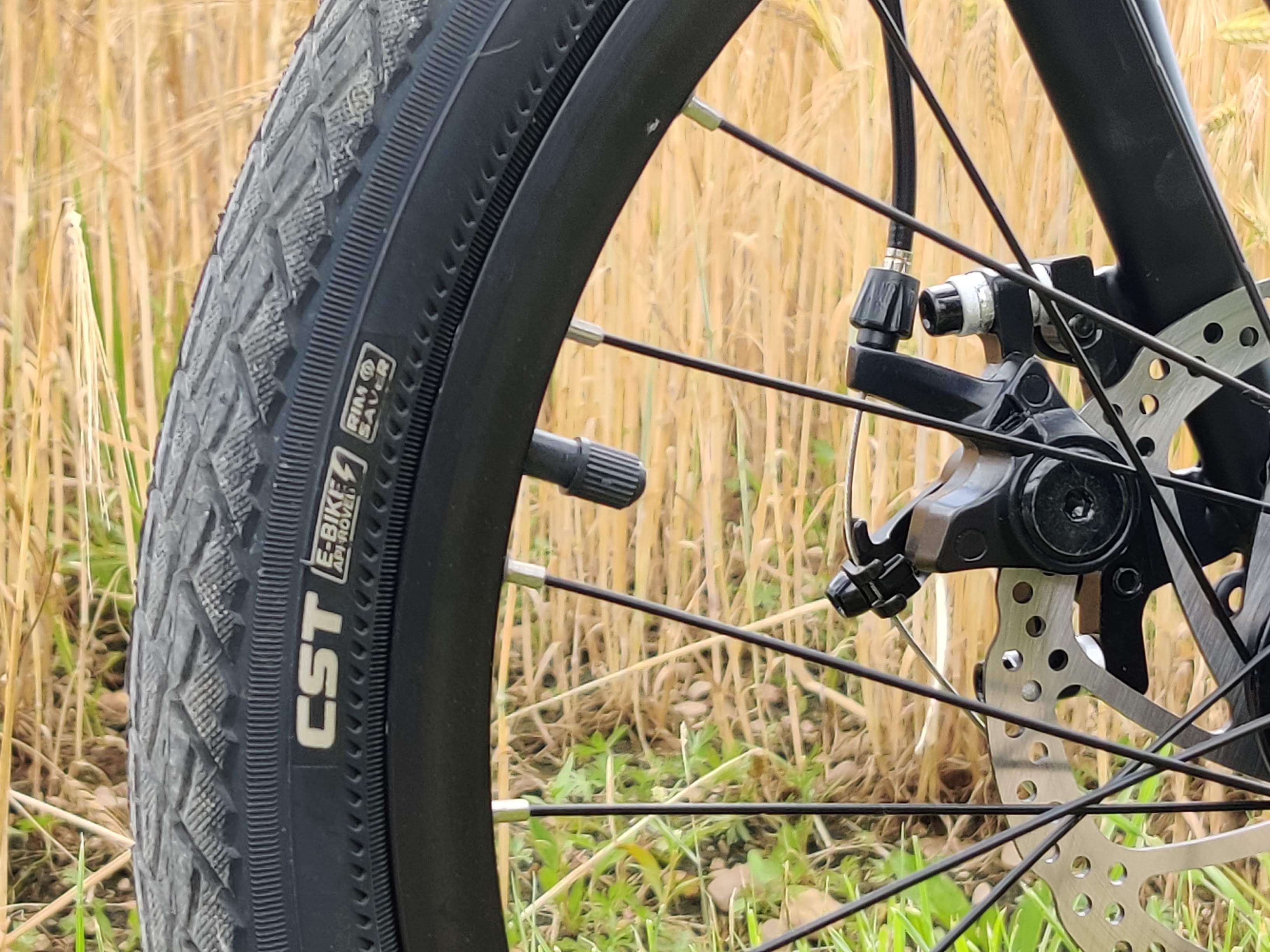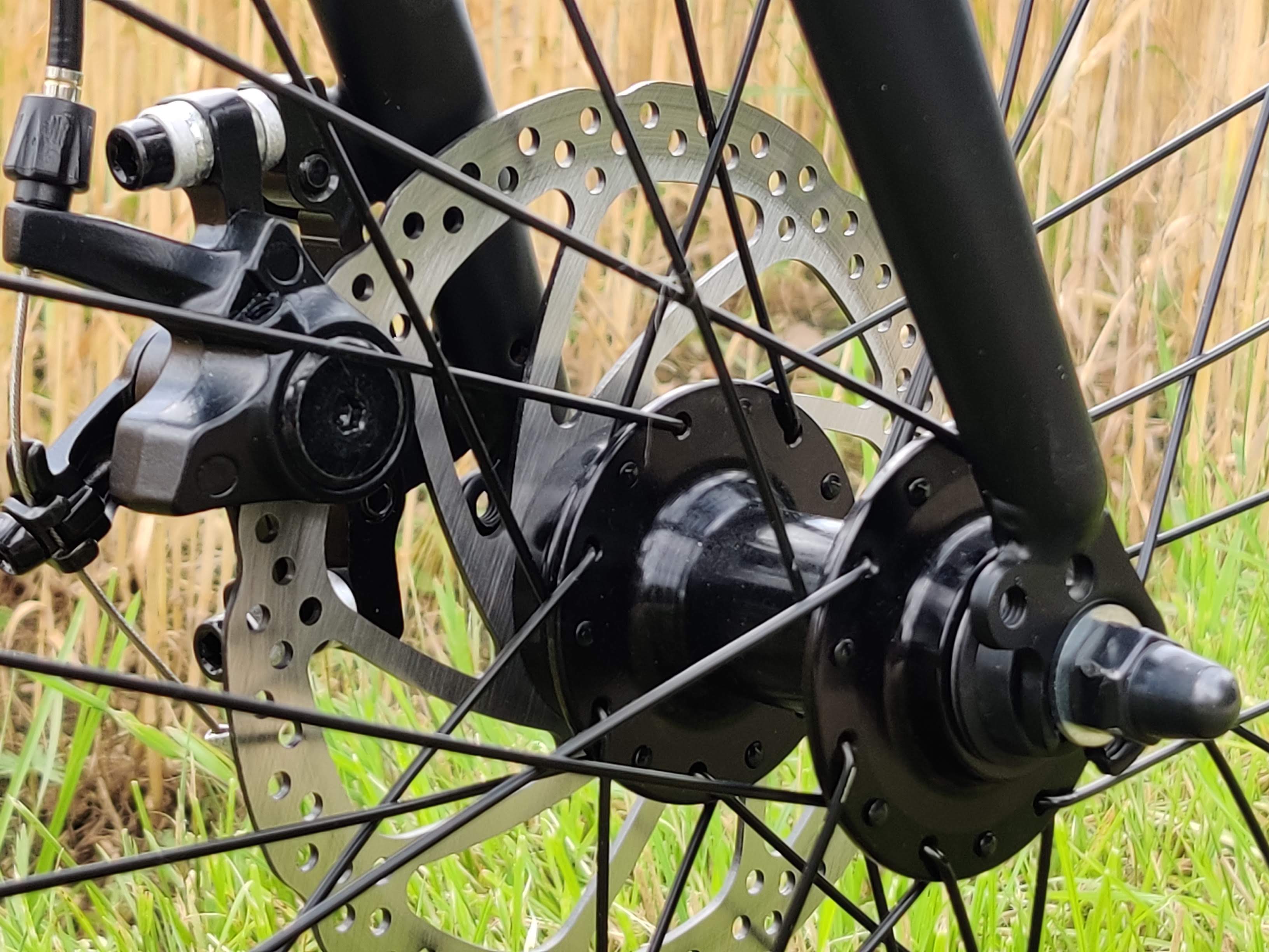 Die mechanischen Scheibenbremsen an Vorder- und Hinterrad griffen bei uns ab der ersten Fahrt gut. Das kann aber von Fall zu Fall unterschiedlich sein. Gegebenenfalls muss man diese mit dem beiliegenden Werkzeug nachjustieren. Insgesamt sind wir mit ihnen zufrieden. Sie greifen gut und bremsen zuverlässig. Hydraulische Scheibenbremsen wären besser, die sind in dieser Preiskategorie jedoch nicht zu erwarten. Zu beachten ist, dass der rechte Bremsgriff die Vorderradbremse anspricht und der linke Bremsgriff die Hinterradbremse. Bei in Deutschland verkauften Fahrrädern ist dies üblicherweise andersrum.