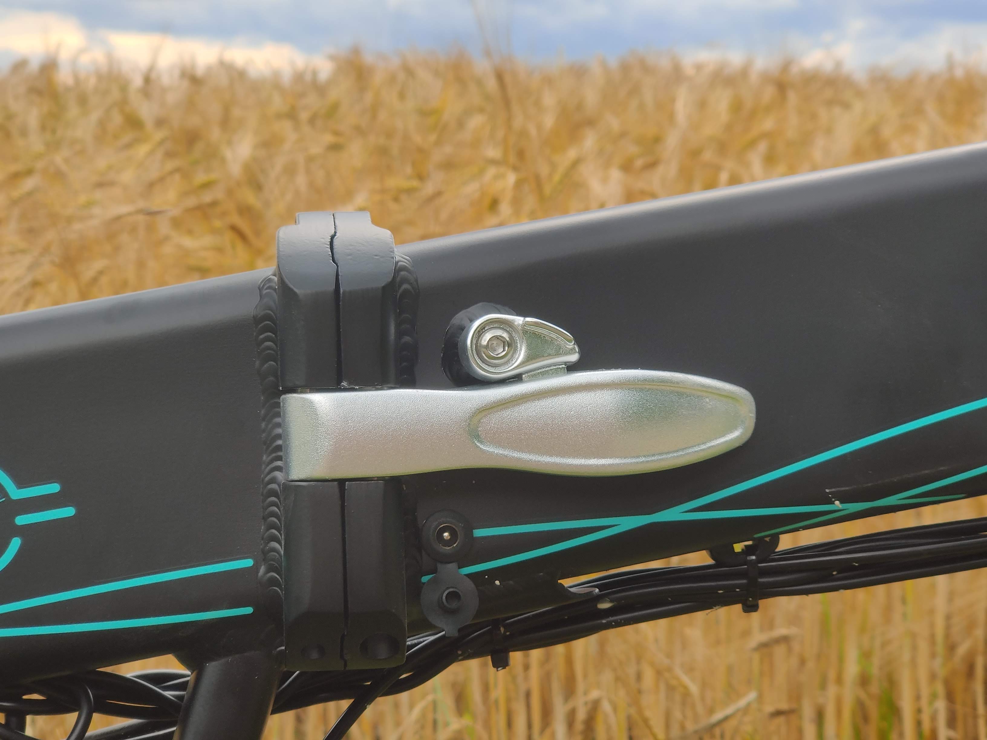 Der Klappmechanismus wirkt wie bei allen von uns getesteten E-Klapprädern von Fiido ausgereift. Sattel und Lenker einfahren, Lenkstange gewinkelt anlegen und Rahmen mittig umklappen. Schon schrumpfen die Maße auf 84 × 65 × 43 Zentimeter. Dabei klappt hier die Lenkstange so, dass sie sich anschließend mittig des Fahrrads befindet. Üblicherweise liegt sie sonst außen.