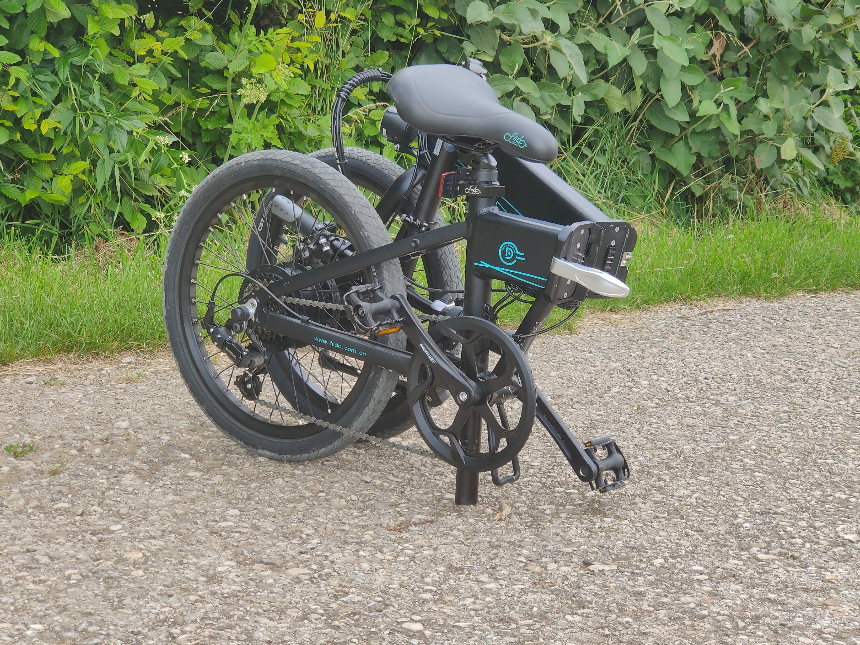 Man kann das D4S zusammengeklappt ein paar Meter tragen. Wirklich bequem ist das nicht, da sich das Bike zusammengeklappt nicht fixieren lässt. Das löst das Blaupunkt Fiene 500 (Testbericht) mit seinem Magneten besser. Dafür ist es mit einem Gewicht von 18,5 Kilogramm leichter als die meisten anderen klappbaren E-Bikes. Im Gegensatz zum Fiido M1 (Testbericht) und Fiido D2S (Testbericht) kann man die Pedale beim D4S nicht abklappen und damit weitere Zentimeter in der Breite einsparen. Dafür wirken die Pedale nun endlich ausreichend stabil.