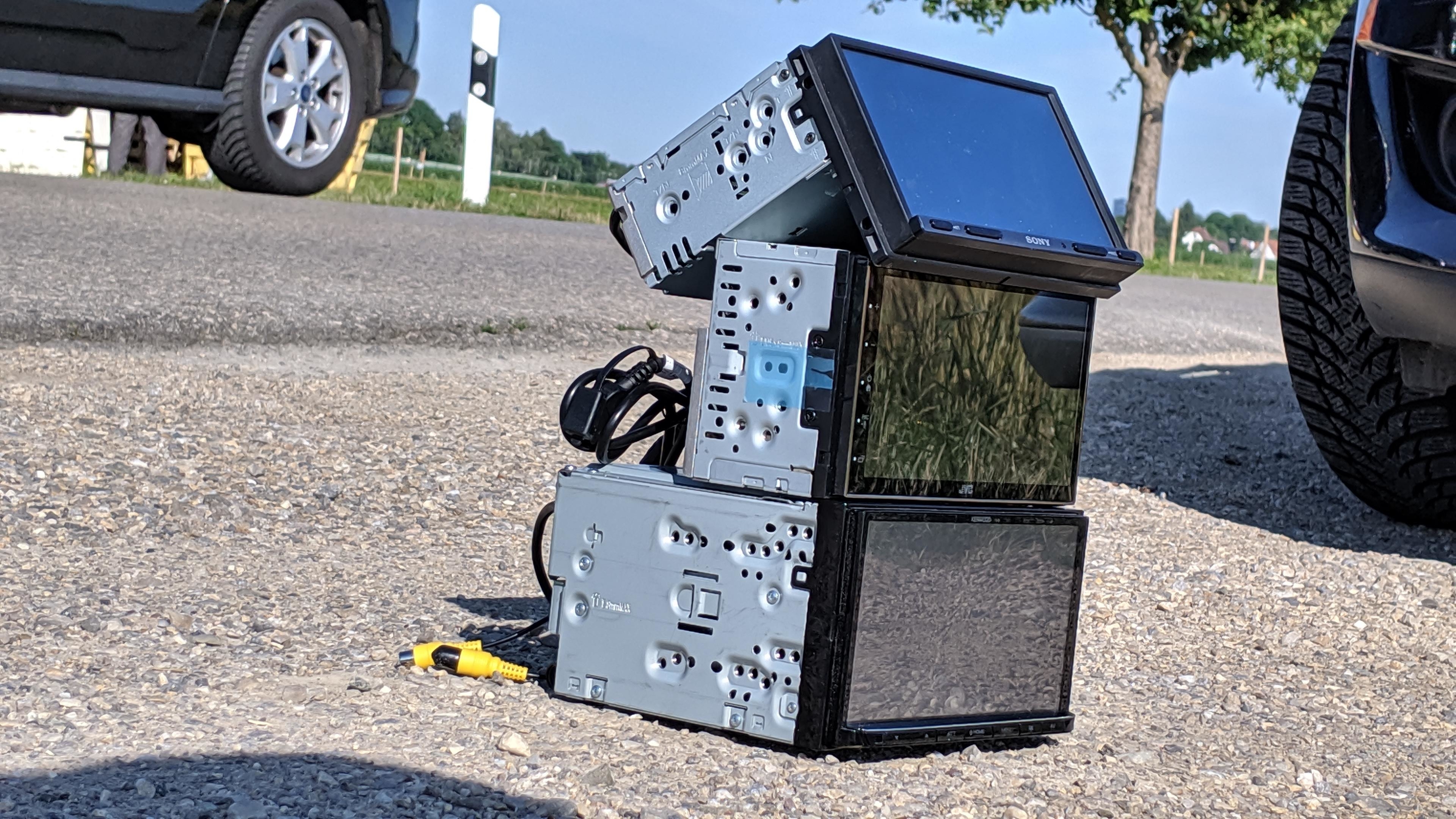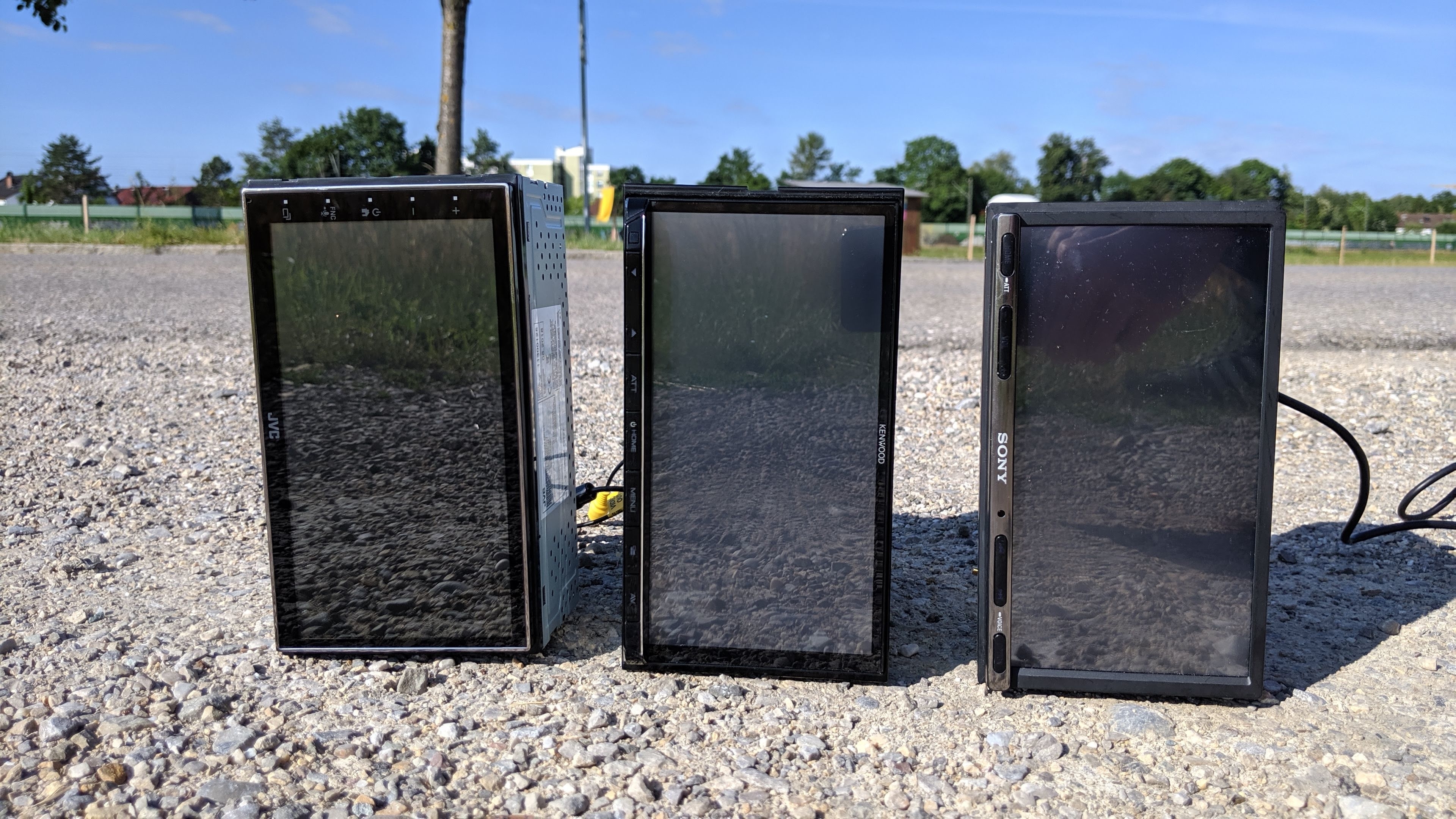 Die Displays sind alle etwa 7 Zoll groß und lösen 800 × 480 Pixel auf. Ihre Helligkeit variiert von 260 cd/m² bei Sony bis 340 und 380 cd/m² bei Kenwood und JVC. Damit lässt sich das Dispaly des Sony nur mit Fantasie bei direkter Sonnenreflektion ablesen. Das Kenwood und JVC bringt dafür eine ausreichende Helligkeit mit.