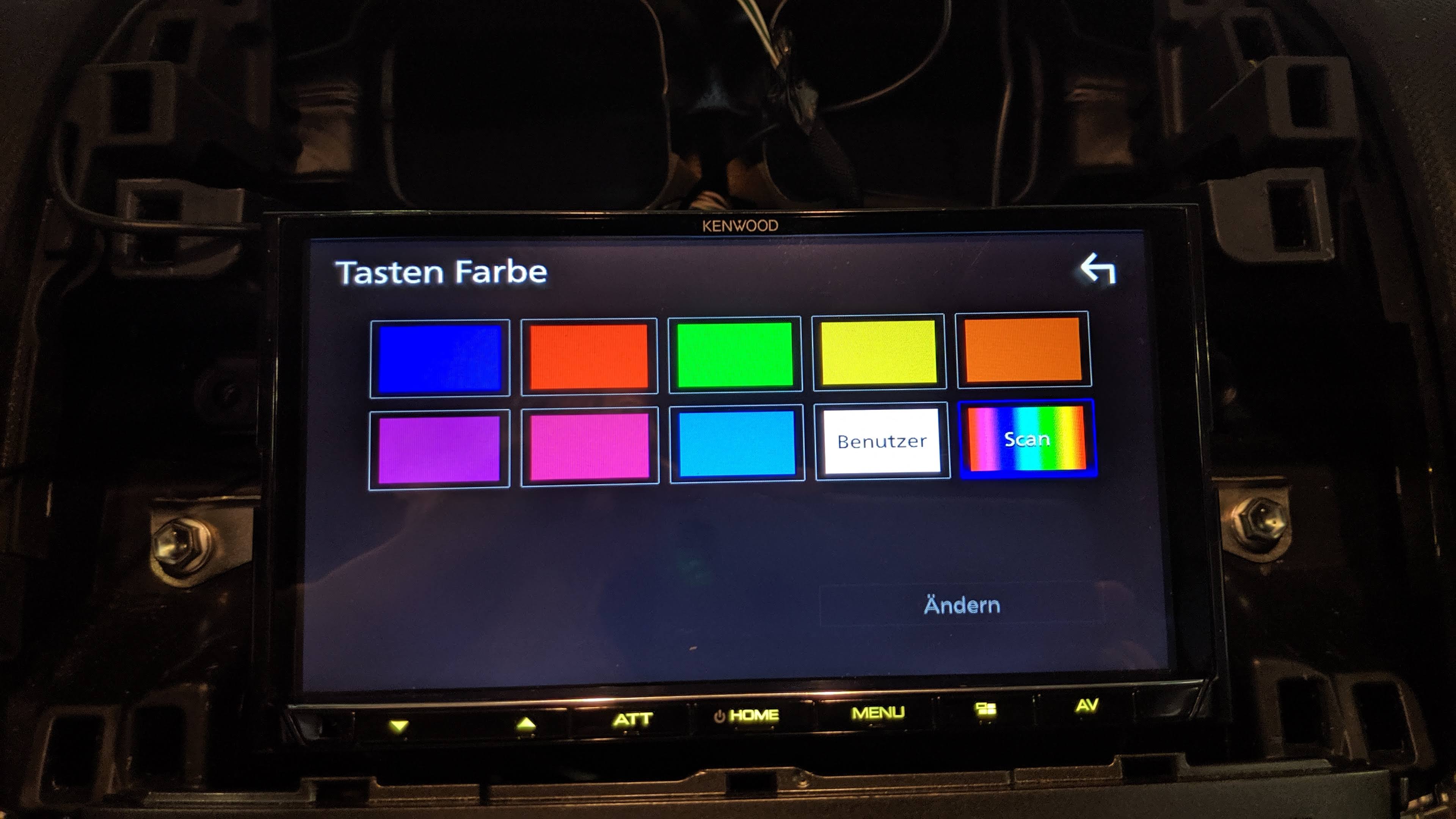 Die Knopfreihe am JVC KW-M745DBT befindet sich unter dem Display. Allerdings lässt sich diese schon wesentlich schlechter ohne hinzuschauen erfühlen, da ihre haptische Abgrenzung quasi nicht gegeben ist. Dafür kann man hier die Tastenfarbe frei wählen und der Beleuchtung des Innenraums anpassen.