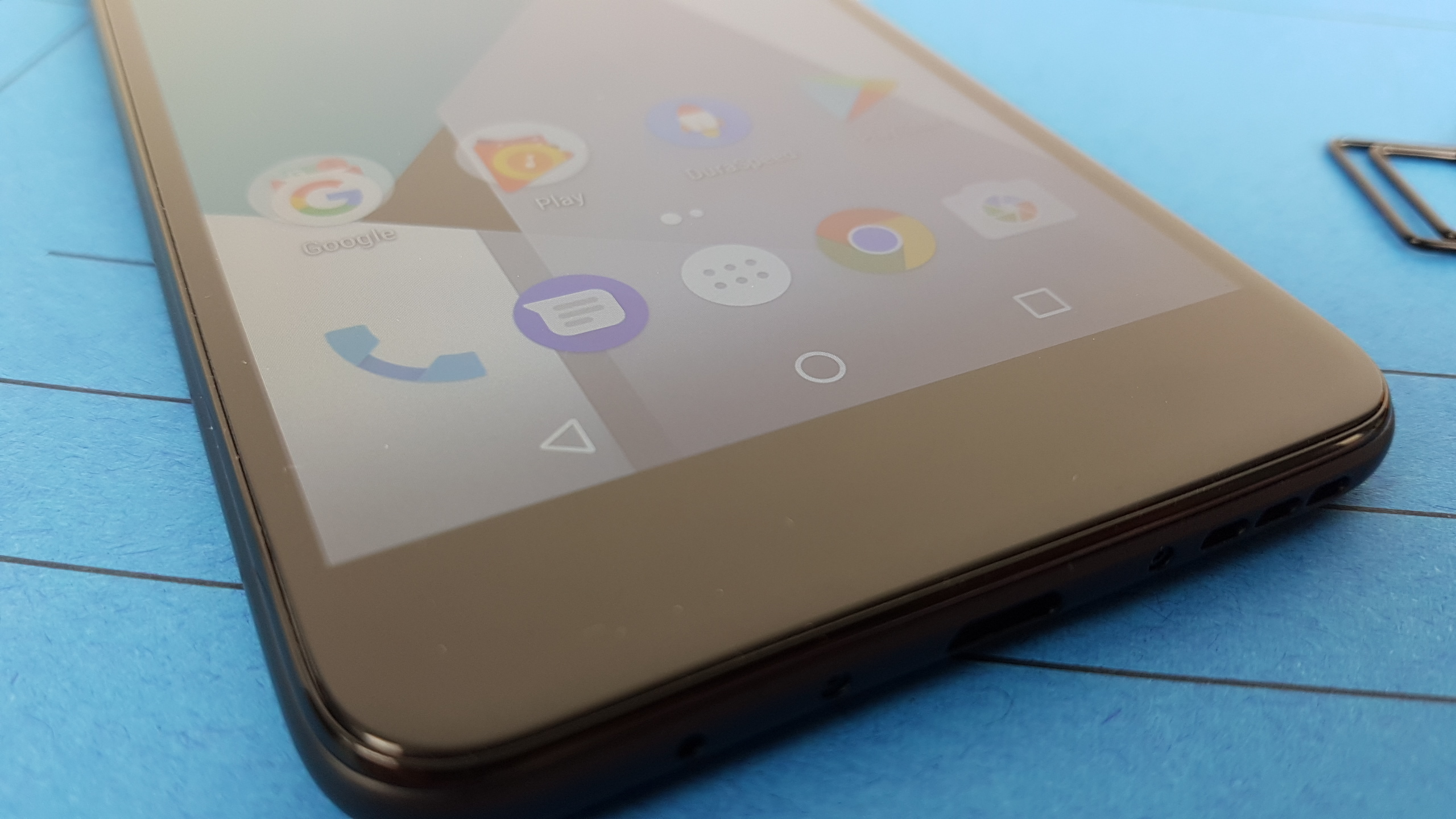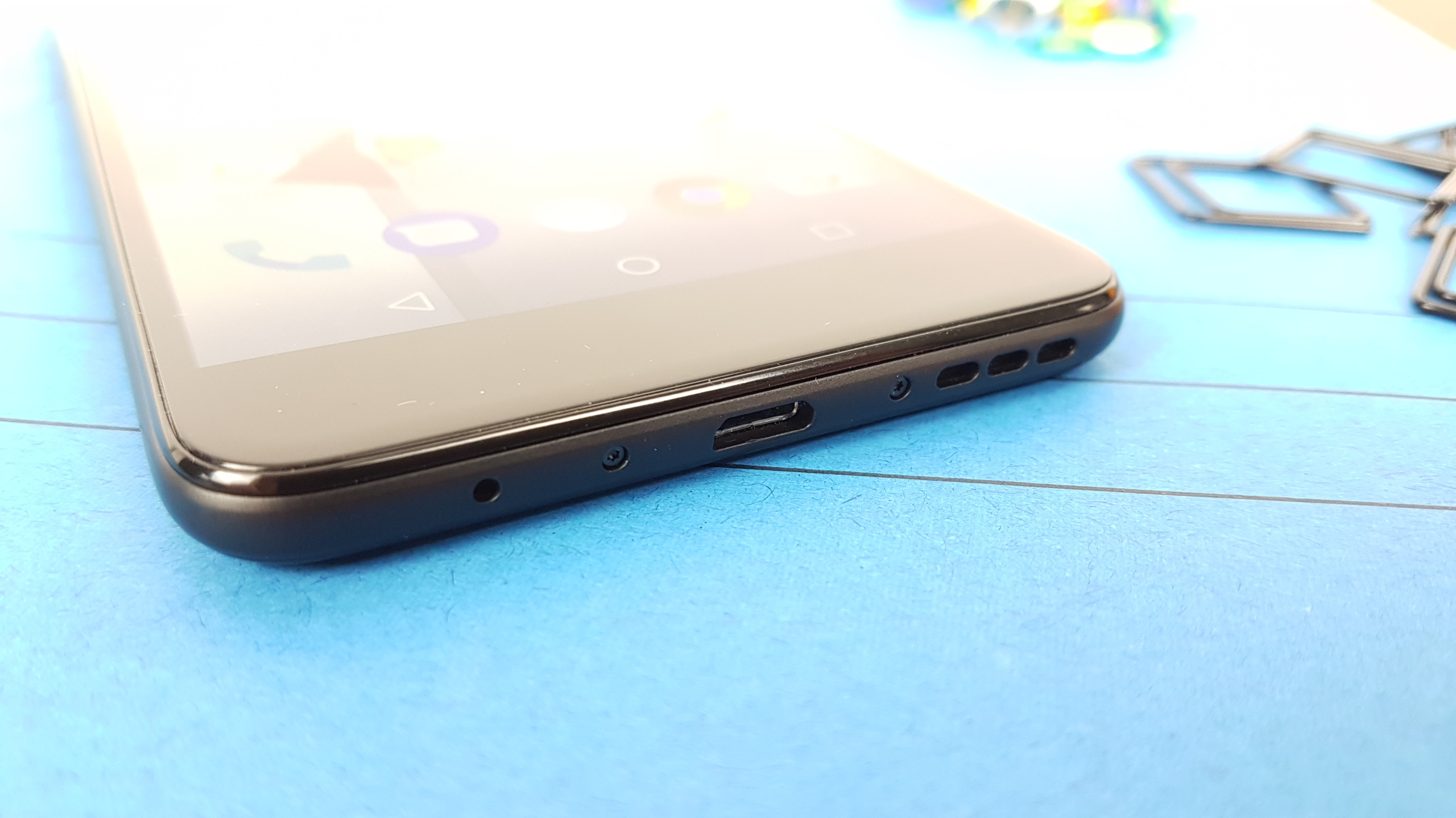 Unten gibt es einen microUSB-Anschluss nebst Mikrofon und Lautsprecher, oben einen 3,5-Millimeter-Klinkeneingang. Powerbutton und Lautstärkewippe sitzen auf der rechten Seite, der Karten-Slot auf der linken Seite oben. Die Hauptkamera auf der Rückseite befindet sich mittig weit oben, links davon ein LED-Blitz und direkt darunter ein Fingerabdrucksensor.