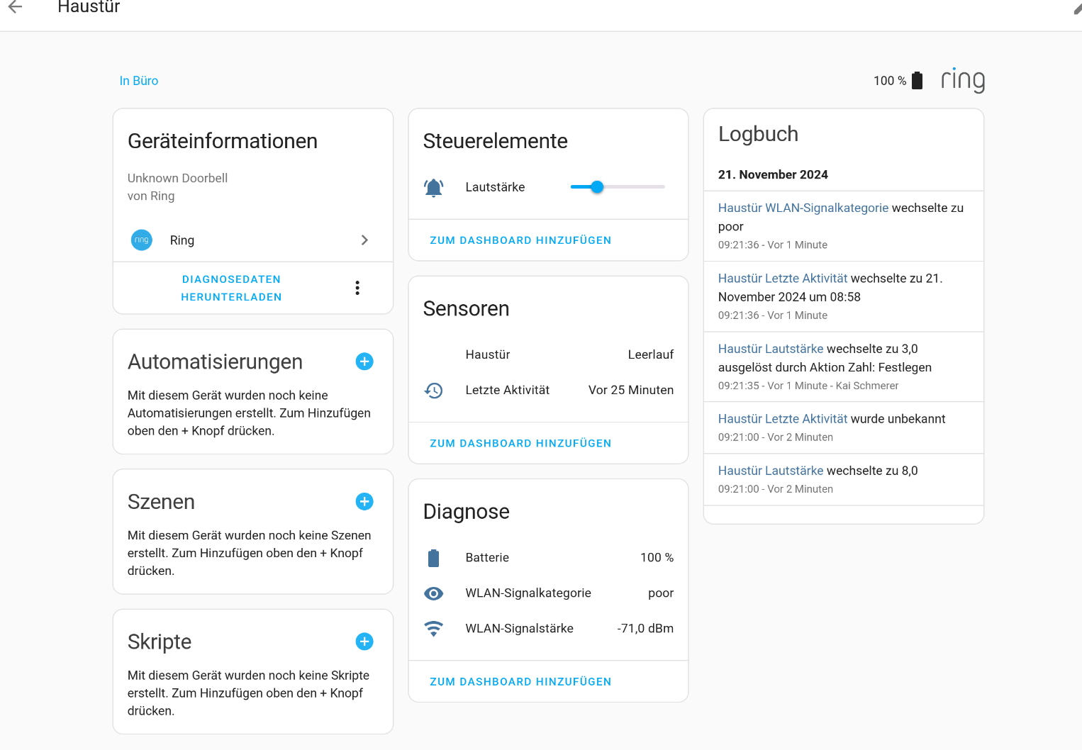 Wie fast alle batteriebetriebenen Überwachungskameras unterstützt die Ring Battery Video Doorbell nicht den Onvif-Standard (Ratgeber) und lässt sich somit nicht ohne Weiteres in Smart-Home-Systeme (Bestenliste) wie Home Assistant integrieren. Dennoch gibt es für die Open-Source-Lösung eine Integration, die allerdings nur wenige Daten liefert und für Automatisierungen bis auf den Status der Batterie keine sinnvollen Optionen bietet.