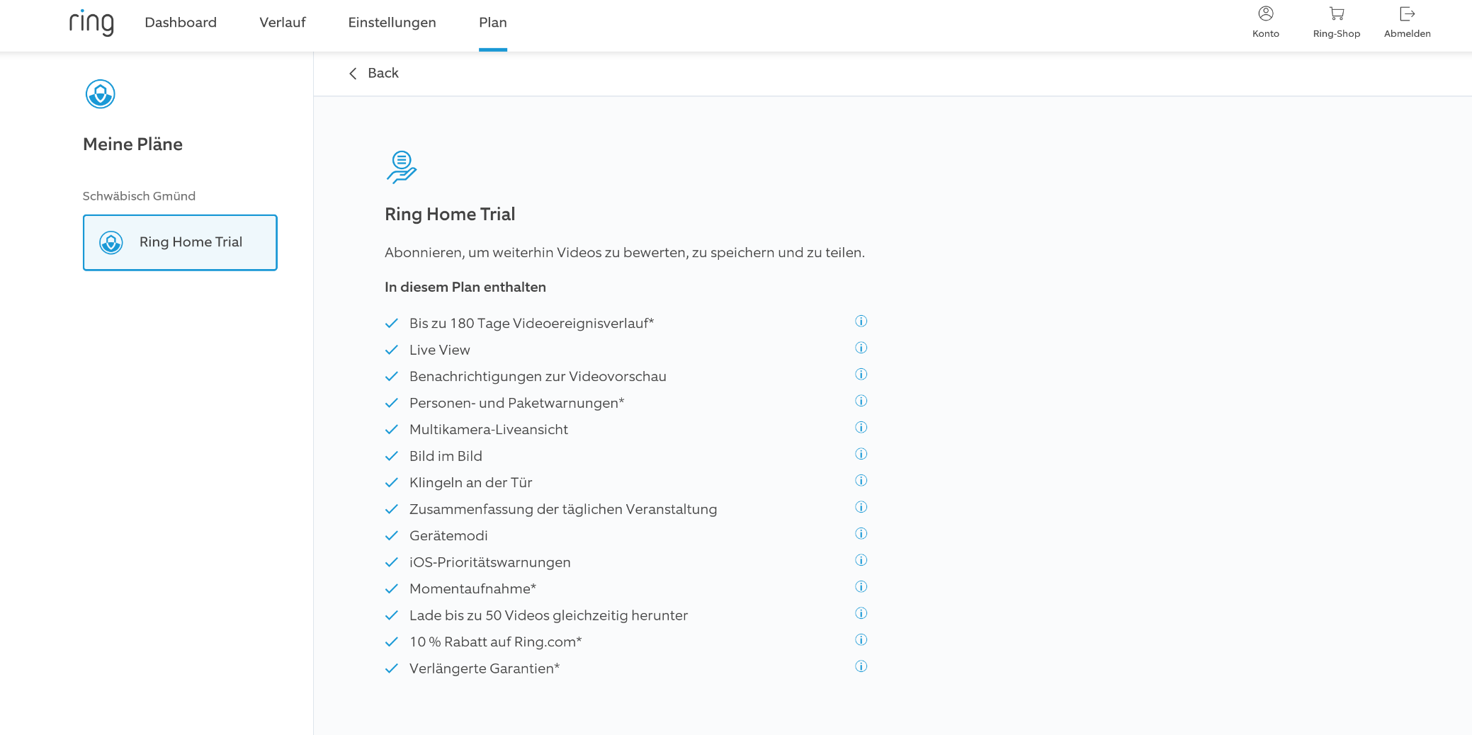 Sämtliche Videos und Momentaufnahmen speichern Ring-Überwachungskameras grundsätzlich in der Cloud des Herstellers. Benachrichtigungen, Live-Video und Gegensprechfunktionen kann man auch ohne Abo nutzen. Wer aber Wert auf eine Speicherung der Videos legt, muss mindestens das Basis-Abo für 4 Euro monatlich abschließen. Dieses bietet einen Videoereignisverlauf von bis zu 180 Tage. Wer mehr als eine Ring-Kamera im Einsatz hat und diese Funktionen für alle Geräte wünscht, muss das Standard-Abo für monatlich 10 Euro abschließen. Dann kann man auch Türklingelanrufe und verschiedene Betriebsmodi (Inaktiv, Zuhause, Abwesend) nutzen. Letztere erlauben verschiedene Konfigurationseinstellungen bezüglich Bewegungserfassung, automatischer Antworten und Privatsphäre.