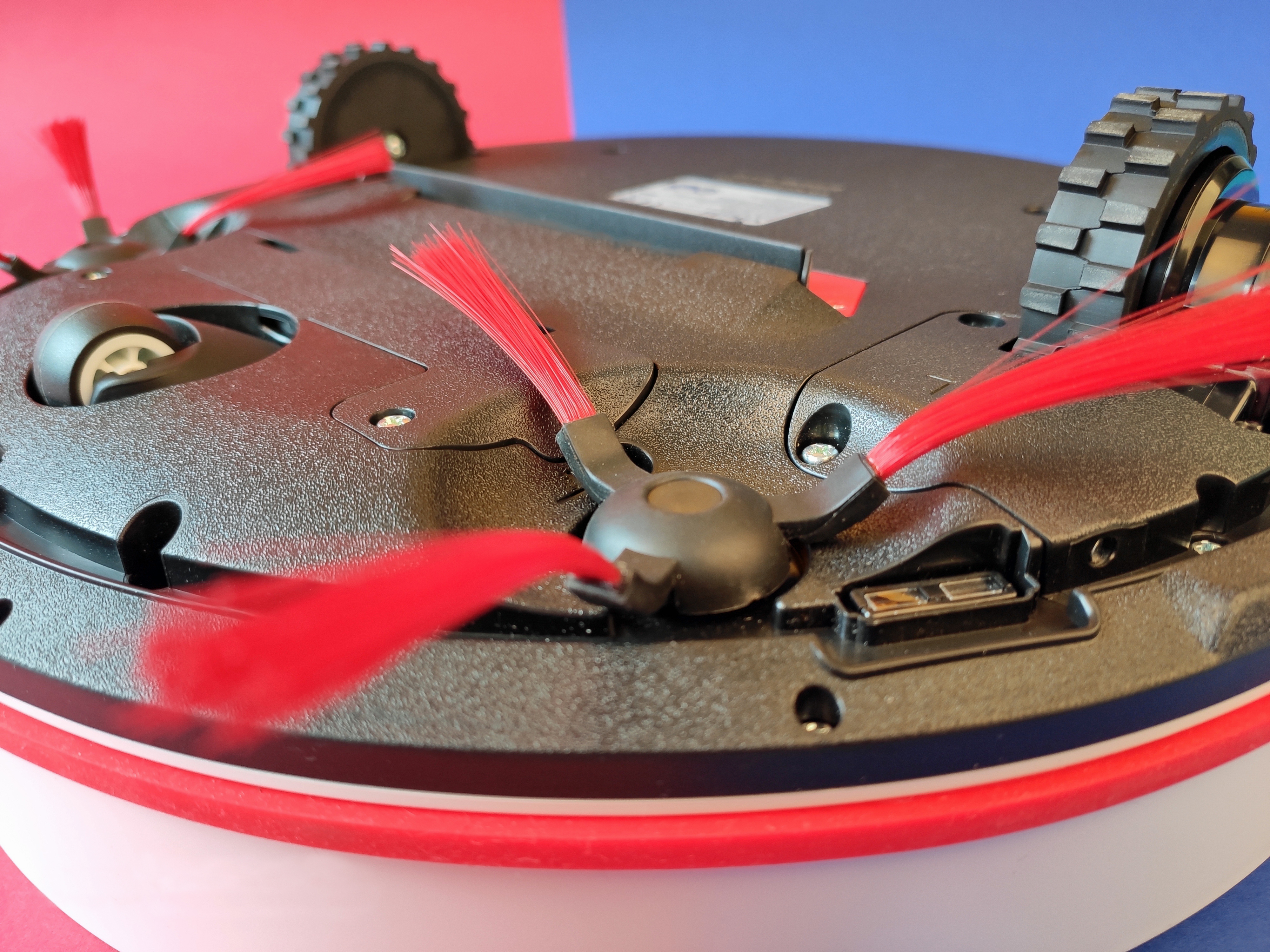 Optisch macht sich der günstige Preis also nicht bemerkbar, beim Lieferumfang hingegen schon. Im Lieferkarton stecken nur der Sauger, die beiden roten Seitenbürsten für den Betrieb, ein Ladegerät und ein Handbuch. Es gibt weder eine Ladestation noch Ersatzbürsten oder zusätzliche Filter für den Schmutzbehälter. Bei teureren Modellen ist all das normalerweise vorhanden. Bei den Filtern handelt es sich nicht um HEPA-Filter , auch wenn der Hersteller ein „Premium-Doppelfiltersystem“ bewirbt. Markierungen zum Abgrenzen von Zonen, sogenannte „Leuchttürme“ oder Magnetbänder, sind ebenfalls nicht im Lieferumfang enthalten, weil der Roboter eine entsprechende Funktion nicht mitbringt.