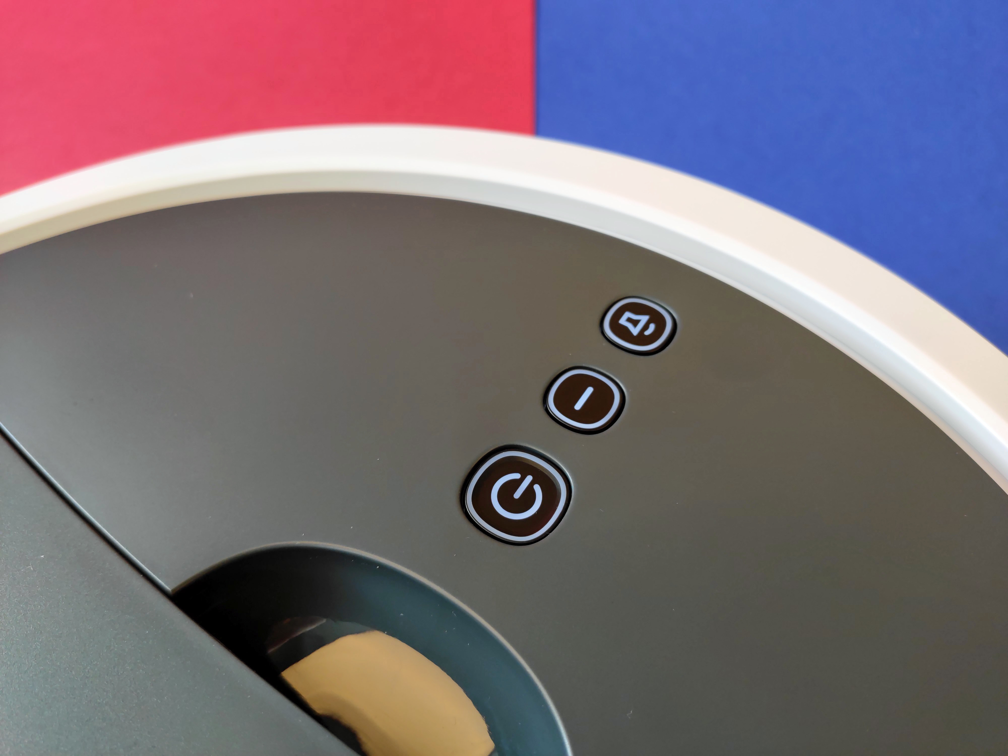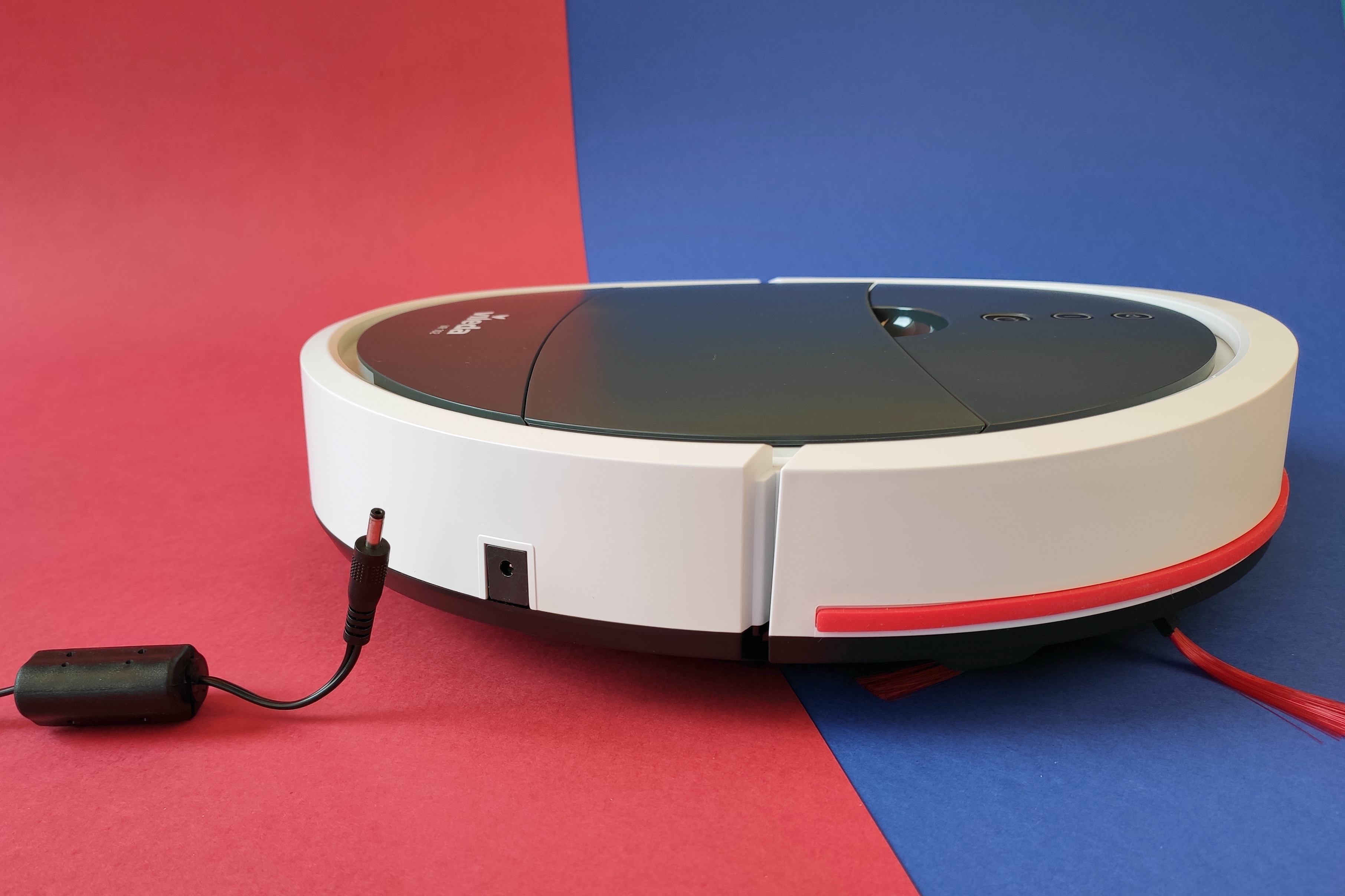 Vor dem ersten Saugen müssen die separat im Lieferkarton befindlichen Seitenbürsten mit leichtem Druck an die vorgesehenen Positionen gesteckt werden, den richtigen Sitz quittieren sie mit einem deutlich hörbaren Klicken. Danach sollte der Sauger vor dem ersten Gebrauch einmal vollständig geladen werden. Der Lithium-Ionen-Akku unseres Testgerätes benötigte dafür teilgeladen keine ganze Stunde, während der die Power-Taste rot leuchtet. Danach sprang die LED von rot auf weiß. Nachladebedarf signalisiert der Saugroboter durch rotes Pulsieren des Powerbuttons. Laden geschieht mangels Ladestation mittels des mitgelieferten Ladekabels, das auf der rechten Seite direkt in den Roboter gestöpselt wird.