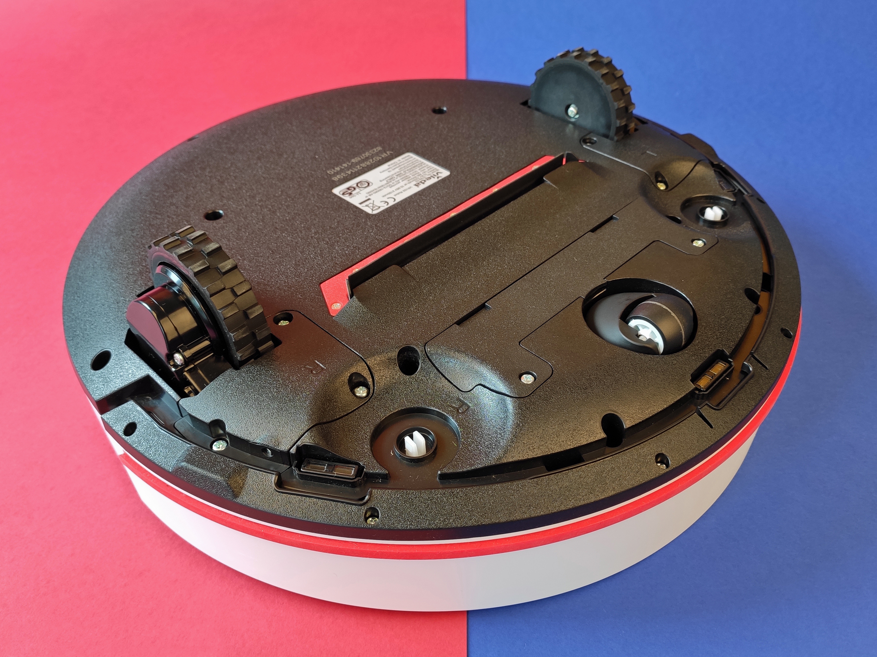 Der Vileda VR 102 ist ein Minimalist. Wie eingangs angedeutet gibt es keinerlei fortschrittliche Sensorik, also weder Laser-, noch Ultraschallsensoren. Lediglich Sensoren zur Absturzvermeidung, etwa an Treppen, sind vorhanden. Ansonsten fährt der Sauger so lange in eine Richtung, bis er an ein Hindernis stößt. Das Eindrücken des an der unteren Kante mit einer roten Gummilippe versehenen Bumpers registriert der Roboter dann wie einen Knopfdruck, dreht sich und fährt danach in eine andere Richtung. Diesen Vorgang wiederholt das Gerät so lange, bis der Akku entleert ist oder er aus anderen Gründen zum Stoppen gezwungen wird.