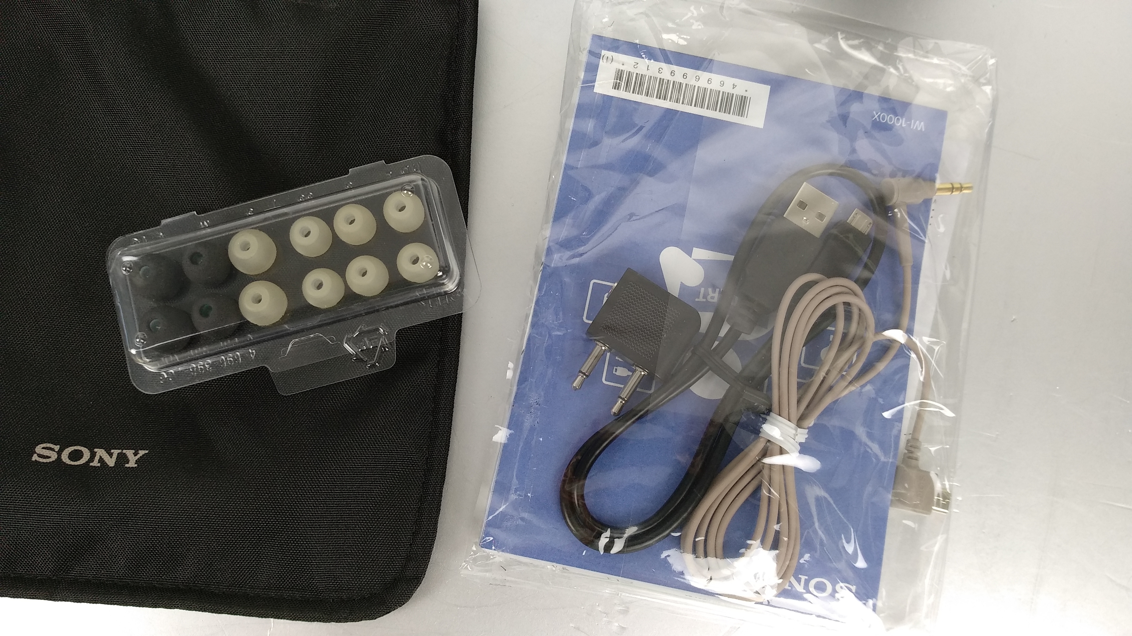 Zum Lieferumfang gehört neben einer Tasche aus Kunststoff für den Transport ein Flugzeug-Steckeradapter, ein USB-Kabel zum Aufladen und ein Kabel mit Micro-USB-Anschluss und Klinken-Stecker um den Sony WI-1000X zu einem herkömmlichen kabelgebundenen Kopfhörer umzurüsten. Das funktioniert auch bei abgeschaltetem Headset. Ist das WI-1000X aktiv, gibt es über Kabel Geräuschminimierung und außerdem High-Resolution-Audioqualität. Auch bei den Ohrpassstücken lässt sich Sony nicht lumpen: Es gibt sie in zwei Materialien und diversen Größen.