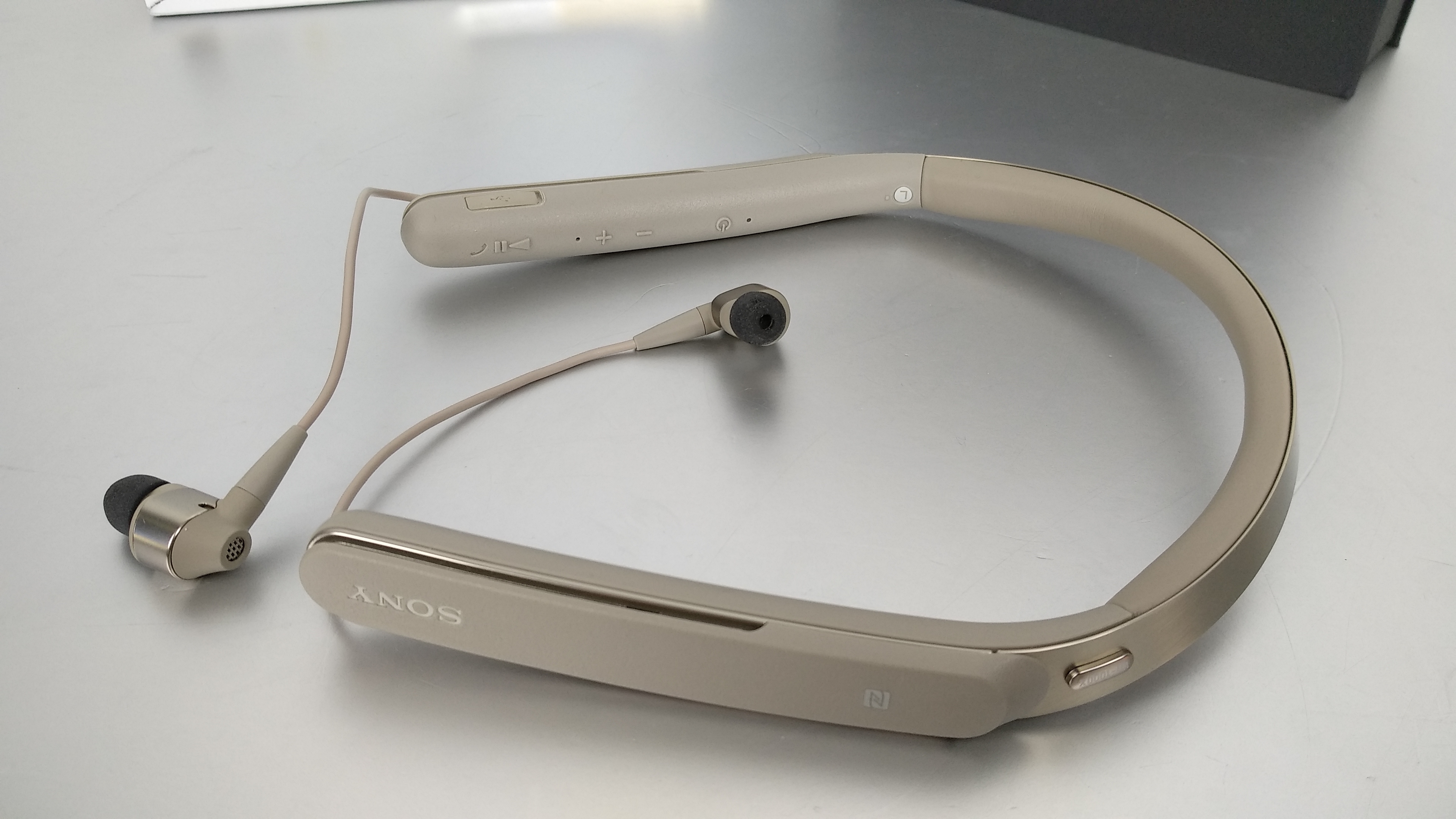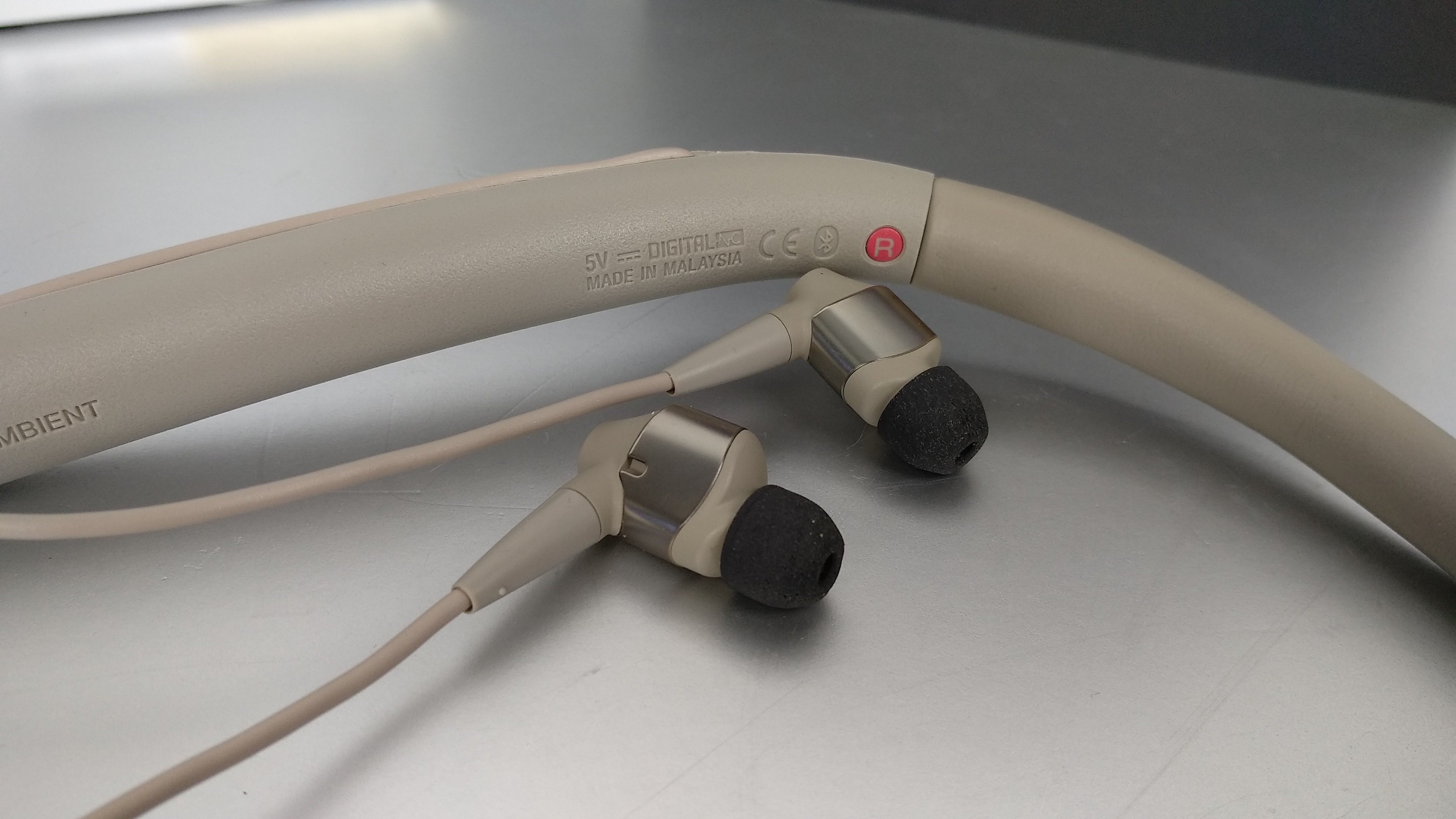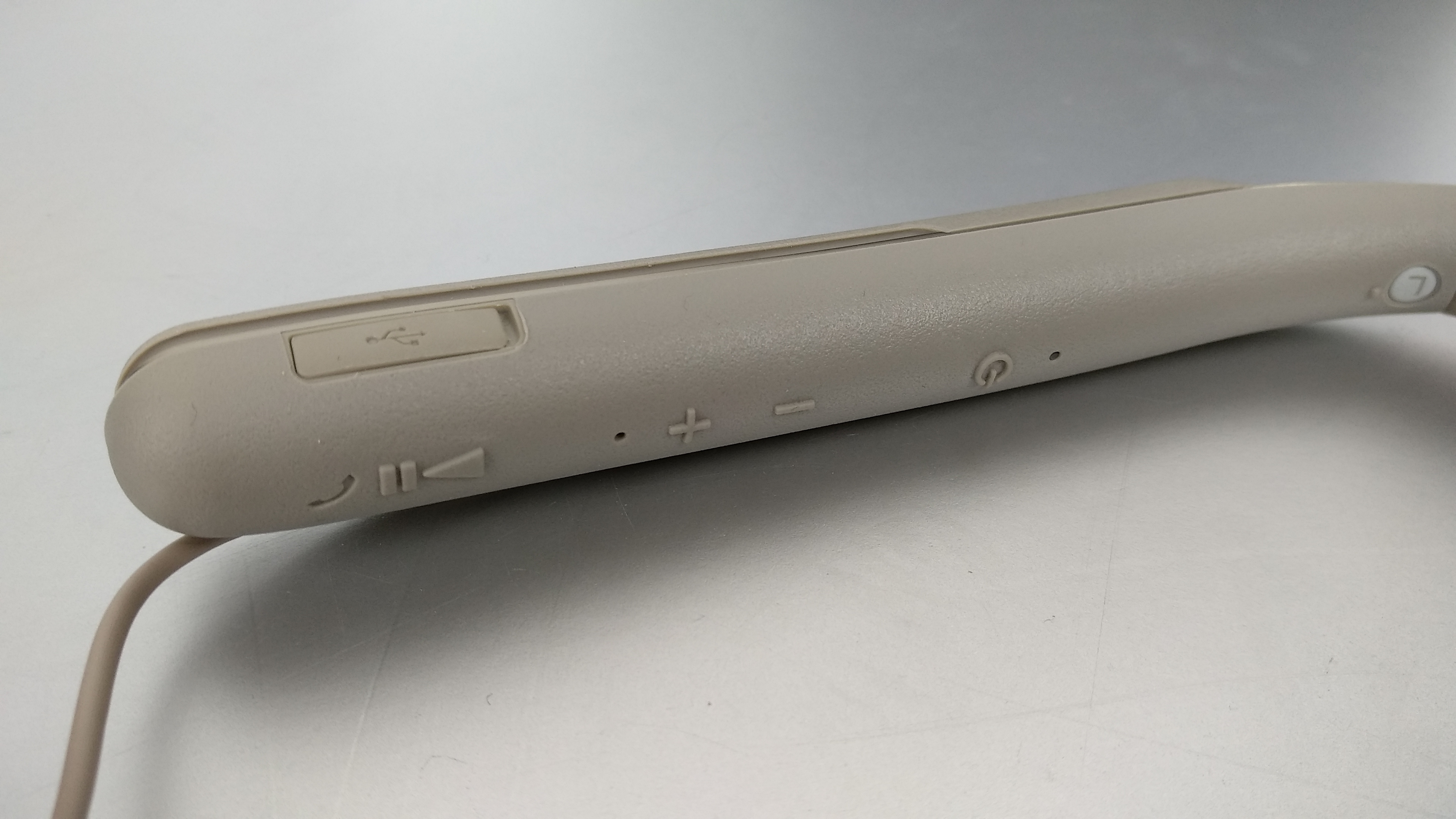 Wie beim kürzlich von uns getesteten Bose Quietcontrol 30 (Testbericht) sitzt auch beim Sony WI-1000X ein Großteil der Technik – vor allem für die aktive Geräuschunterdrückung – in einem Nackenbügel. Den trägt der Nutzer dank gummierter Seitenteile und einem Schaumstoff-Einsatz hinten angenehm um den Hals. Diverse Buttons zur Bedienung befinden sich im linken Teil des Nackenbügels auf der Innenseite, rechts findet sich ein Taster für die aktive Geräuschunterdrückung. Der Micro-USB-Anschluss zum Aufladen hat seinen Platz unten am Nackenbügel links hinter einer Kunststoffabdeckung.