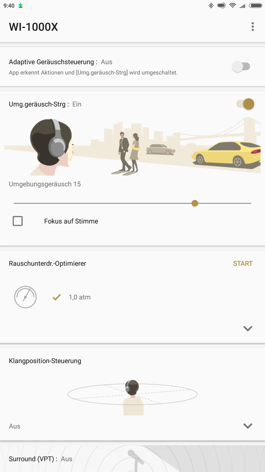 Der Sony WI-1000X verbindet sich mit Abspielgeräten per Bluetooth 4.1. Er unterstützt die Profile und Audioformate A2DP, AVRCP, HFP, HSP, SBC, AAC, LDAC, aptX und aptX HD. Der Frequenzbereich der In-Ears geht von 20 Hz bis 20 KHz. Die Koppelung mit dem Handy erfolgt wie üblich über die Bluetooth-Einstellungen des Smartphones oder per NFC. Auch gibt es eine App, die dem Besitzer beim Verbinden hilft, interessanter ist diese jedoch ob der gebotenen Features. Während sich mit dem entsprechenden Button am Nackenbügel die aktive Geräuschunterdrückung ein und ausschalten lässt, kann der Nutzer dort nur die zuletzt genutzte Umgebungsgeräusche-Einstellung auswählen. Anpassen lässt sich das über die Sony App, in 20 Stufen kann man entscheiden, wie stark Geräusche aus der näheren Umgebung wahrnehmbar sind.