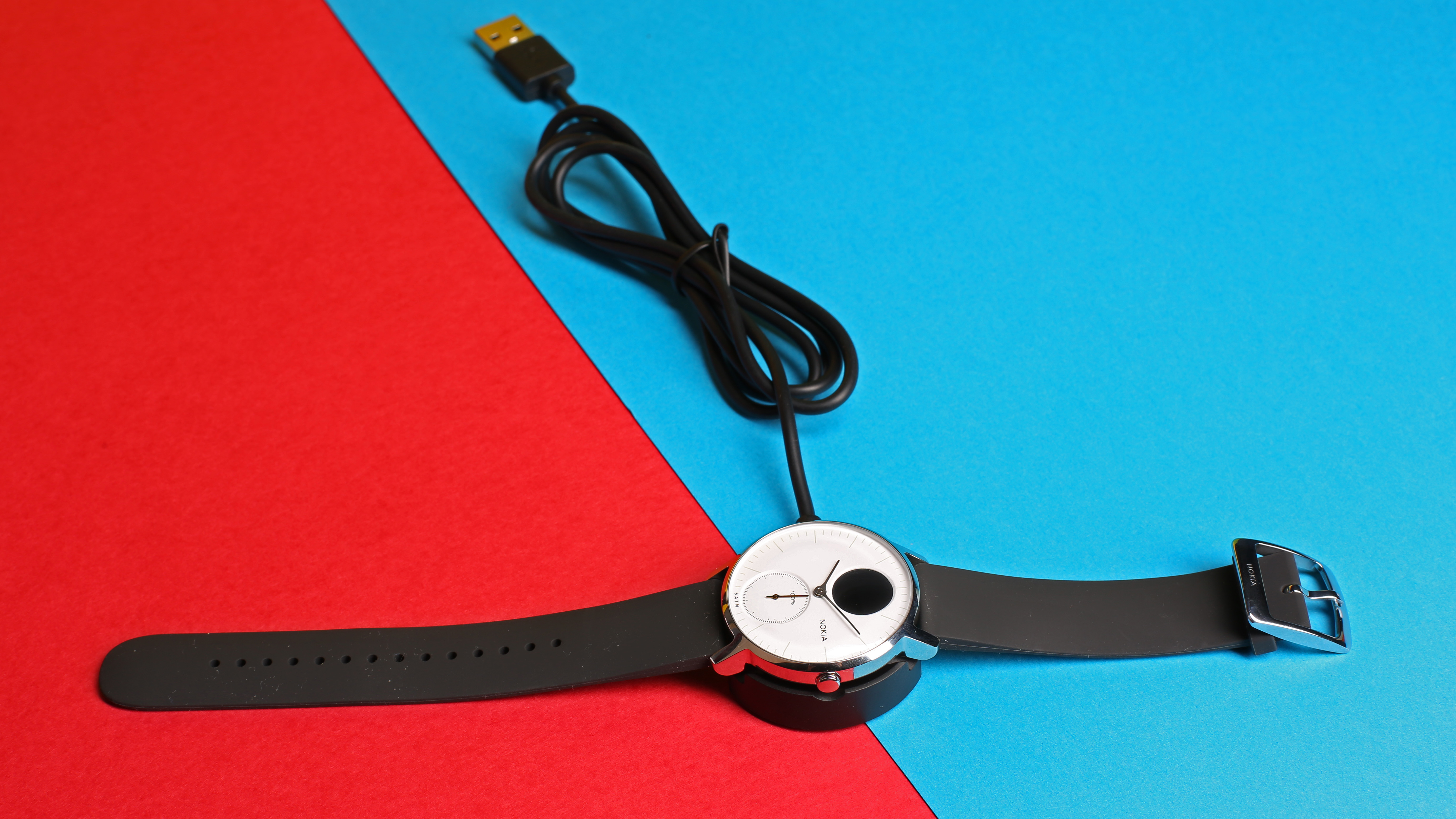 Das Display ist im Normalzustand ausgeschaltet und aktiviert sich erst, wenn ein entsprechender Taster bedient wird oder eine Benachrichtigung eingeht. Helligkeit bestimmen entweder Nutzer manuell per App oder ein Helligkeitssensor automatisch. Das verringert den Stromverbrauch und ermöglicht eine Batterielaufzeit von 20 bis 25 Tagen. Andere Hybrid-Uhren halten zwar deutlich länger durch, verglichen mit Voll-Display-Smartwatches ist dieser Wert aber extrem gut. Im Test hat die Uhr bei sehr intensiver Nutzung etwa drei bis fünf Prozent an Akkukapazität täglich verbraucht. Der angegebene Wert von 25 Tagen erscheint also durchaus realistisch. Zum Laden legt gehört die die Uhr auf die magnetische Ladeschale und steckt diese an einen USB-Port. Das Aufladen dauert mehrere Stunden.