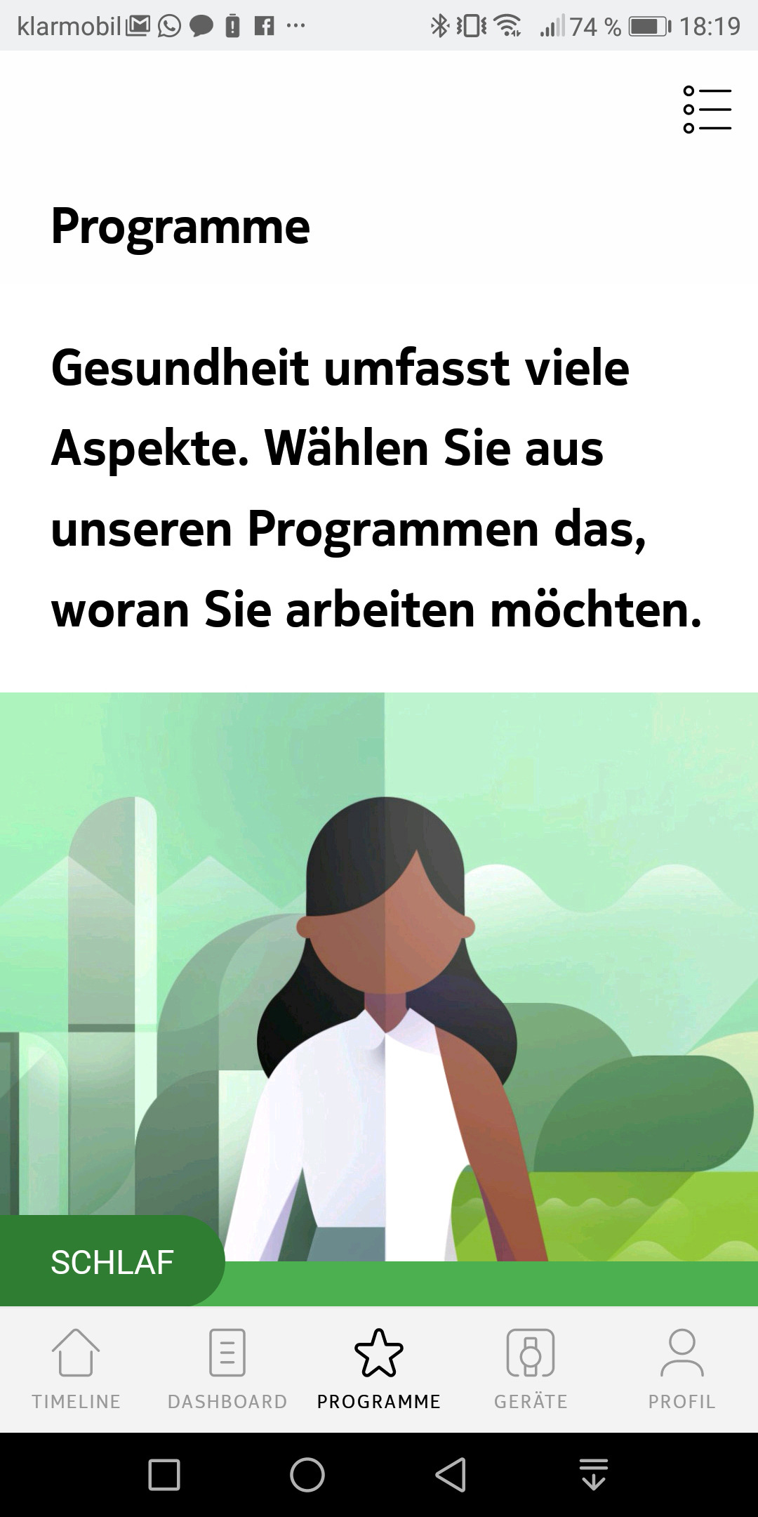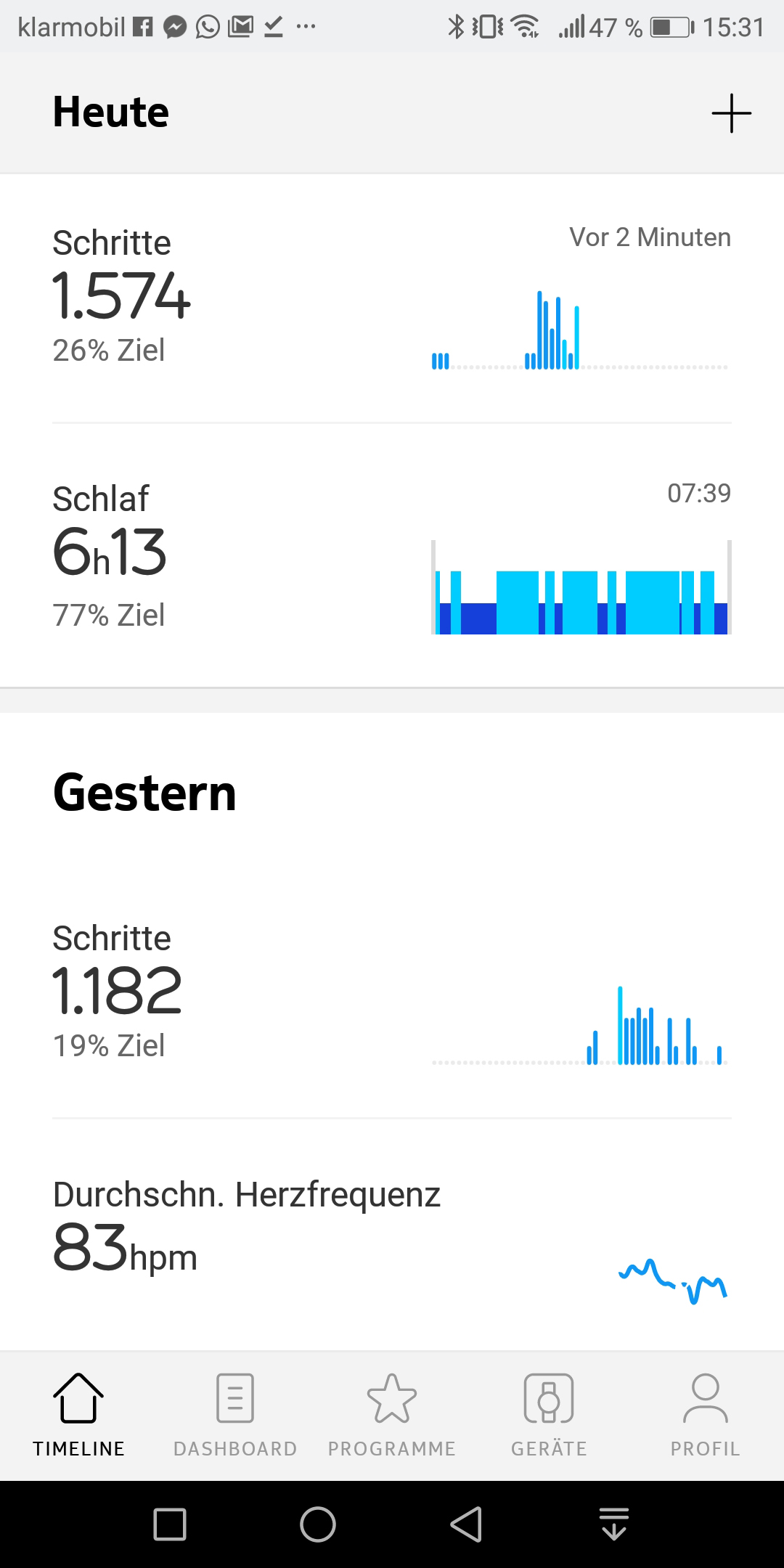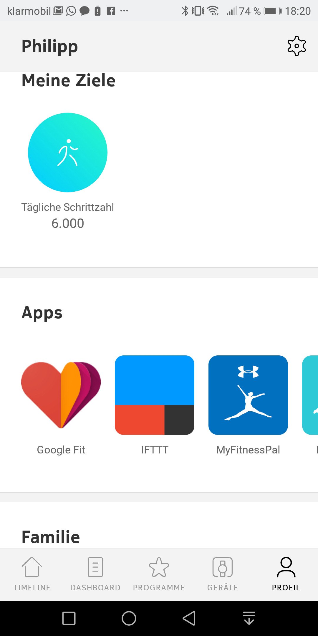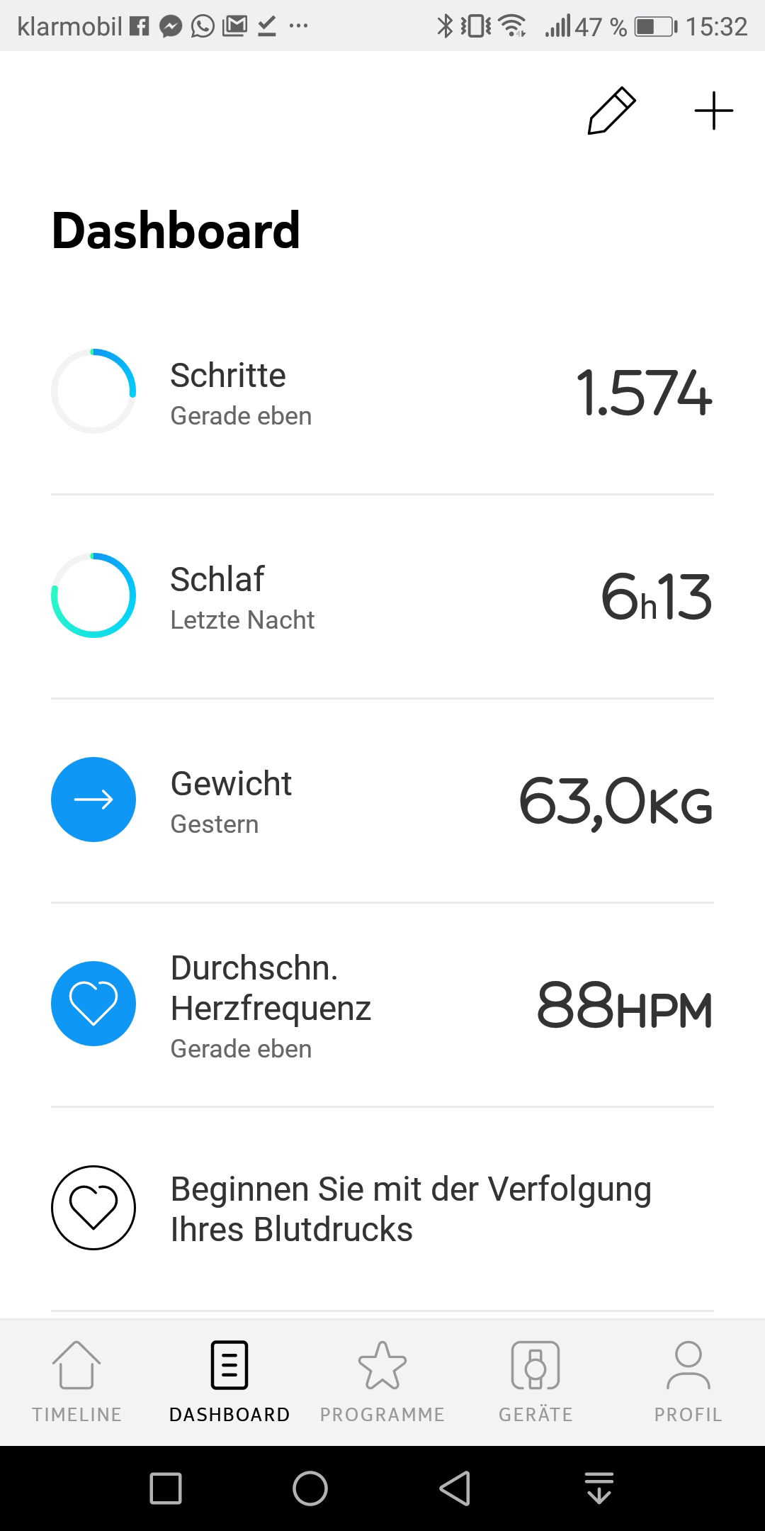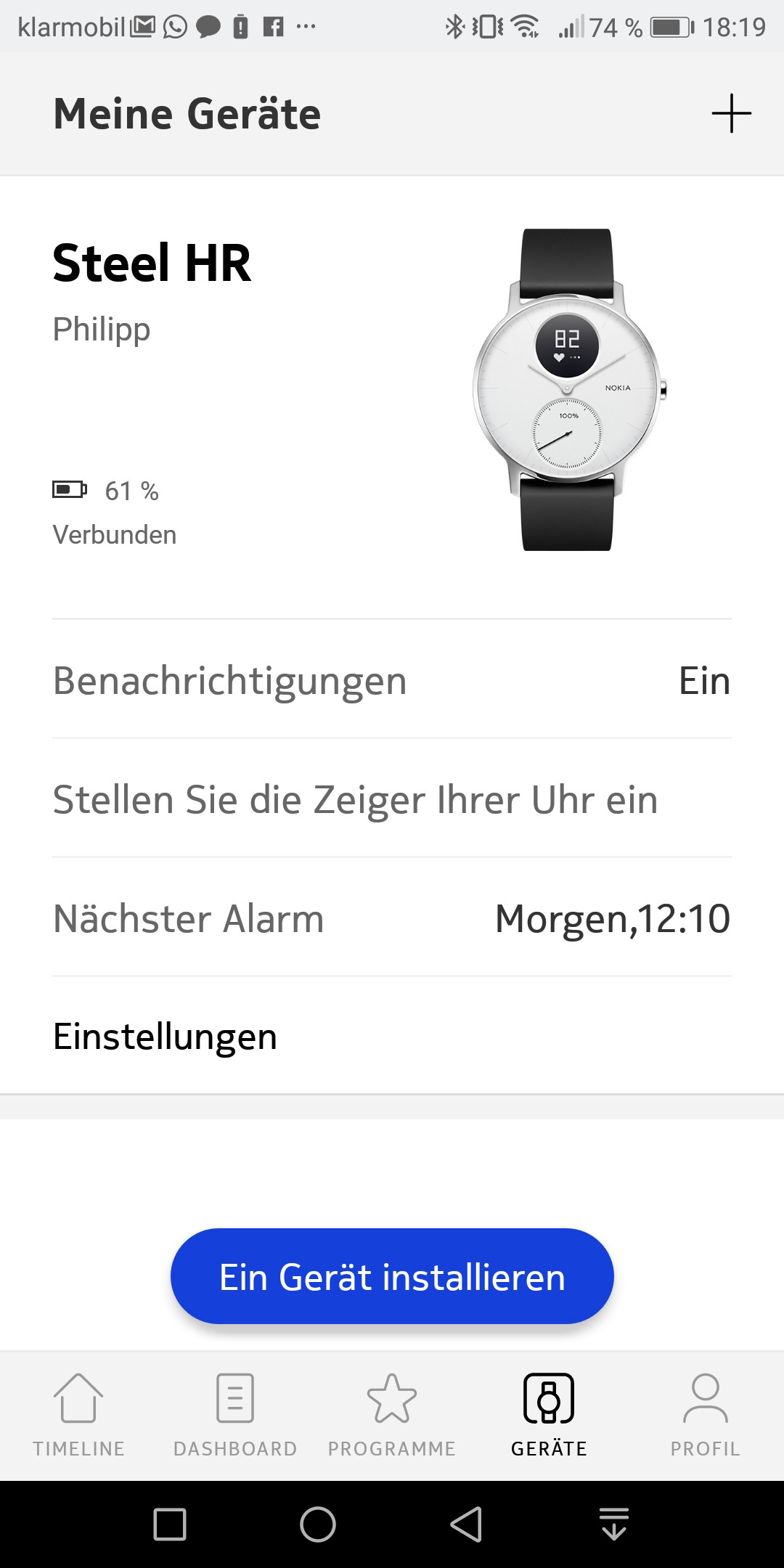 Die App ist in die Unterpunkte Timeline , Dashboard , Programme , Geräte und Profil unterteilt. Unter dem Reiter Timeline sind Schritte, Schlafzeiten oder Herzfrequenzen der letzten Tage, Wochen oder Monate ersichtlich. Das Dashboard gibt einen Überblick über die aktuellen Stand der Aktivitäten und Kennzahlen. Unter dem Punkt Programme finden sich diverse Ratgeber und die Möglichkeit seine Fitnesswerte mit anderen Nutzern teilen und vergleichen zu können. Unter Geräte listet die App auf, welche Nokia-Health-Produkte zusätzlich zur Uhr derzeit mit dem Smartphone verbunden sind. Einstellungen wie Wecker, Display-Helligkeit oder die Benachrichtigungsoptionen sind hier ebenfalls verfügbar. Die Weckfunktion lässt sich auf einzelne Wochentage beschränken. Außerdem ist es möglich, statt einer festen Uhrzeit einen Zeitrahmen für den Vibrationsalarm festzulegen. Dann analysiert die Steel HR die Schlafgewohnheiten und versucht die Weckzeit so zu wählen, dass man sich während des Alarms nicht in einer Tiefschlafphase befindet. Unter Profil finden sich persönliche Daten und diverse Erinnerungsfunktionen. So kann die Steel HR beispielsweise an ins-Bett-Gehen erinnern. Wer andere Apps wie Google Fit, Runkeeper oder ITTT nutzt, kann diese ebenfalls unter Profil verknüpfen. Um sich mit Freunden oder Familienmitgliedern zu messen, lassen sich unter diesem Reiter deren Konten hinterlegen.
