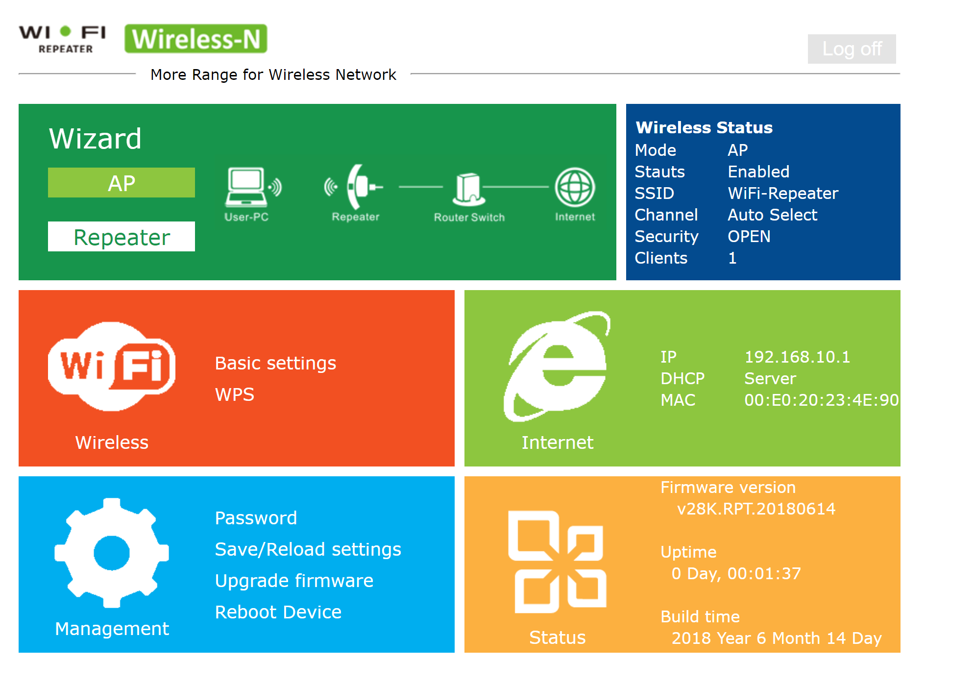 Die Einrichtung läuft einfach ab. An den Strom anschließen, etwas warten und es taucht ein neues, unverschlüsseltes WLAN auf. Damit verbinden und anschließend kommt man über die IP oder die URL myrepeater.net auf die Verwaltungsoberfläche. Die wirkt, freundlich gesagt, etwas Retro. Kein Wunder, denn die Firmware ist von 2018. Und ja, man könnte zwar eine neue Firmware installieren, es gibt aber keinerlei Hinweis, woher man die bekommt.