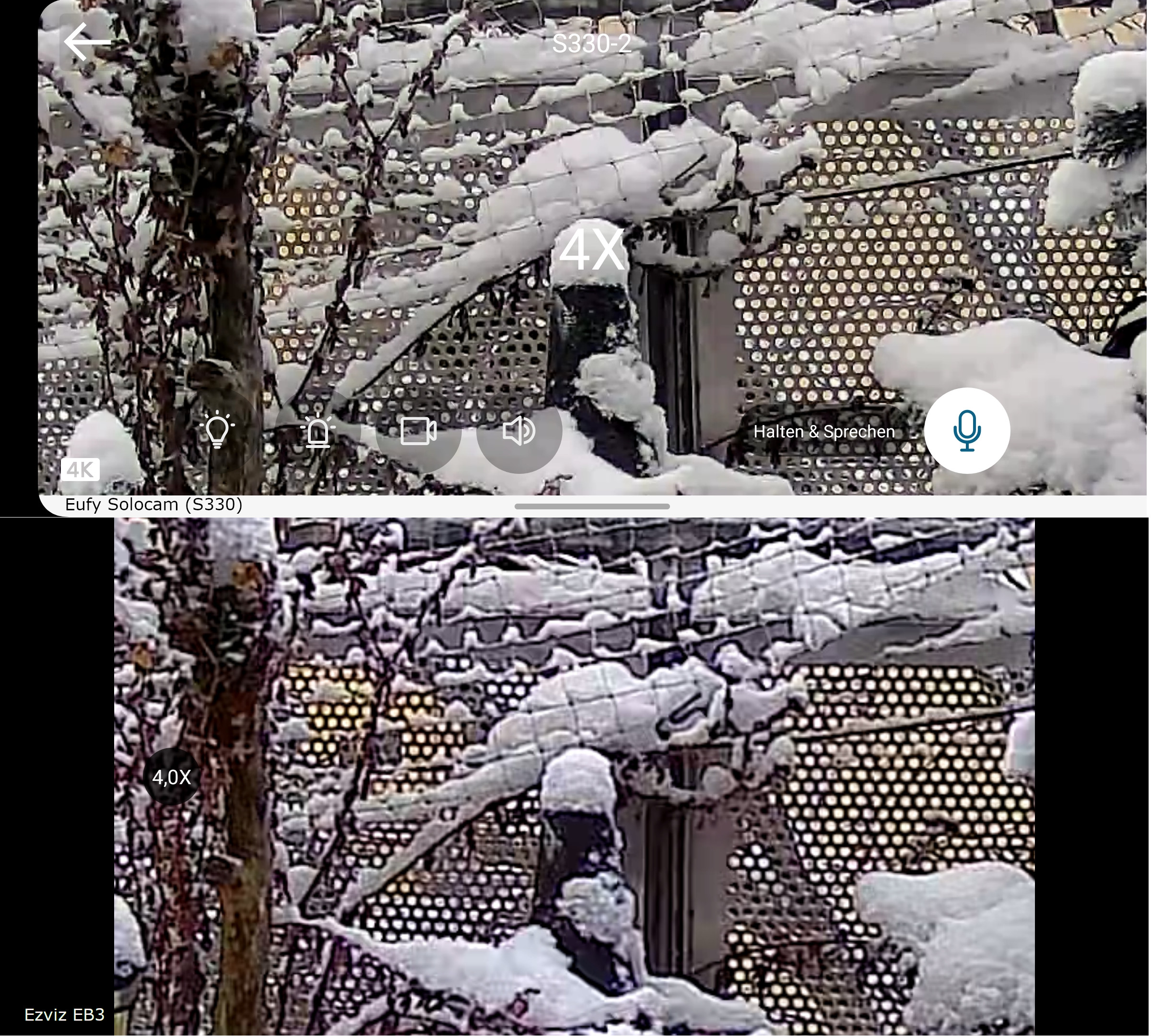 Das Sichtfeld der Ezviz EB3 entspricht mit 110 Grad horizontal und 58 Grad vertikal in etwa dem anderer, vergleichbarer Kameras wie der Eufy Solocam S40 (Testbericht) oder Reolink Argus 3 Pro (Testbericht). Nutzer können mit dem achtfachen Digital-Zoom Objekte näher betrachten. Bis zu einer Zoom-Stufe von etwa vier ist die Bildqualität zufriedenstellend. Bessere Leistungen erzielt in diesem Bereich dank einer höheren Auflösung von 4K die Eufycam 3.
