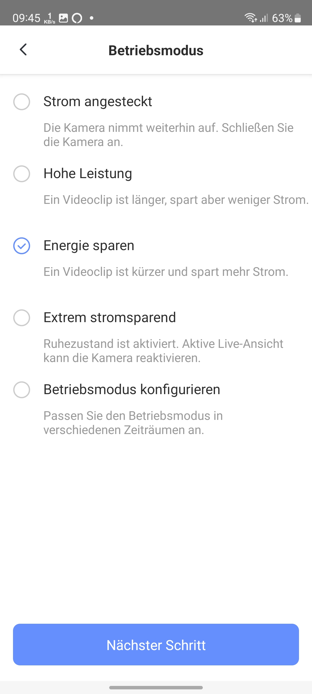 Auf Rückfrage bestätigt Ezviz und nennt Details zu den anderen Modi. Im Leistungsmodus dauert die Videoaufnahme so lange, bis das erkannte Objekt aus dem Sichtfeld der Kamera verschwindet. Bei aktiviertem Energiesparmodus nimmt das Gerät Videos mit einer Dauer von 30 Sekunden auf und pausiert anschließend für zehn Sekunden, bevor es bei einer Bewegungserfassung wieder aufnimmt. Im Modus Extrem Stromsparen verbleibt die Kamera so lange im Ruhezustand bis sie per Live-Ansicht aktiviert wird.