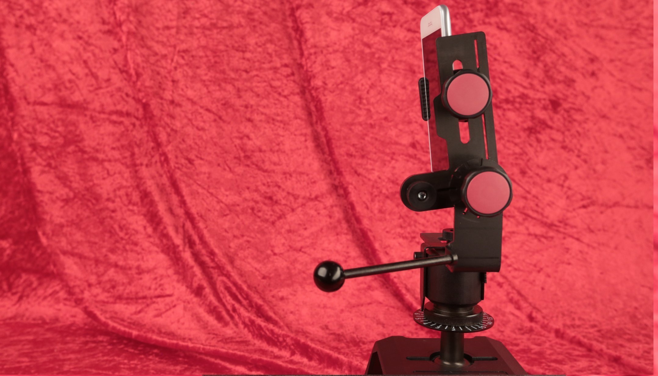 Ist das Handy exakt ausgerichtet, wird das Blech mit dem Fadenkreuz beiseite geklappt. Egal ob wir den Adapter nun um die eigene Achse drehen oder die Kamera nach oben oder unten ausrichten: Das Objektiv sitzt immer genau im Zentrum.