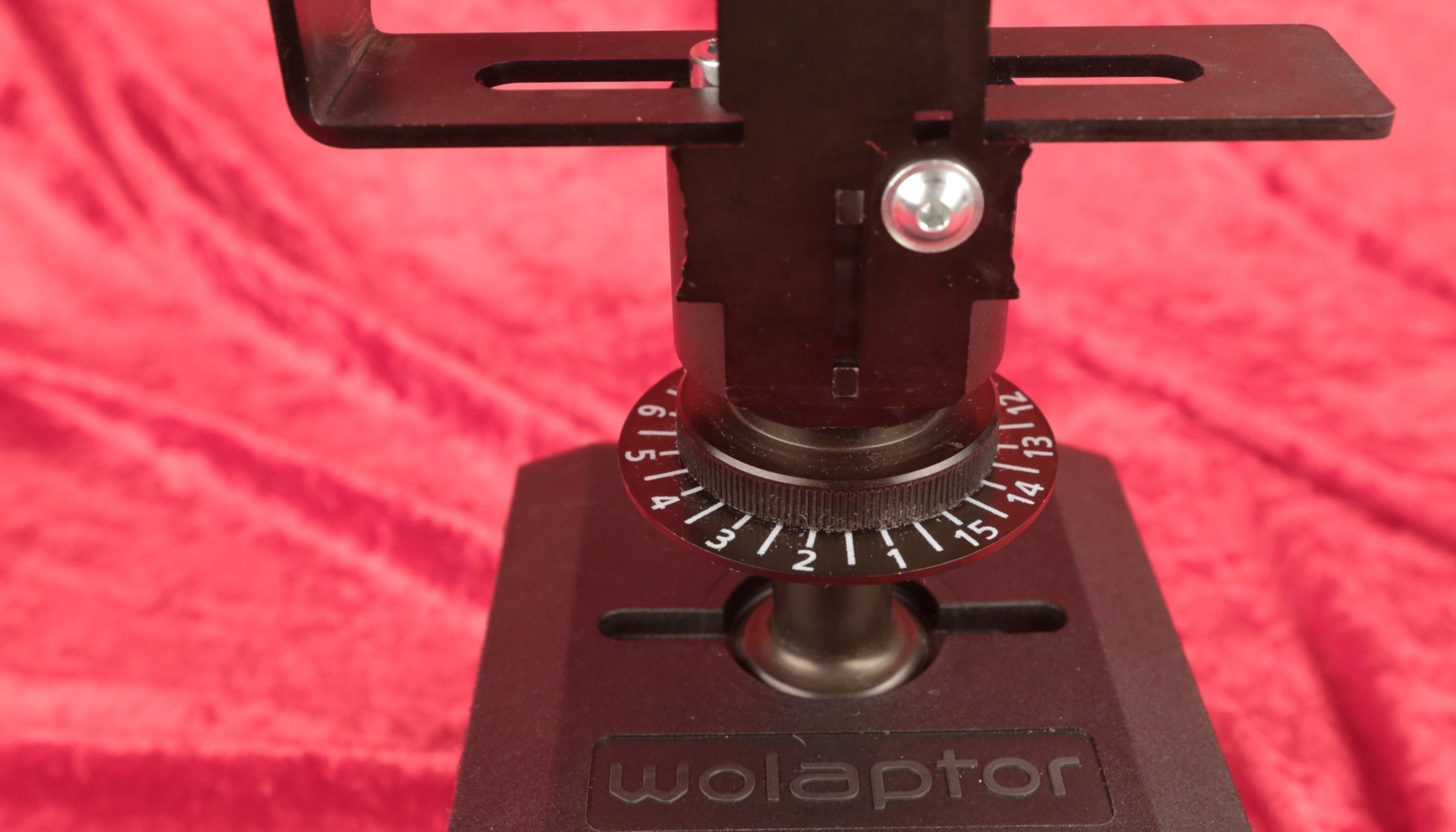 Der Wolaptor sieht auf den ersten Blick kompliziert aus: die Smartphone-Halterung ist auf allen drei Achsen verstellbar und sitzt auf einem drehbaren Grundgerüst mit einer nummerierten Skala. In der Praxis ist die Bedienung aber denkbar einfach. Nach dem Auspacken schrauben wir den Nodalpunktadapter mit nur einer Schraube zusammen und befestigen den Handgriff. Anschließend kommt das Smartphone kopfüber in die dafür vorgesehene Halterung. Die Achsen müssen nun mit den Stellschrauben so eingestellt werden, dass die Kameralinse direkt hinter einer Öffnung mit Fadenkreuz sitzt.