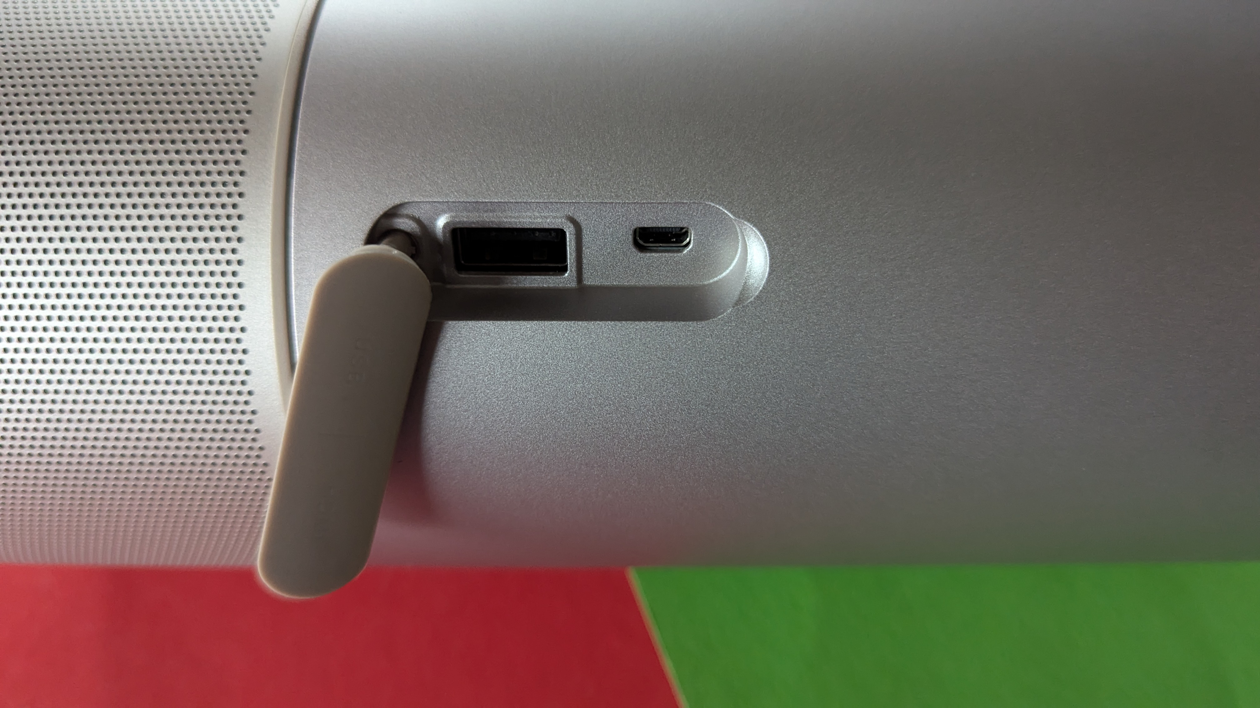 Anders als bei anderen Mini-Beamern wie etwa dem Blitzwolf BW-VT2 Pro Max (Testbericht) müsst ihr beim Xgimi Mogo 3 Pro auf ein Bedienpanel am Gehäuse verzichten. Der Beamer verfügt lediglich über einen USB-C- und einen Micro-HDMI-Port, geschützt von einer Silikonabdeckung. Ansonsten könnt ihr den Mogo 3 Pro ausschließlich über die beiligende Fernbedienung steuern.