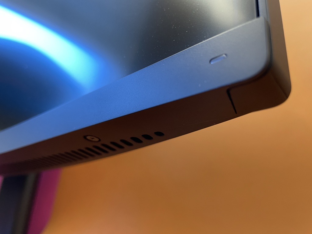 Insgesamt wirkt die Verarbeitung sehr wertig. Mit einem Bildschirmrand von 0,6 cm ist der Monitor nicht breiter, als er sein muss. Der dezent schwarze Kunststoff in Brushed-Optik wirkt robust und beim Bewegen gibt das Gerät keine verdächtigen, knarzenden Laute von sich. Nur die Knöpfe für das Menü auf der Rückseite fühlen sich für unseren Geschmack etwas zu weich an: Legt man seine Fingerkuppe auf und rotiert diese etwas, bewegen sich die Knöpfe leicht mit. Sie machen zudem ein lautes, klickendes Plastikgeräusch, wenn man sie betätigt. Haptisch machen sie also nicht so einen guten Eindruck, aber sie sind immerhin groß genug und liegen so weit auseinander, dass eine blinde Bedienung kein Problem ist. Man kann bei der Navigation durch das Menü seinen Handballen (und den Daumen) an den Rand des Bildschirms legen und mit den übrigen vier Fingern agieren, als bediene man ein Saiteninstrument. Zwischen jedem Knopf ist ein Abstand von ca. 0,5 cm, womit das auch mit durchschnittlich großen Händen möglich ist.