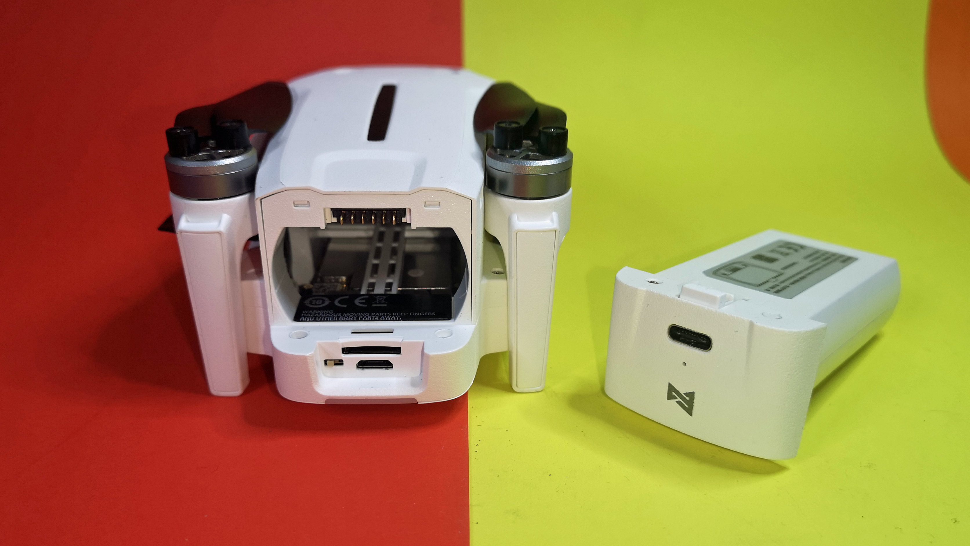 Der Lithium-Ion-Akku hat eine Nennkapazität von 2200 mAh und eine Nennspannung von 7,7 V. Unter Realbedingungen – mit böigem Wind und einigen sportlichen Manövern – erreichen wir gute 25 Minuten Flugzeit, bevor wir mit einer Restkapazität von knapp zehn Prozent landen. Das sind nur etwa 2 bis 4 Minuten weniger als die Mavic Mini und insgesamt ein sehr ordentliches Ergebnis. Der Zustand des Akkus wird während des gesamten Fluges ständig überwacht und mittels App am Smartphone angezeigt. Zum Laden brauchen die Akkus weder ein Ladegerät, noch müssen sie in der Drohne eingesetzt sein. Das Laden per USB-C-Schnittstelle gefällt uns ausgezeichnet und erspart zusätzliches Equipment.