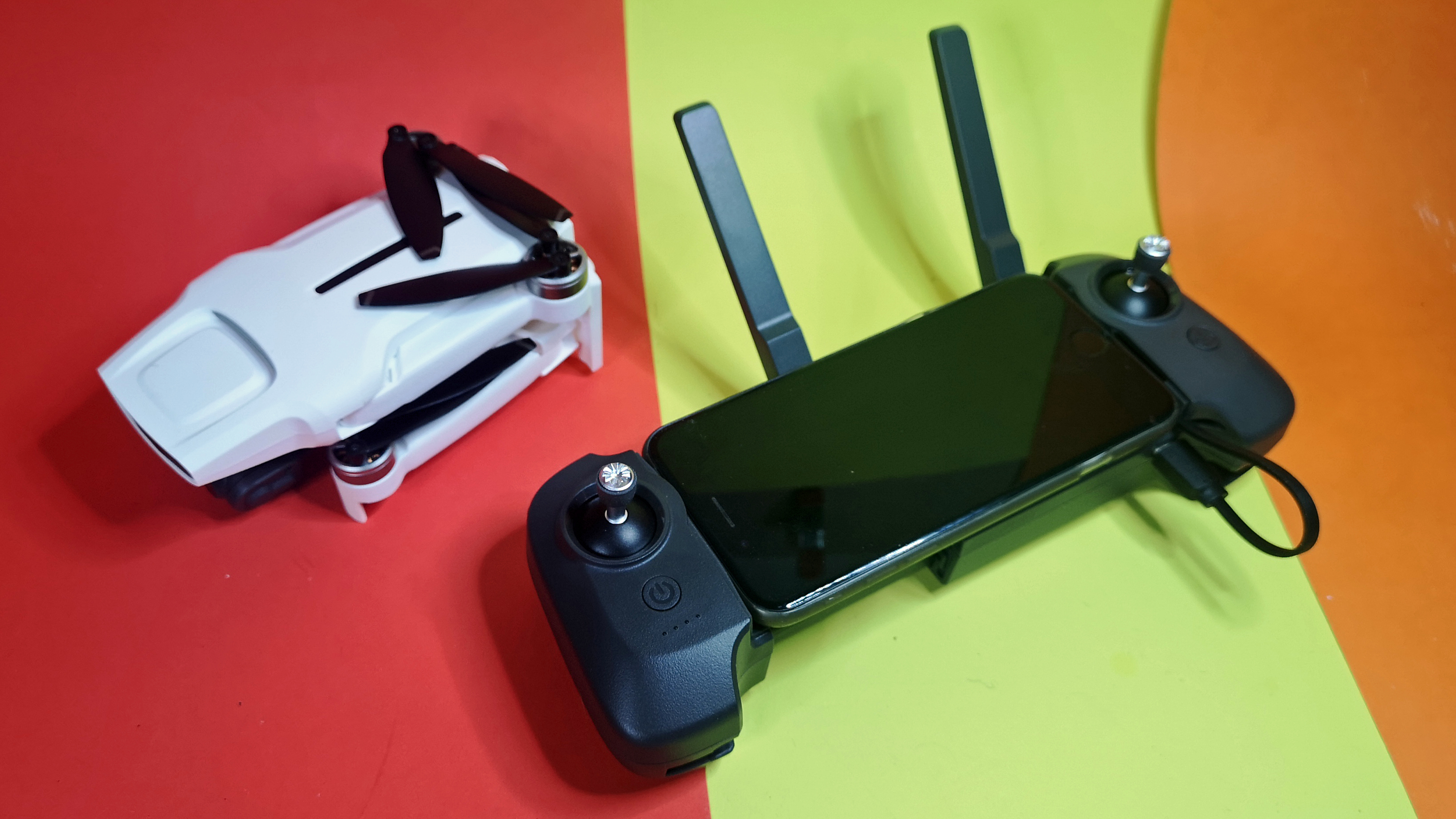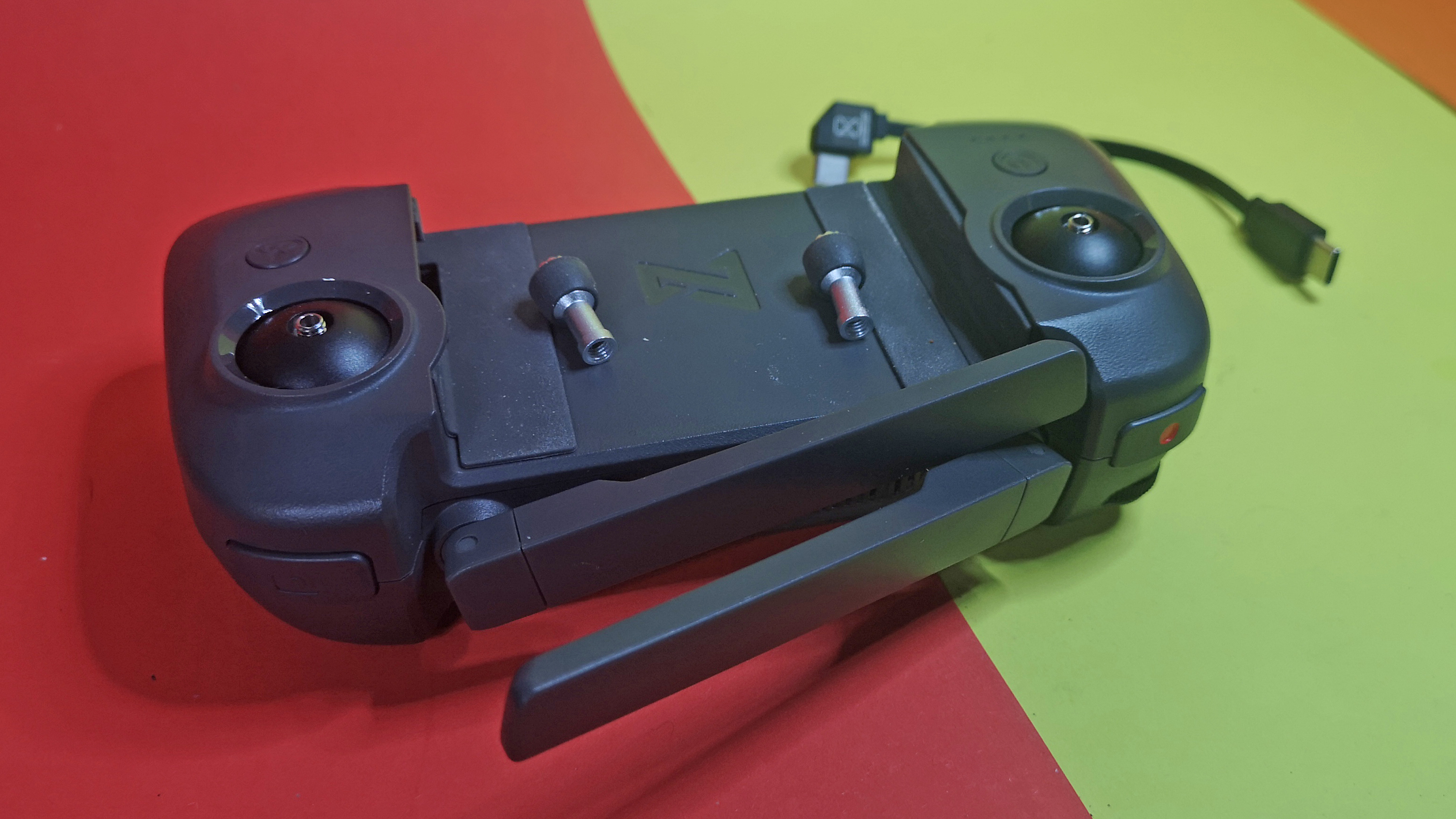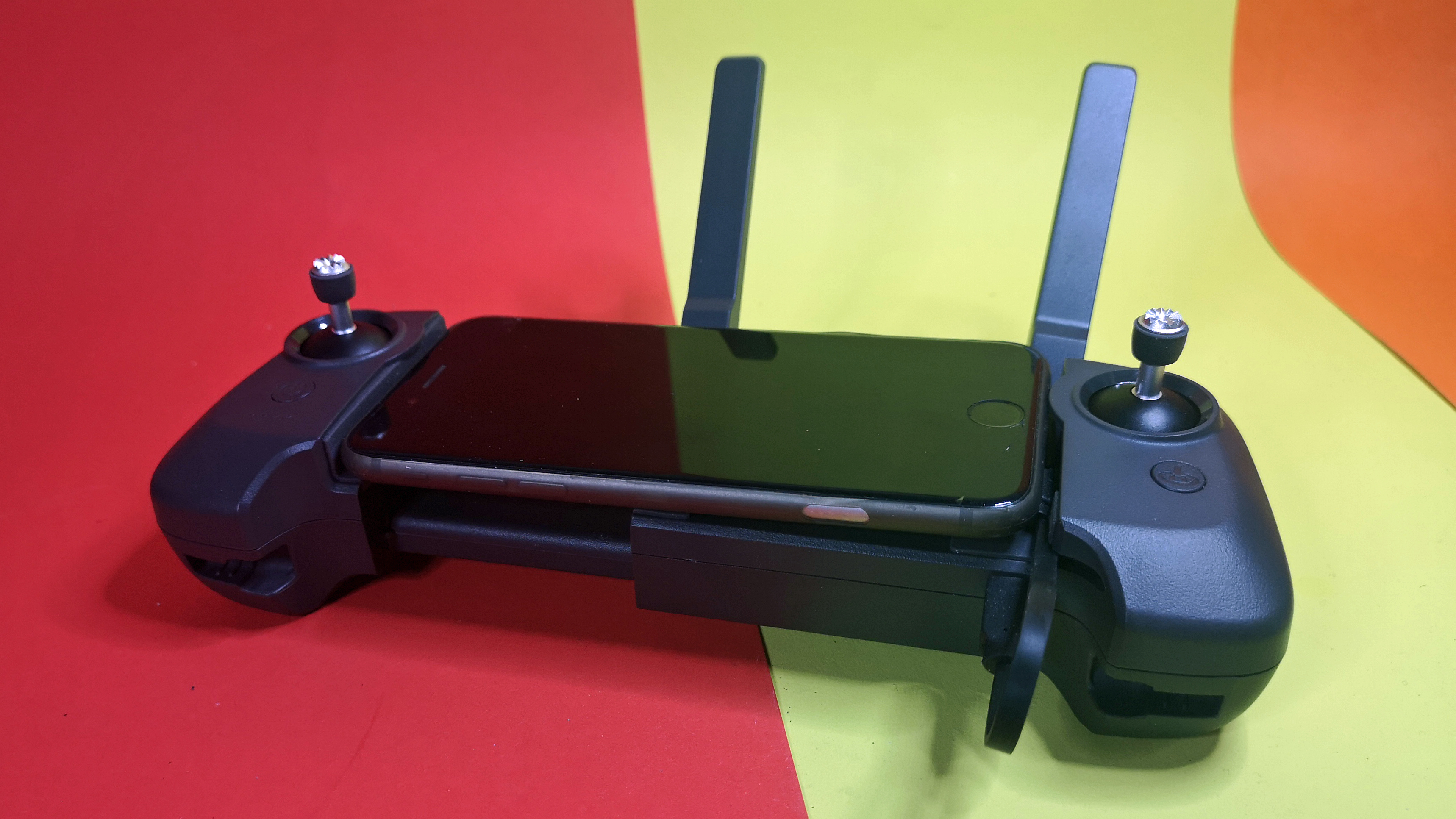 Der Handsender von Fimi wirkt immerhin eigenständig. Der kompakte Sender verfügt über zwei einklappbare Antennen und einige Direktzugriff-Tasten für Foto- und Videoaufnahmen und den die automatische Rückkehrfunktion. Zum Ändern des Kamerawinkels dient ein kleines Rad an der linken Oberkante des Senders. Das Smartphone (Android und iOS) zur Überwachung des Kamerabildes und für Einstellungen während des Fluges, sitzt eingeklemmt in der Mitte der Fernsteuerung und ist per USB-Kabel verbunden. Alle wichtigen Flugdaten und das Livebild sind so jederzeit bequem ersichtlich. Die Fernsteuerung liegt gut in der Hand und bietet im ausgeklappten Zustand genügend Platz für das im Test verwendete Huawei P20 Pro mit 6,1 Zoll (15,49 cm) großem Display. Sehr viel größer sollte das Telefon dann aber auch nicht sein. Die beiden Steuers-Sticks sind wie auch bei DJI angeschraubt und lassen sich zum Transport in einer kleinen Aussparung des Senders verstauen.