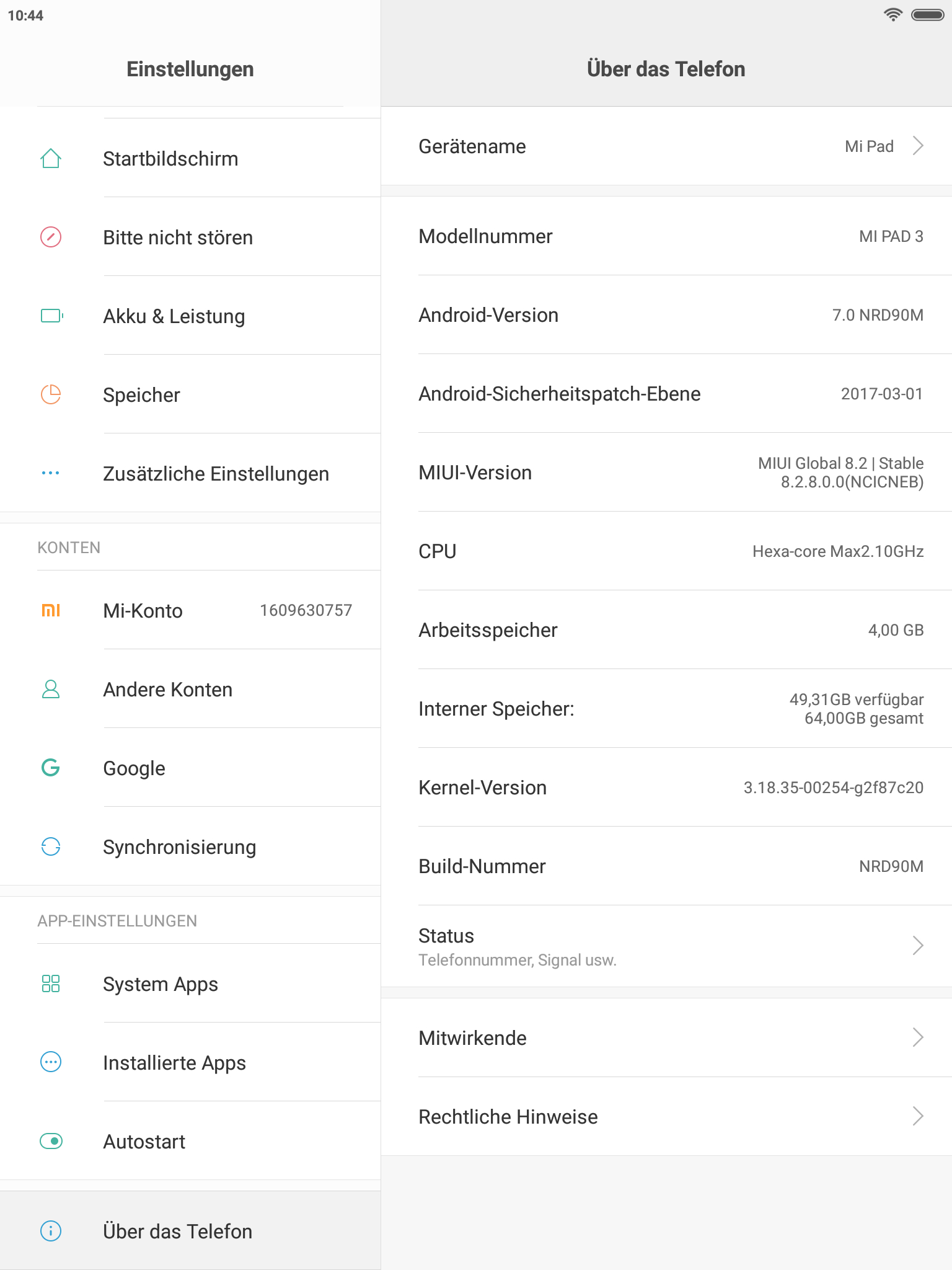 Auf dem Mi Pad 3 läuft Android 7.0 in Form von Xiaomis MIUI in Version 8.2. Beim Kauf muss man darauf achten, dass auf dem Gerät die Global Version installiert ist, sonst gibt es keinen Play Store und keine deutsche Sprachoption. Davon abgesehen ist MIUI 8 nicht nur optisch Geschmackssache: Von Android 7 ohne größere Anpassungen vom Hersteller ist auf dem Mi Pad 3 nicht mehr viel zu erkennen. Xiaomi kocht ein ganz eigenes Süppchen und integriert diverse selbst entwickelte Features, entfernt aber auch einige normalerweise verfügbare Optionen. Den Split-Screen-Modus, wie man ihn eigentlich von Android Nougat kennt, gibt es auf dem Mi Pad 3 beispielsweise gar nicht.
