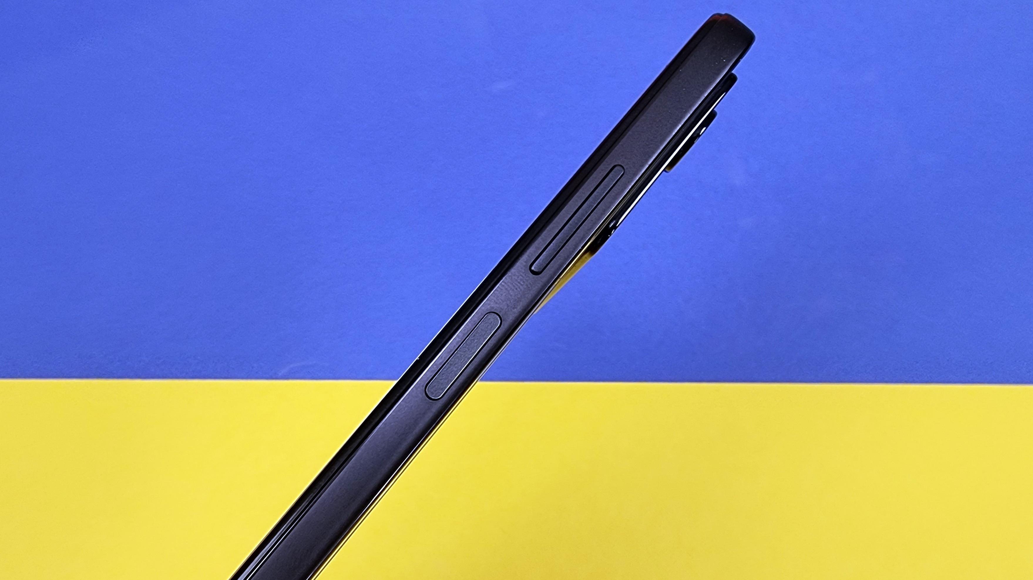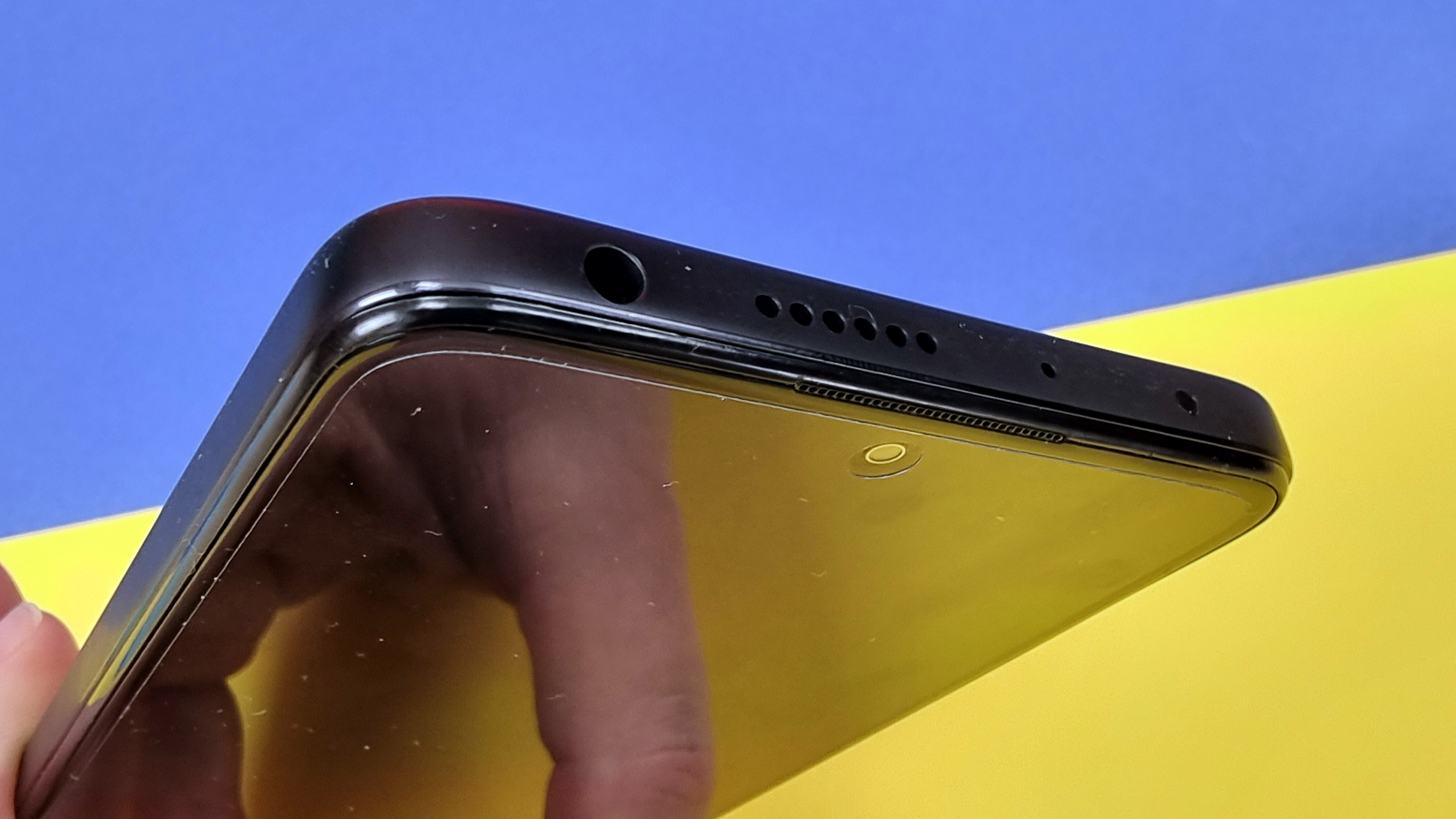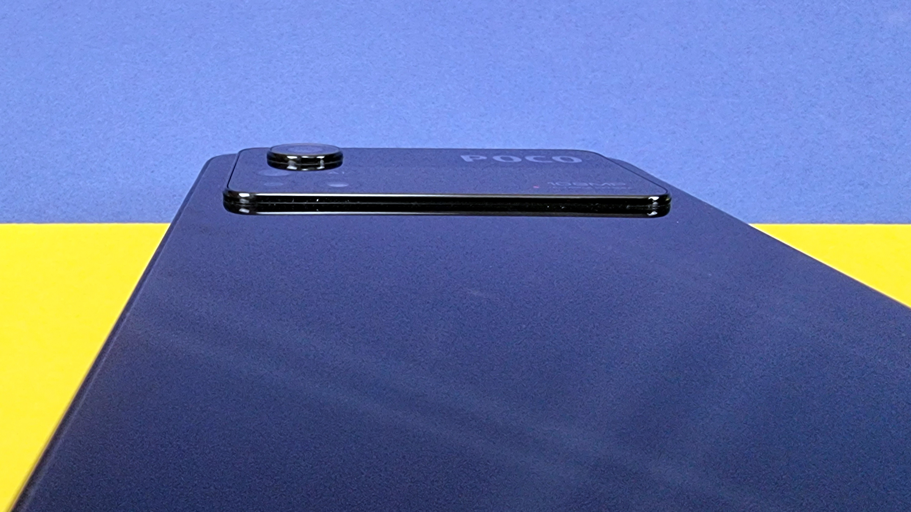 Die Rückseite besteht aus Glas und wird von einer riesigen Kameraeinheit dominiert, die fast den kompletten oberen Bereich einnimmt und etwa 1,5 Millimeter aus dem Gehäuse vorsteht. Sie beinhaltet diverse Linsen und silberne Schriftzüge. Die Hauptlinse steht noch einmal rund 1,5 Millimeter vor, das ist schon sehr dominant. Die Glasoberfläche zieht Fingerabdrücke stark an. Wenn sie sauber ist, zeigt sie aber sehr schicke Lichtreflexe, die wie Laserstrahlen über die Rückseite wandern. Vorn profitiert das Smartphone von recht schmalen Rahmen rings um den großen Screen, der mittig oben ein Punchhole für die Frontkamera aufweist. Unten ist der Rahmen am breitesten, insgesamt wirkt das aber alles ziemlich hochwertig. Den klotzigen Eindruck kann aber auch die moderne Front nicht wettmachen. Selbst die gute Verarbeitung kann uns nicht über das extrovertierte „Poco-Design“ hinwegtrösten, immerhin gibt es eine IP53-Zertifizierung.